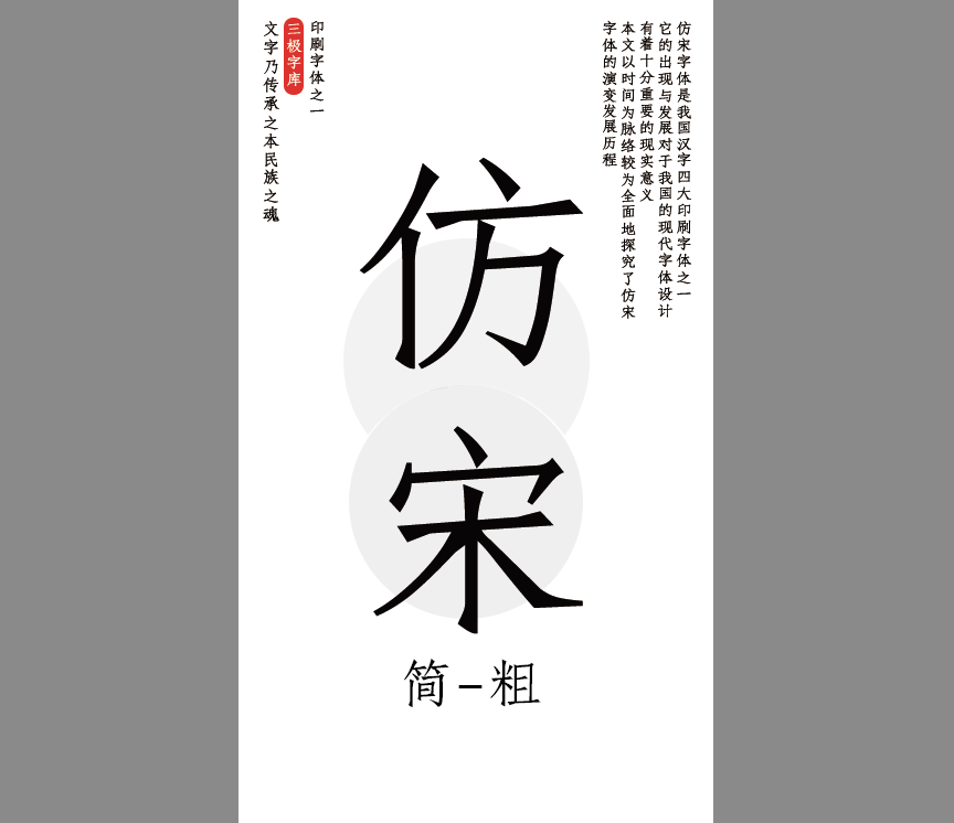 三极仿宋简源于铅字时代的字稿,其字形略宽,方正平稳。笔画硬度明显,横竖笔画等粗,起笔、折笔处棱角分明,整体字形挺拔赋有刀刻痕迹。风格,朴素坚实,非常适用于杂志、书籍、宣传册的正文排版。
