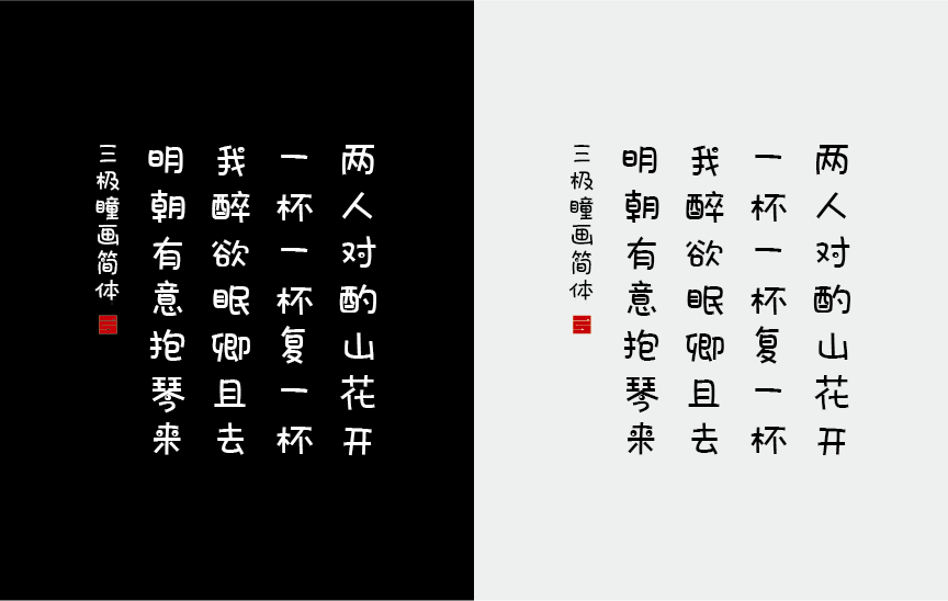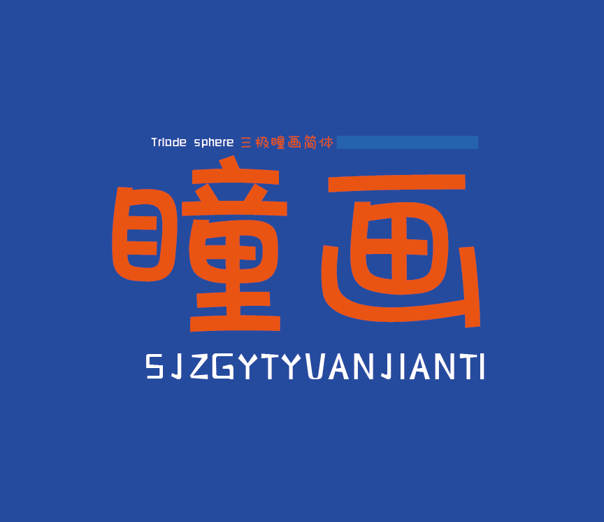 三极瞳画简体,运用童趣思维设计,字形结构轻松随性,笔画弧度弯曲放缓,轮廓饱满拙趣,明快可爱。适用于童真、趣味、亲和主题设计中,能够提升画面的可爱感。