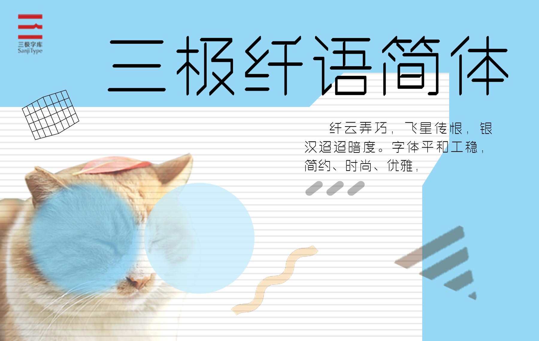 三极纤语简体,笔画中略微带有粗细变化,且横粗竖细,撇捺、转折较为硬朗,重心偏下,结构平和工整。适用于杂志、书籍、广告、标志、宣传册、包装、影视、动漫等设计用字。