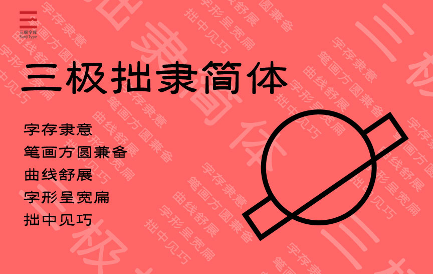 三极拙隶简体,字存隶意,笔画方圆兼备,曲线舒展,字形呈宽扁,拙中见巧。