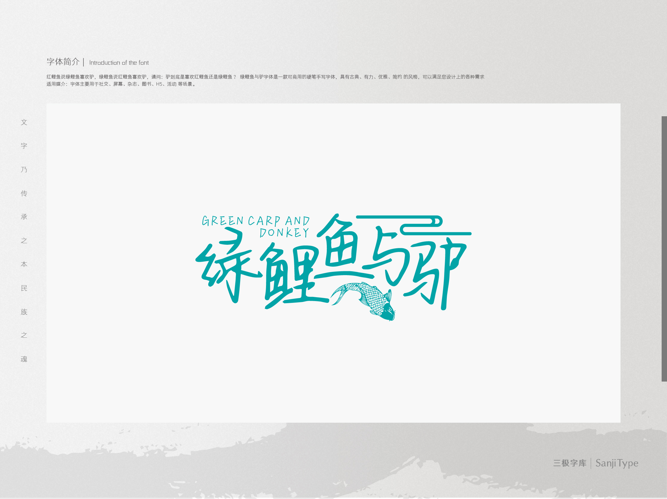 绿鲤鱼与驴是一款文艺优美、笔触细腻的硬笔字体。字面较小,撇捺伸展,竖笔借助手腕力道写出流畅劲道之感。十分适用于标题文字、海报主视觉、书籍装帧等设计场景。