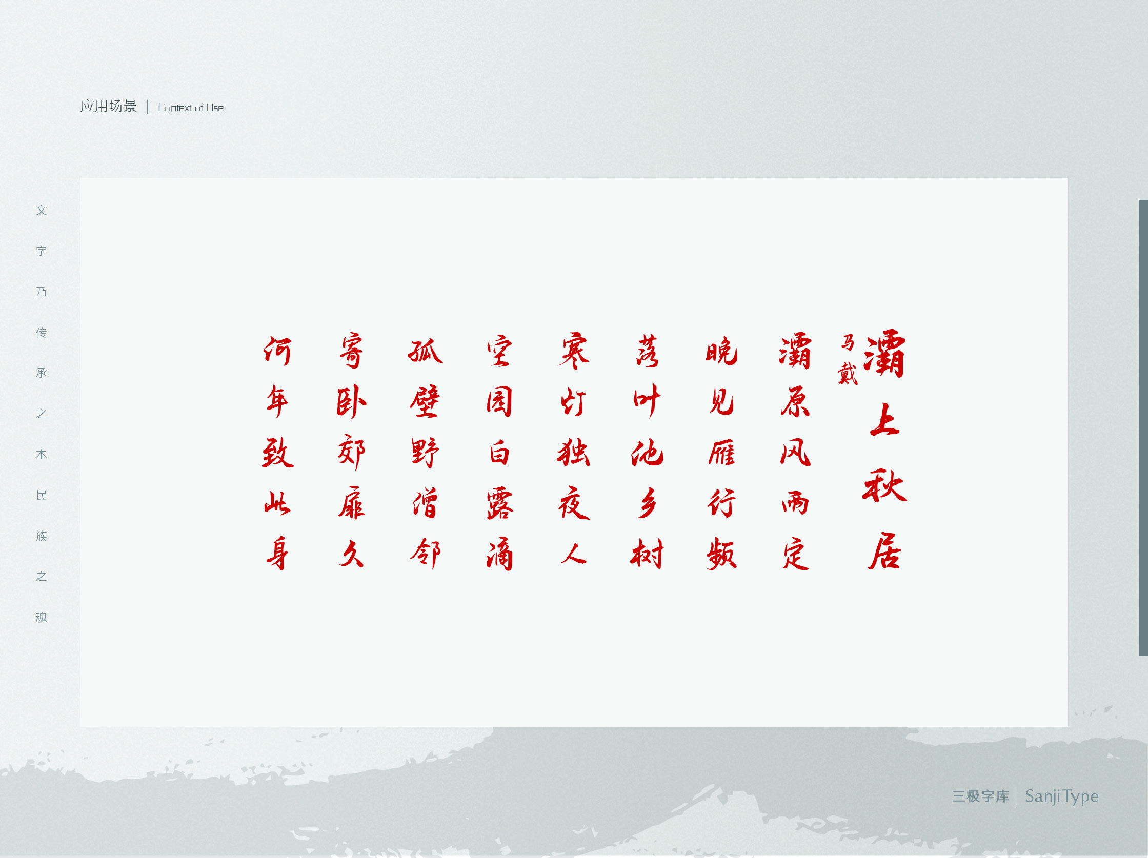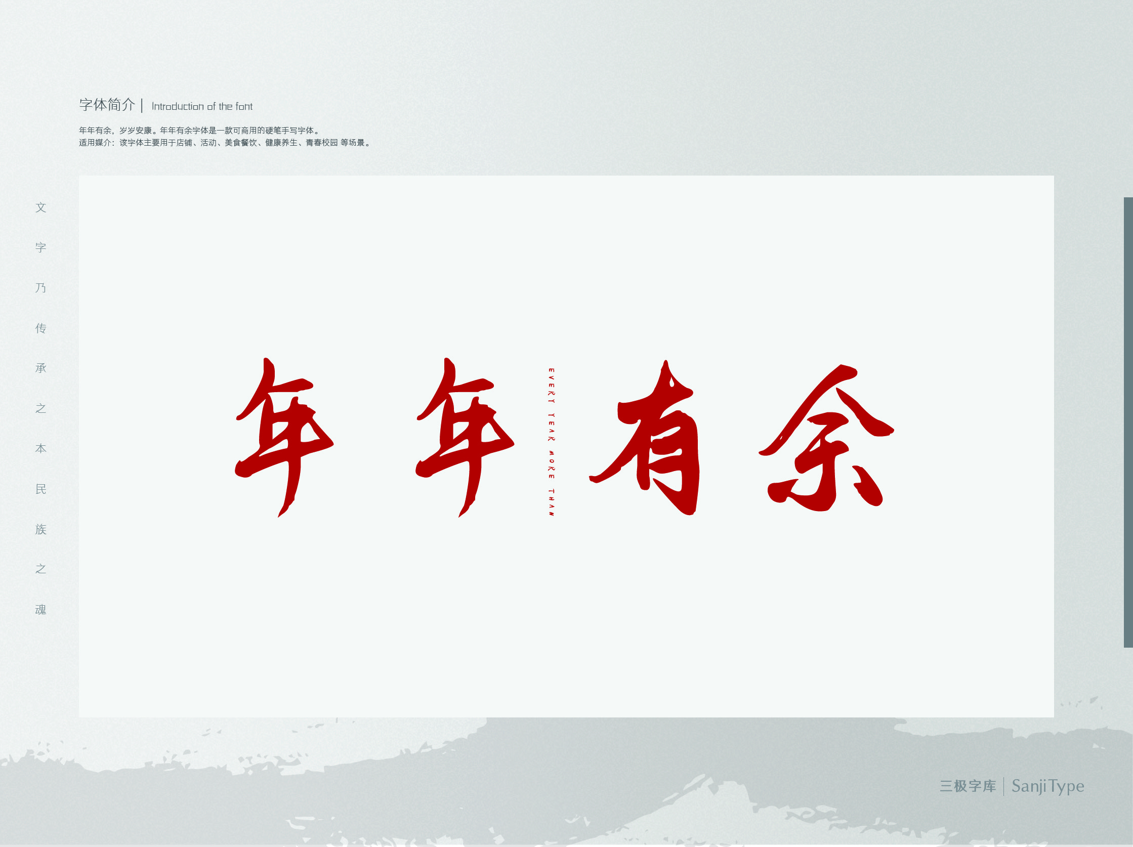 年年有余是一款书法韵味浓郁,精致利落的手写字体。笔画造型中透露出作者深厚的书法功底,整体自带中国风,适用于适用于古典、国潮主题的书刊、品牌广告和产品包装设计,以及社交网络的个性化用字。