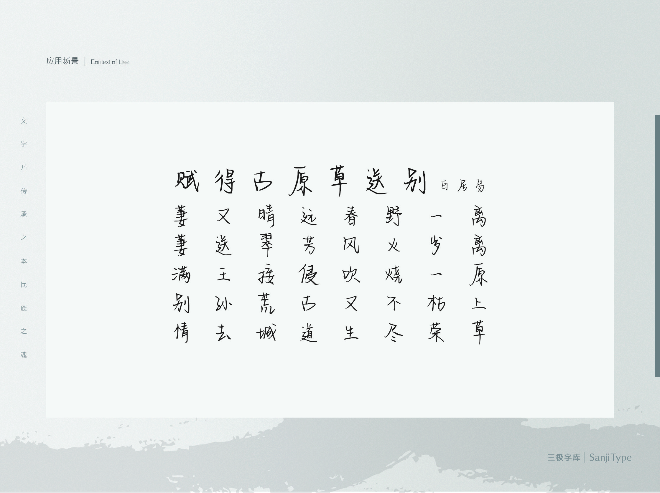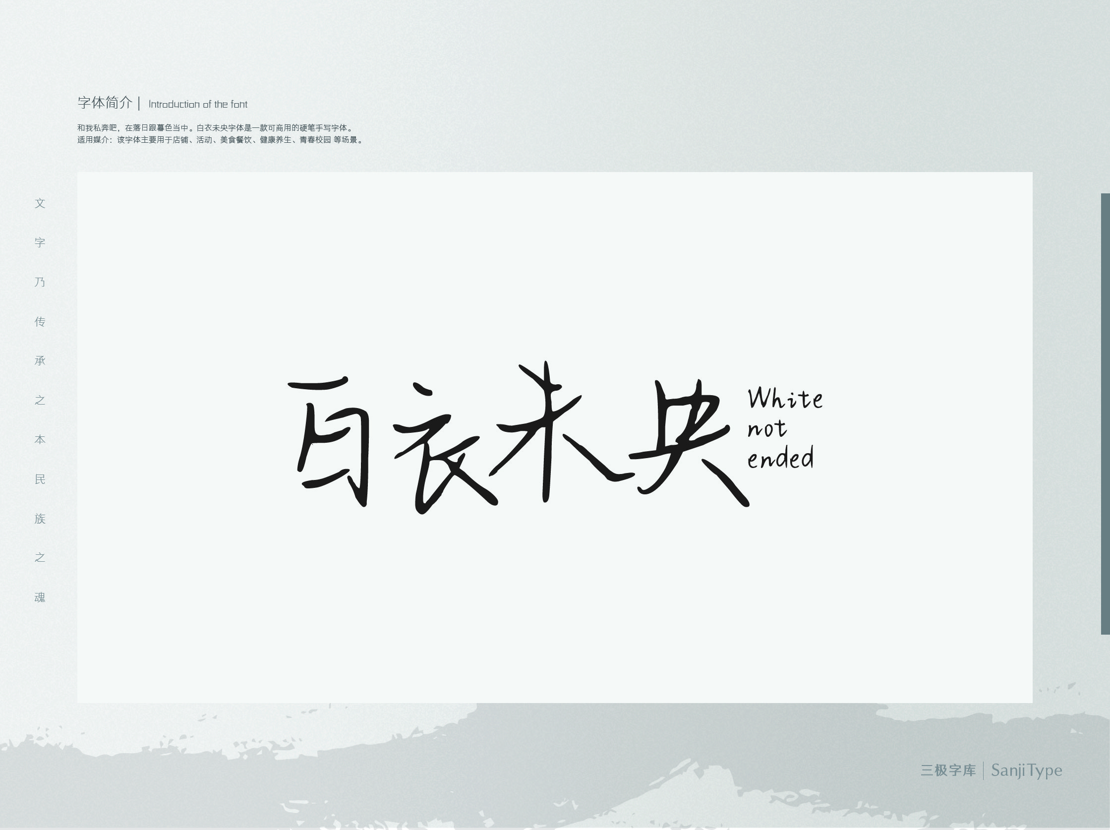 白衣未央是一款文艺优美、笔触细腻的硬笔字体。字面较小,撇捺伸展,竖笔借助手腕力道写出流畅劲道之感。十分适用于标题文字、海报主视觉、书籍装帧等设计场景。