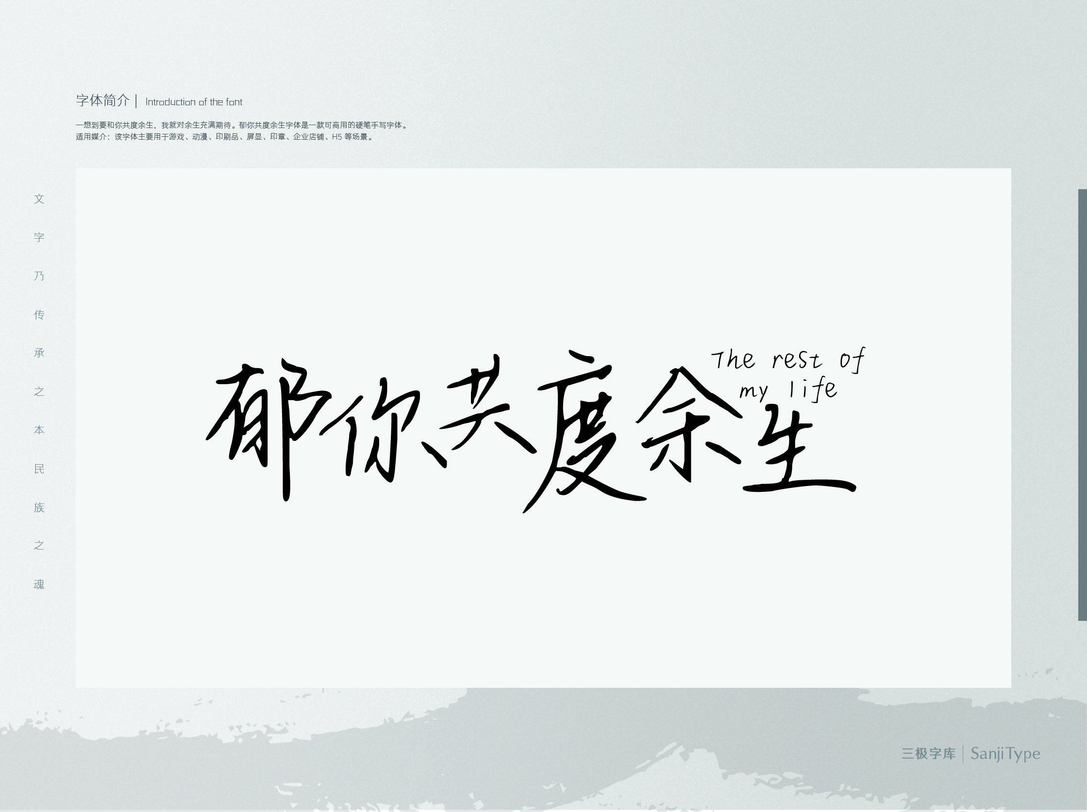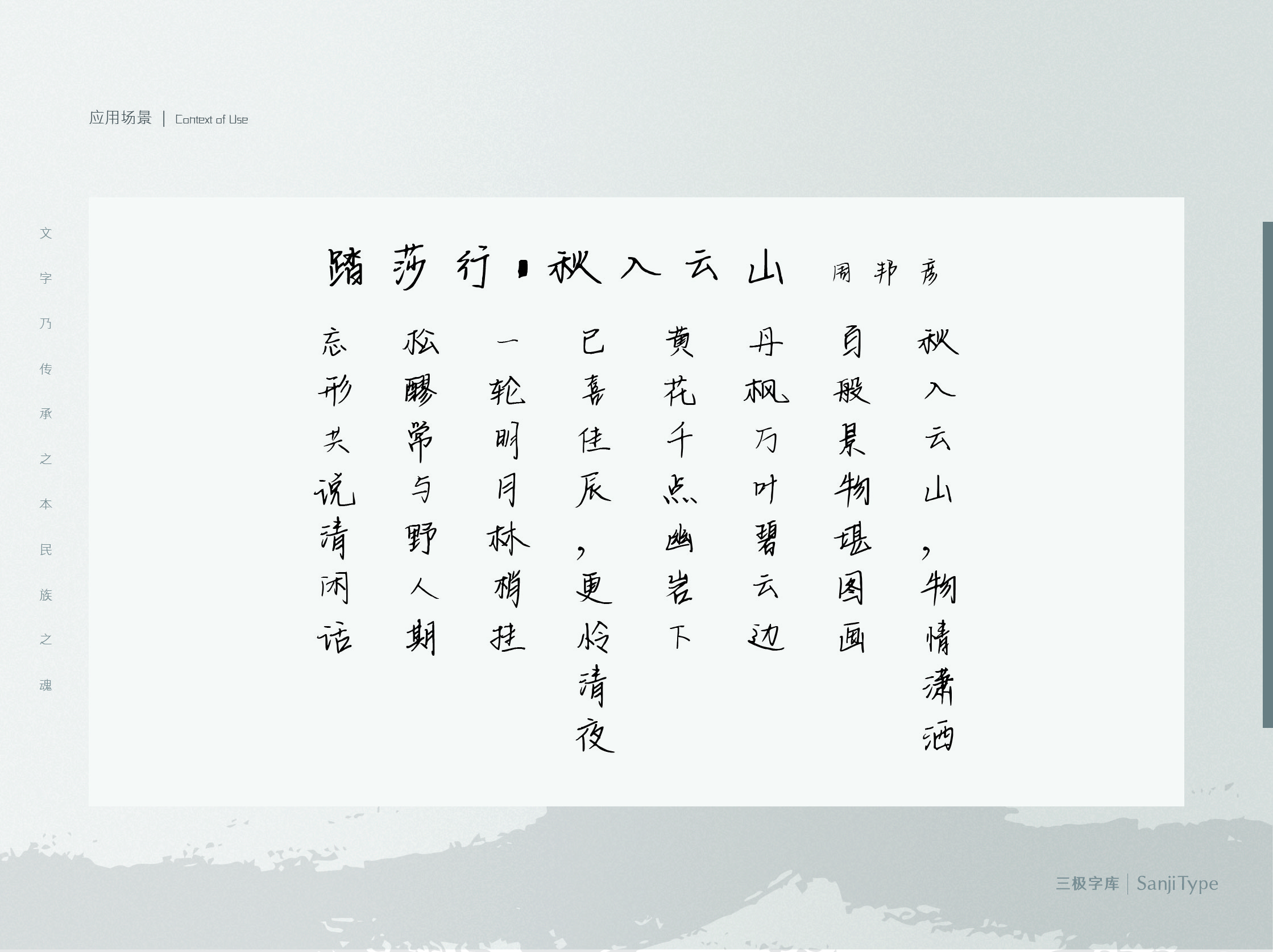 结字清晰,撇捺伸展、短横笔具有上扬气势,透出一种阳光积极的气息。适用于春夏季主题、现代诗歌短文的排版以及文化、商业类品牌的广告语设计。