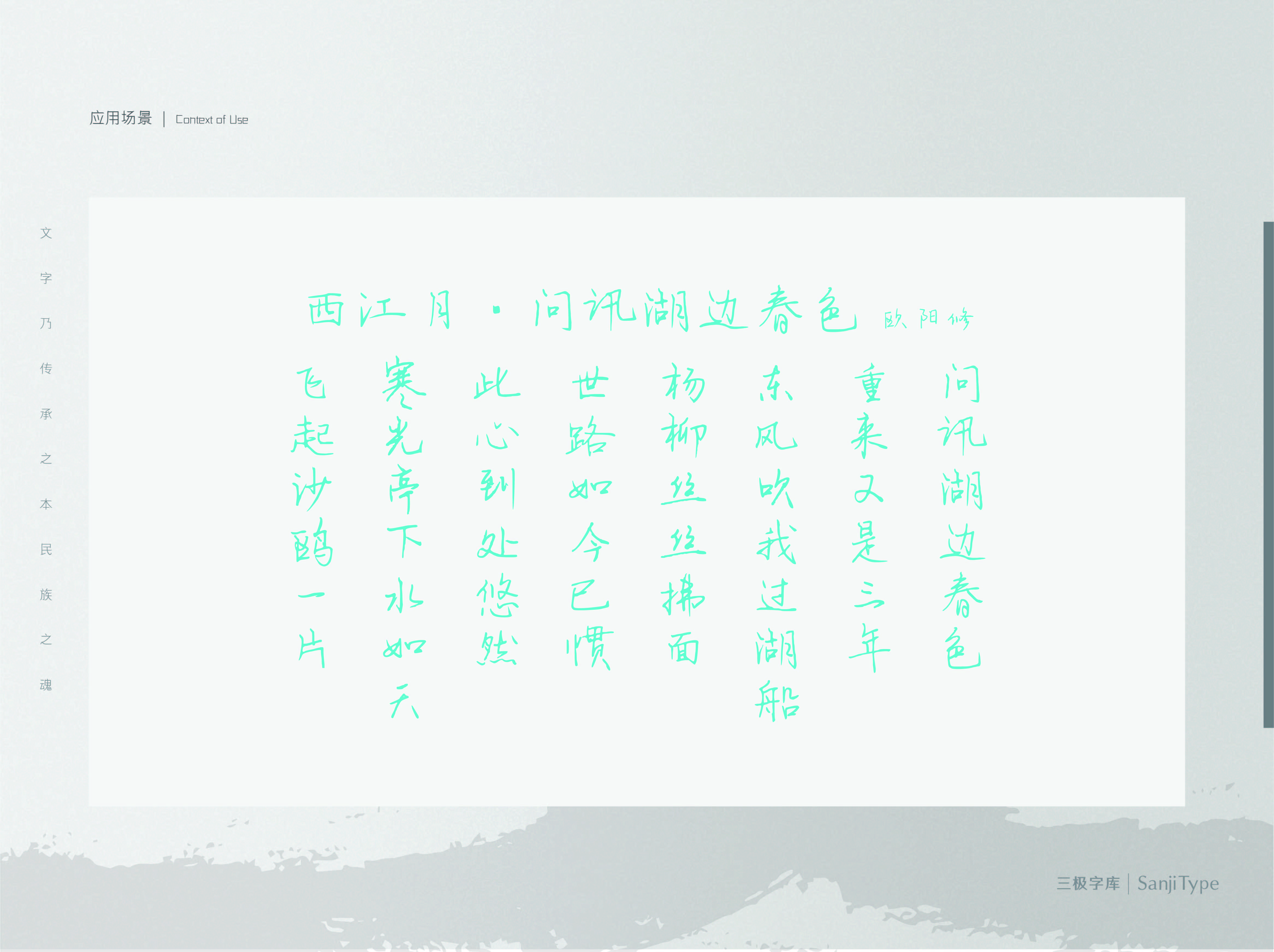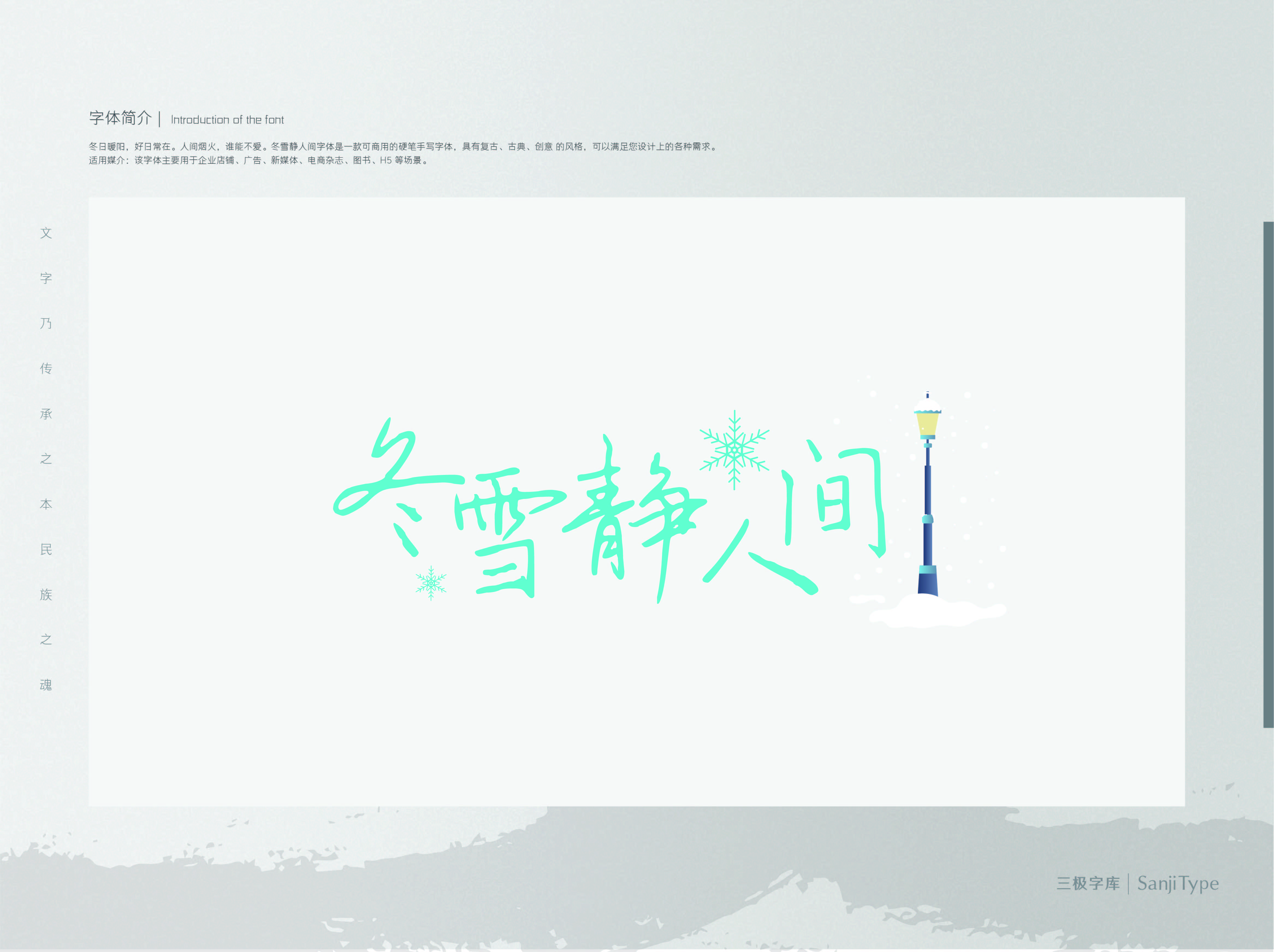 冬雪静人间是一款充满人间烟火气息的手写字体。结构严谨,横笔相连成波浪形,手写氛围强烈。适用于秋冬季主题、现代诗歌短文的排版以及文化、商业类品牌的广告语设计。