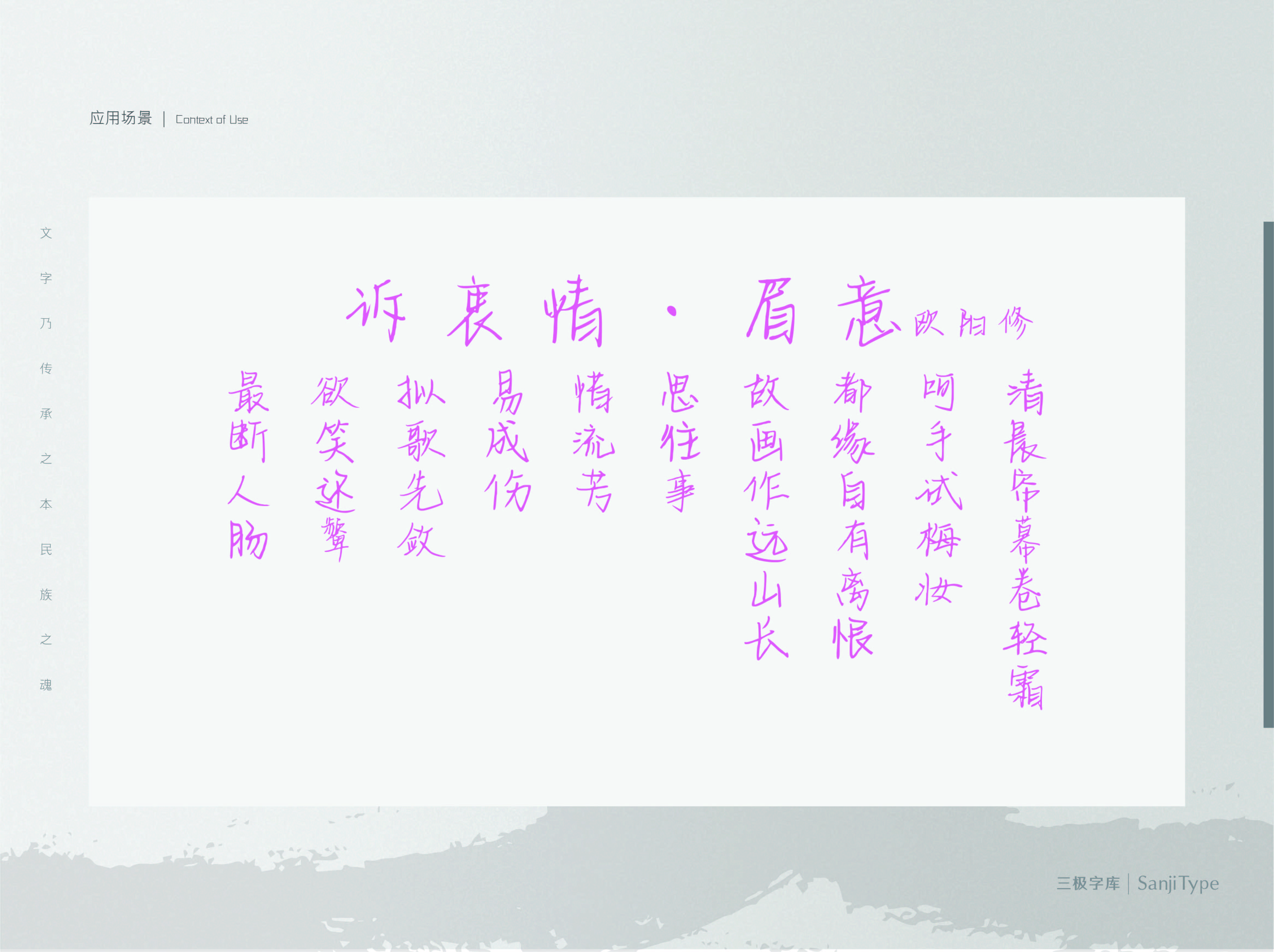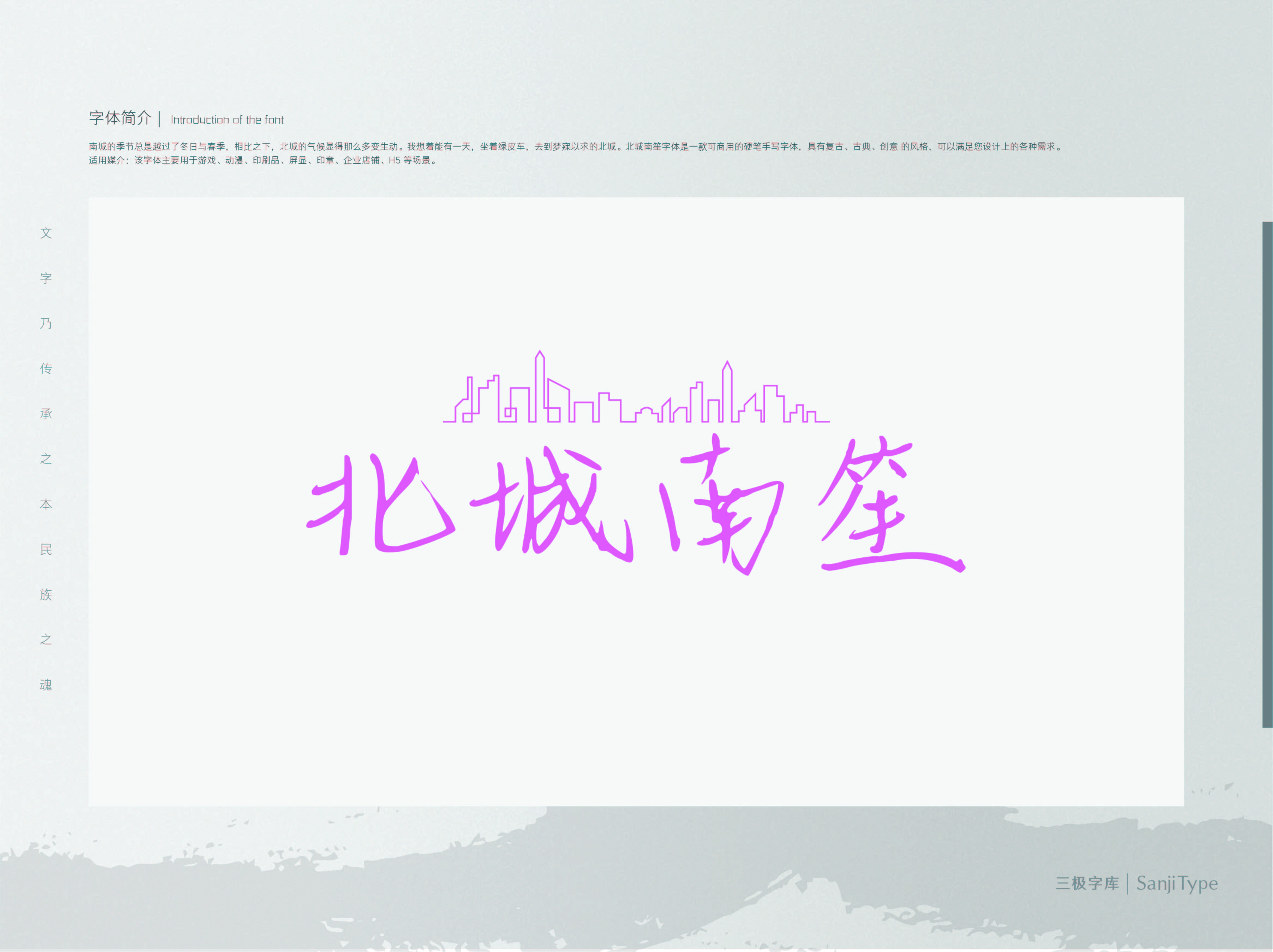 北城南笙,该字笔画轻盈飘逸,主笔突出、恣意洒脱。运用在文艺类设计中,能够提升画面辨识度,也同样适用于个性独特、小众格调的品牌物料设计中。
