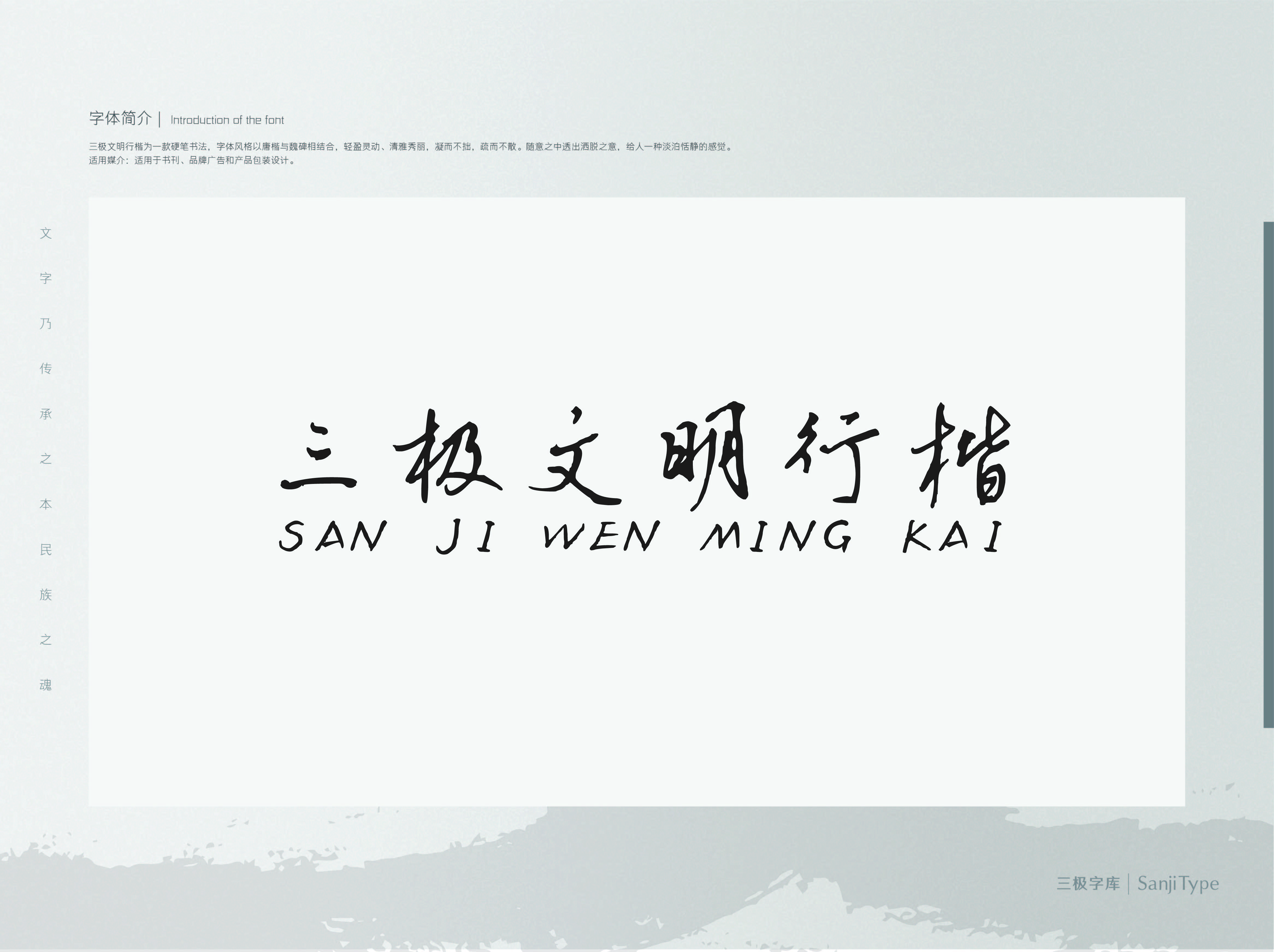 三极文明行楷为一款硬笔书法,字体风格以唐楷与魏碑相结合,轻盈灵动、清雅秀丽,凝而不拙,疏而不散。随意之中透出洒脱之意,给人一种淡泊恬静的感觉。适用于书刊、品牌广告和产品包装设计。