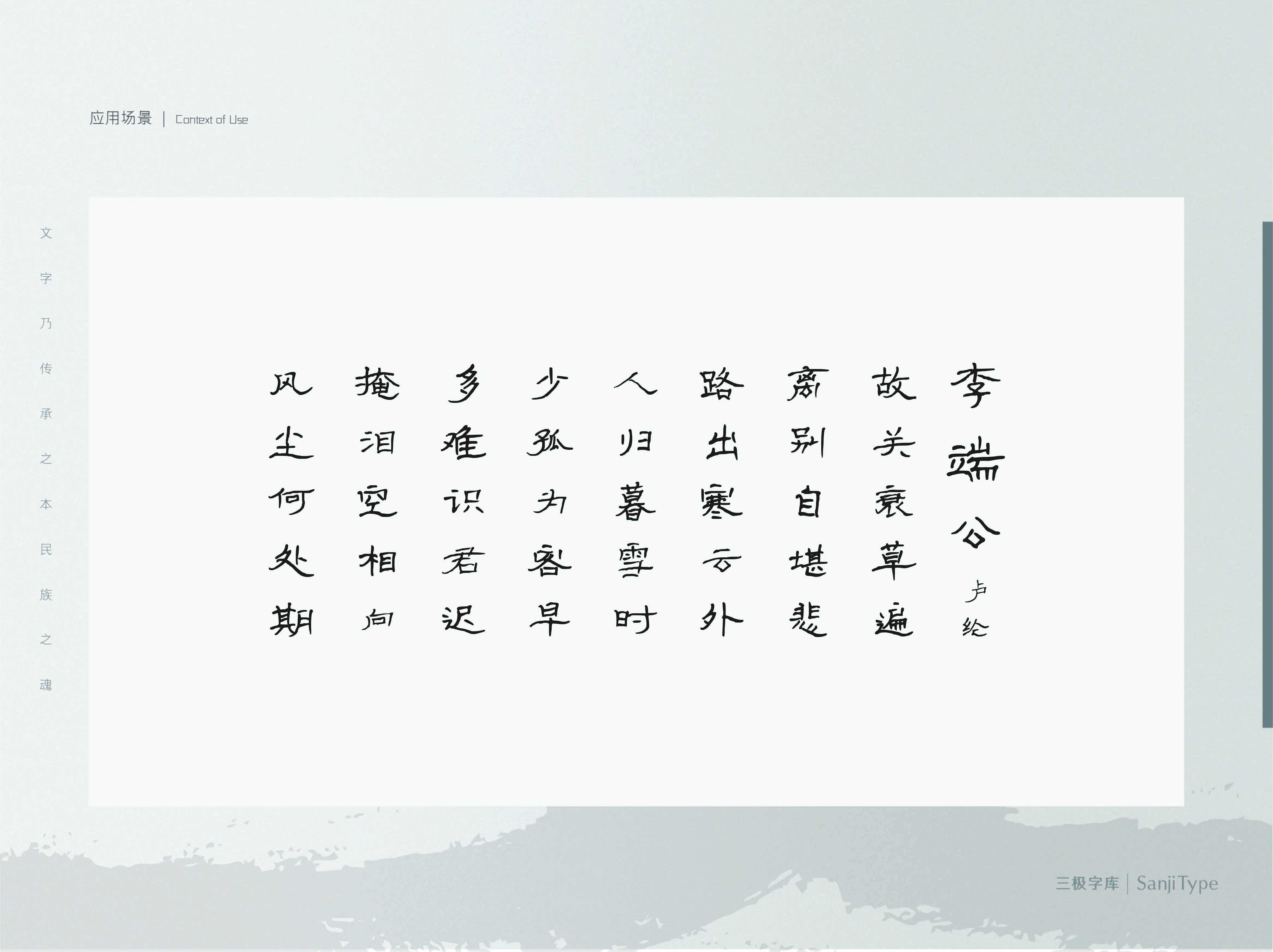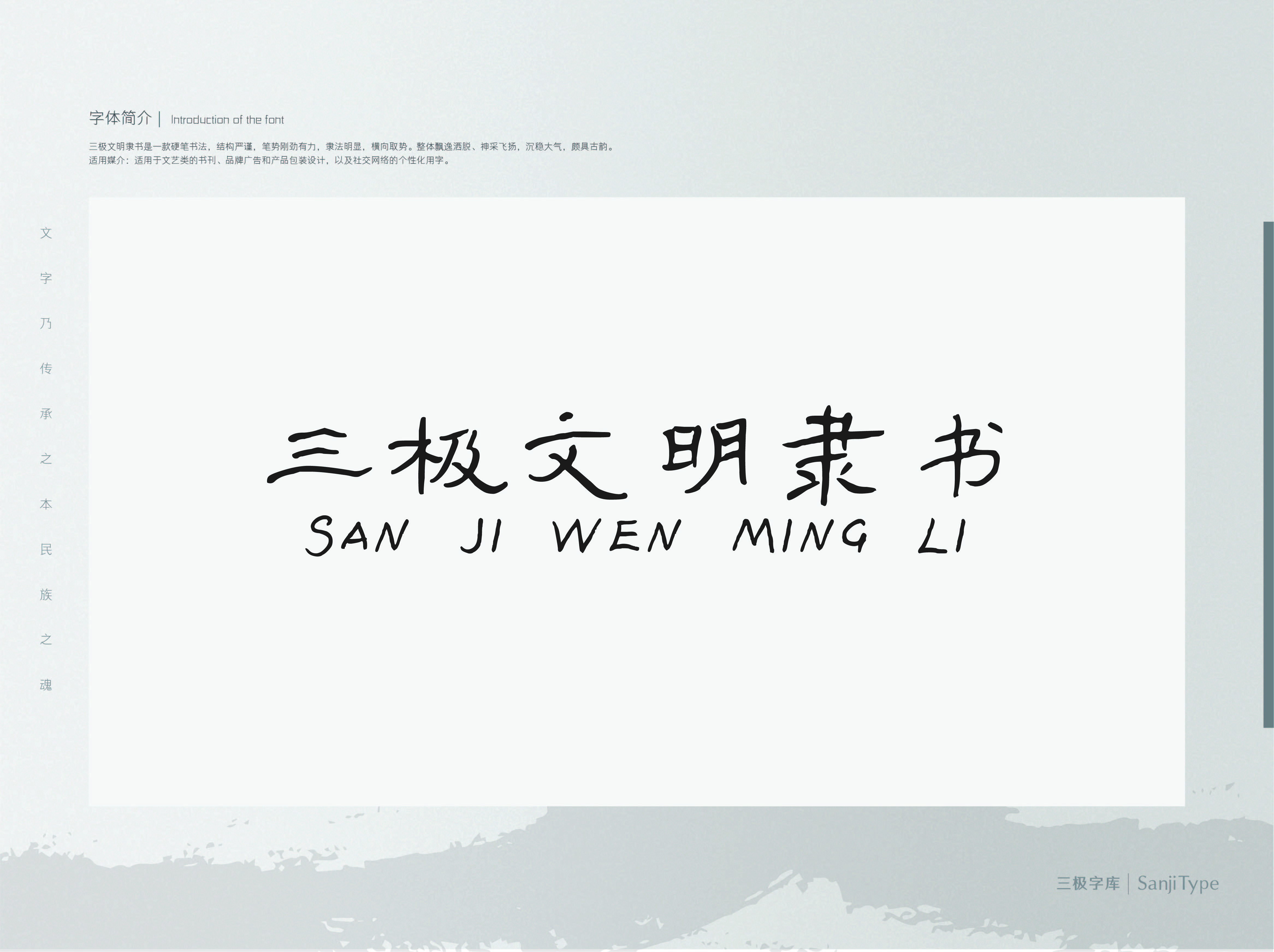 三极文明隶书是一款硬笔书法,结构严谨,笔势刚劲有力,隶法明显,横向取势。整体飘逸洒脱、神采飞扬,沉稳大气,颇具古韵。适用于文艺类的书刊、品牌广告和产品包装设计,以及社交网络的个性化用字。