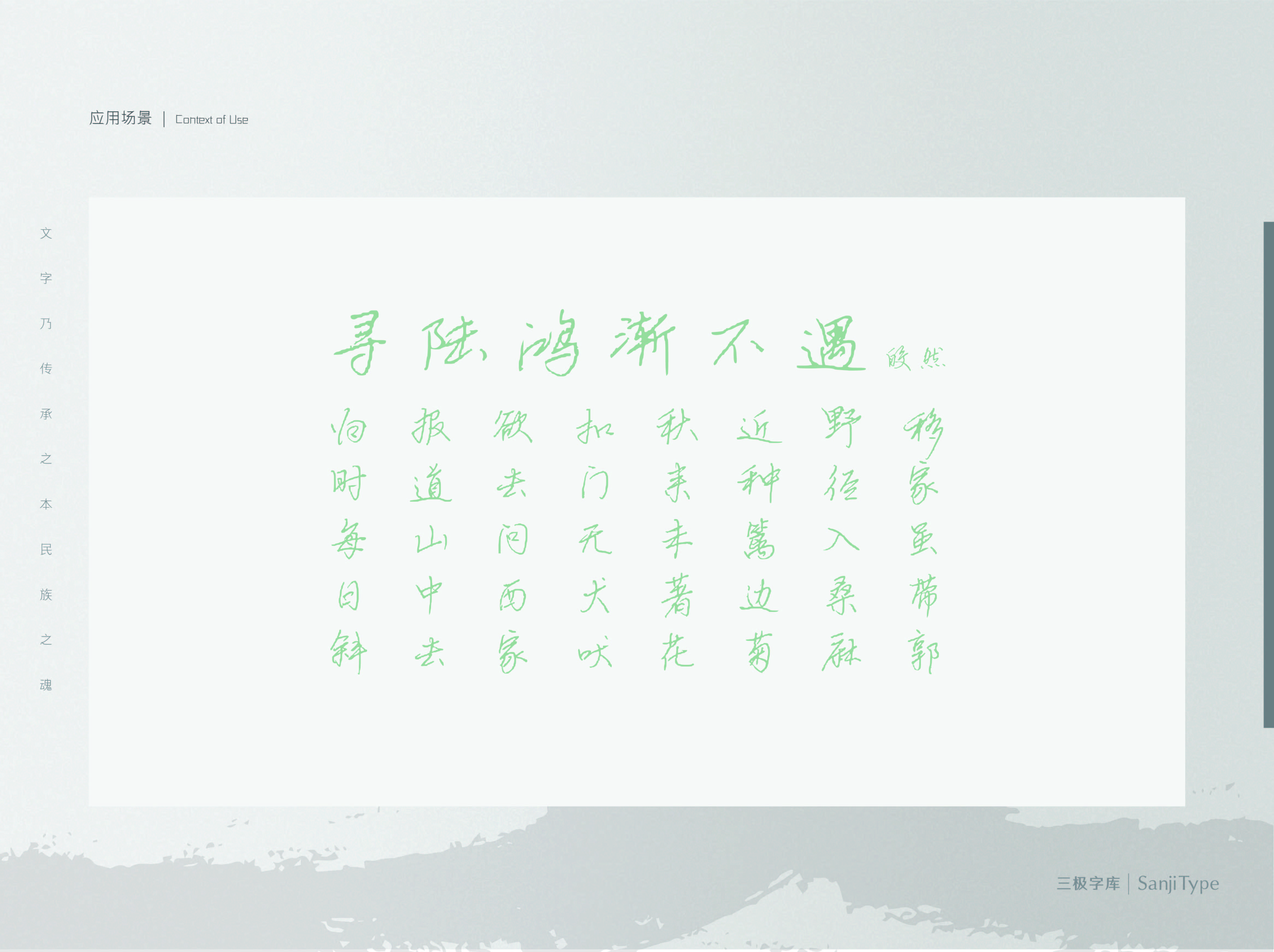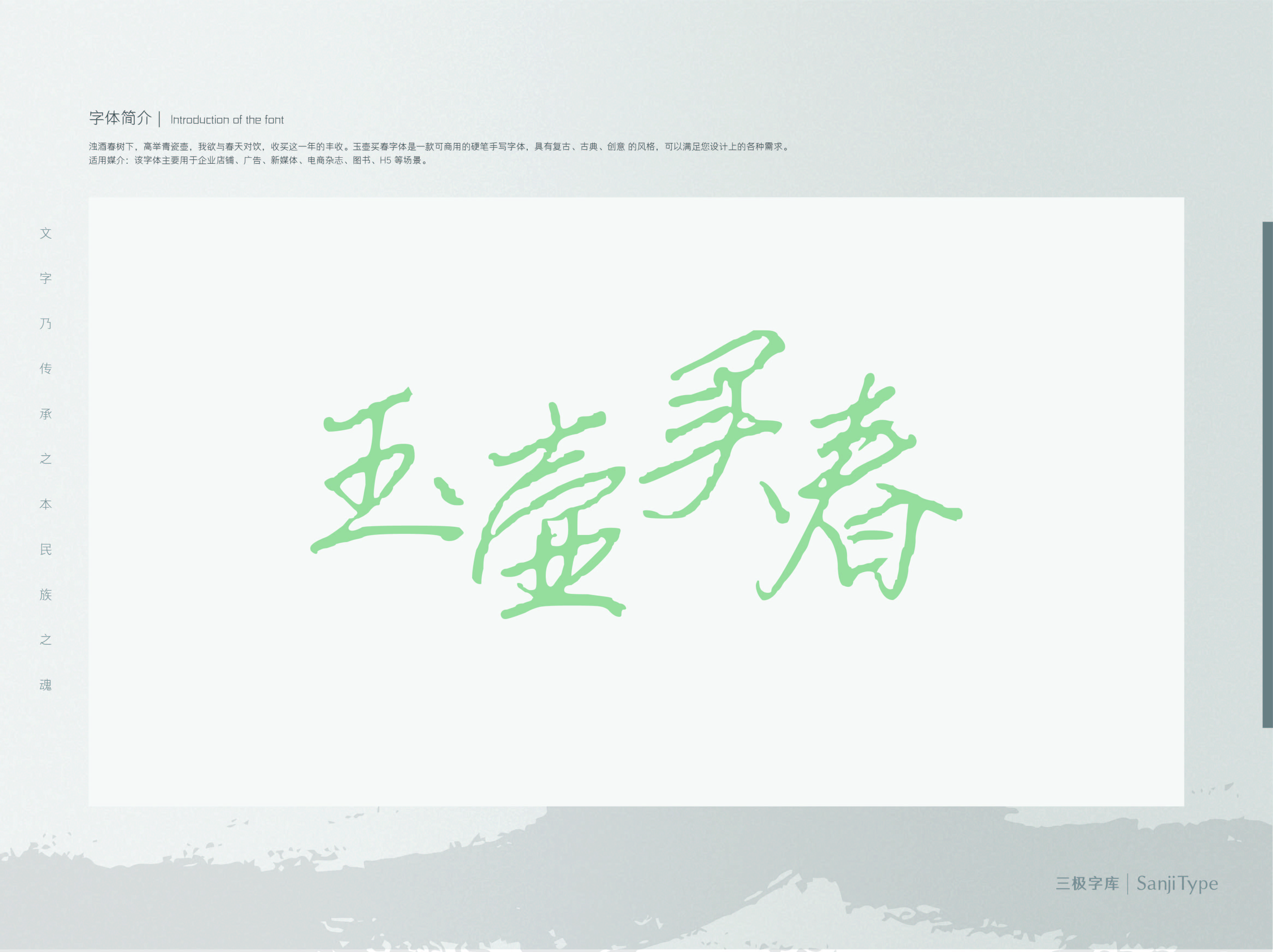 “玉壶买春”这款字笔画连贯写意,连笔增添整体的行草气质,还带有笔墨在宣纸上书写时的晕染效果。应用于高级文艺类的书刊封面、品牌海报中能够发挥出该字体的最大视觉效果。
