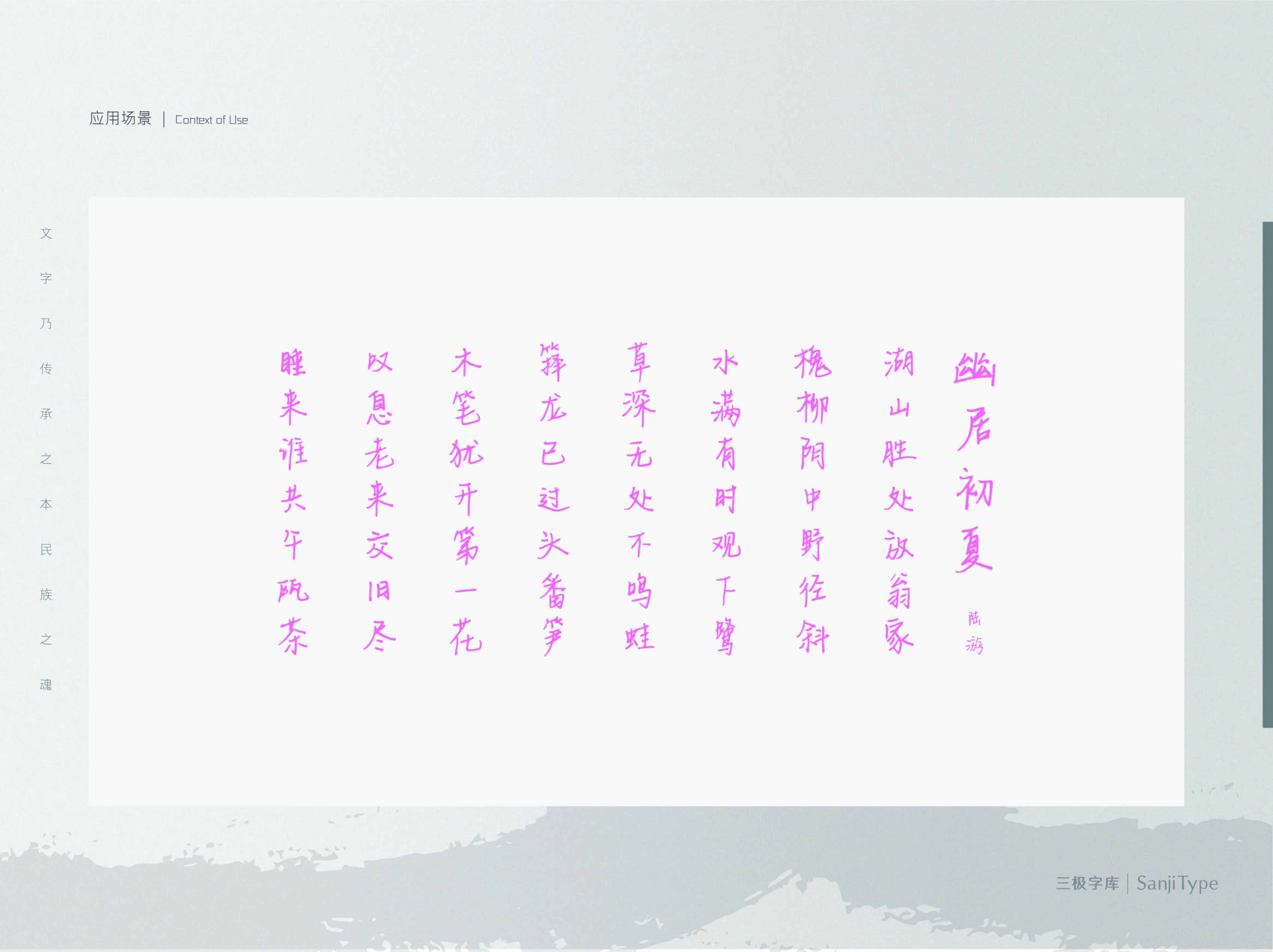 这款手写字骨架考究,线条较细,但以圆头起收笔,增加了圆润肉感和几分亲和感。适用于地球自然类、美食餐饮业等行业设计,不仅适用于标题也可用于正文排版。