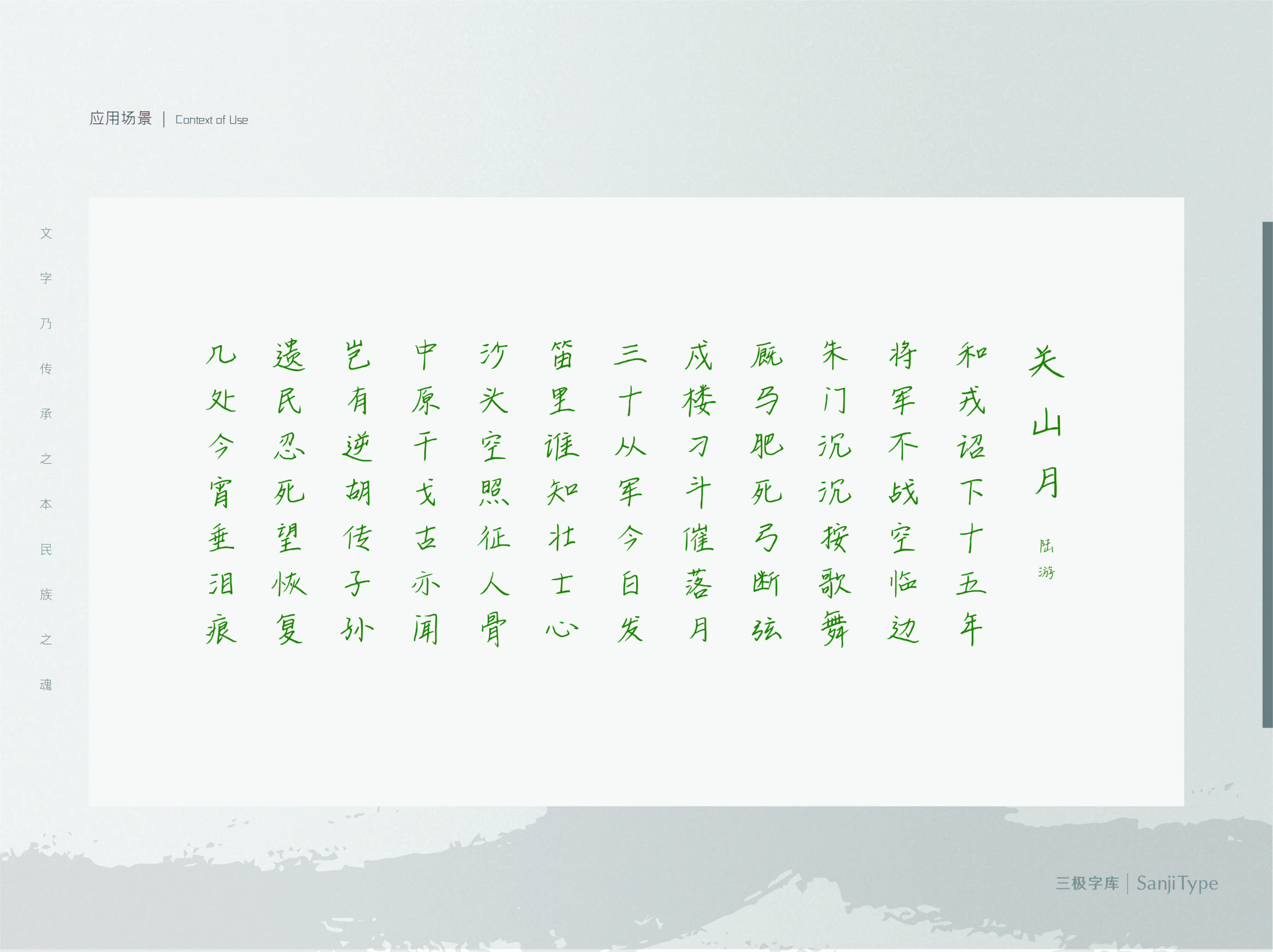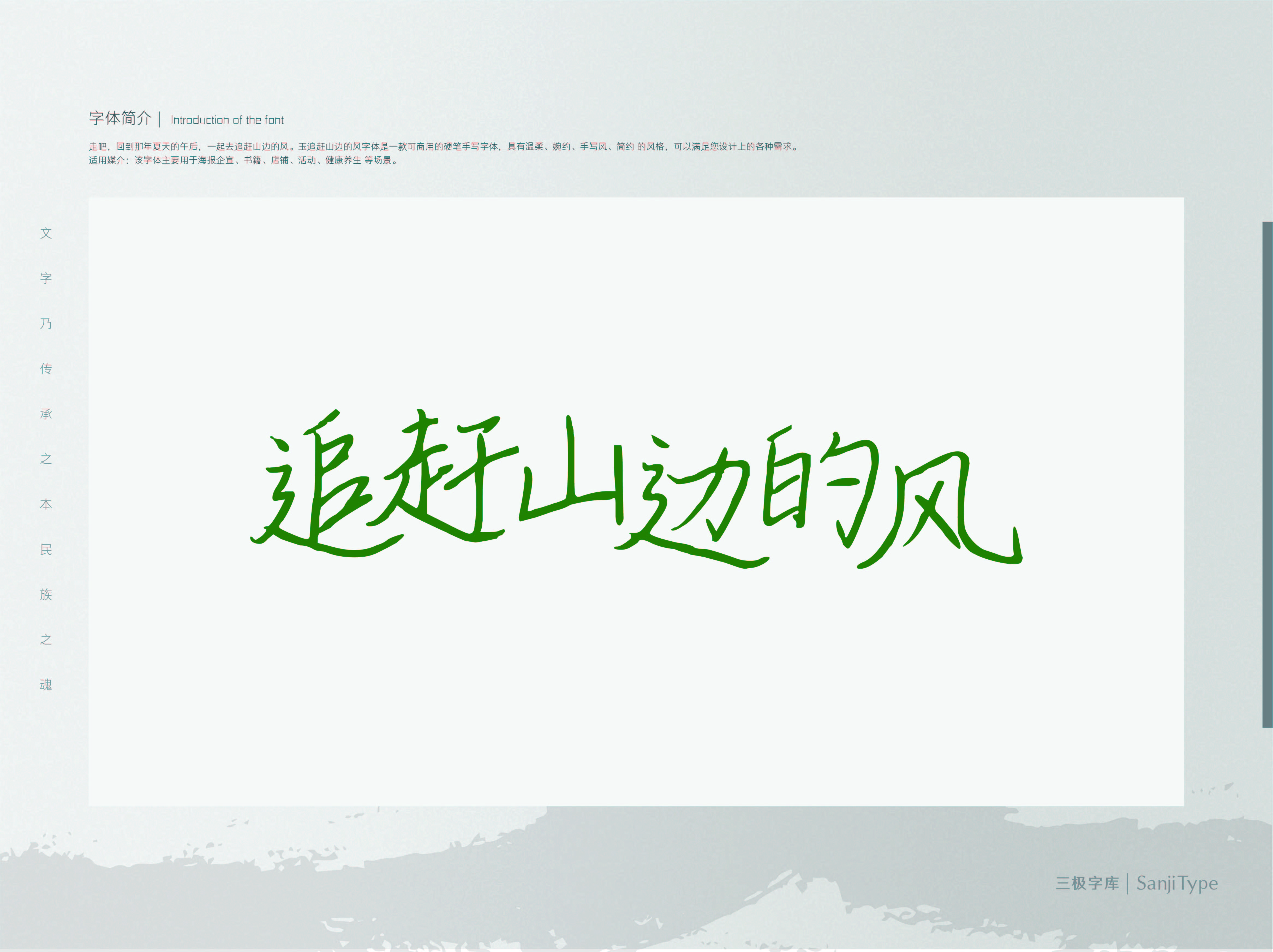 追赶山边的风是一款清新自然的手写体。笔画细致,撇捺伸展,有如大自然般富有包容力。该字体适用于清新自然类的书刊、品牌广告和产品包装设计,以及社交网络的个性化用字。