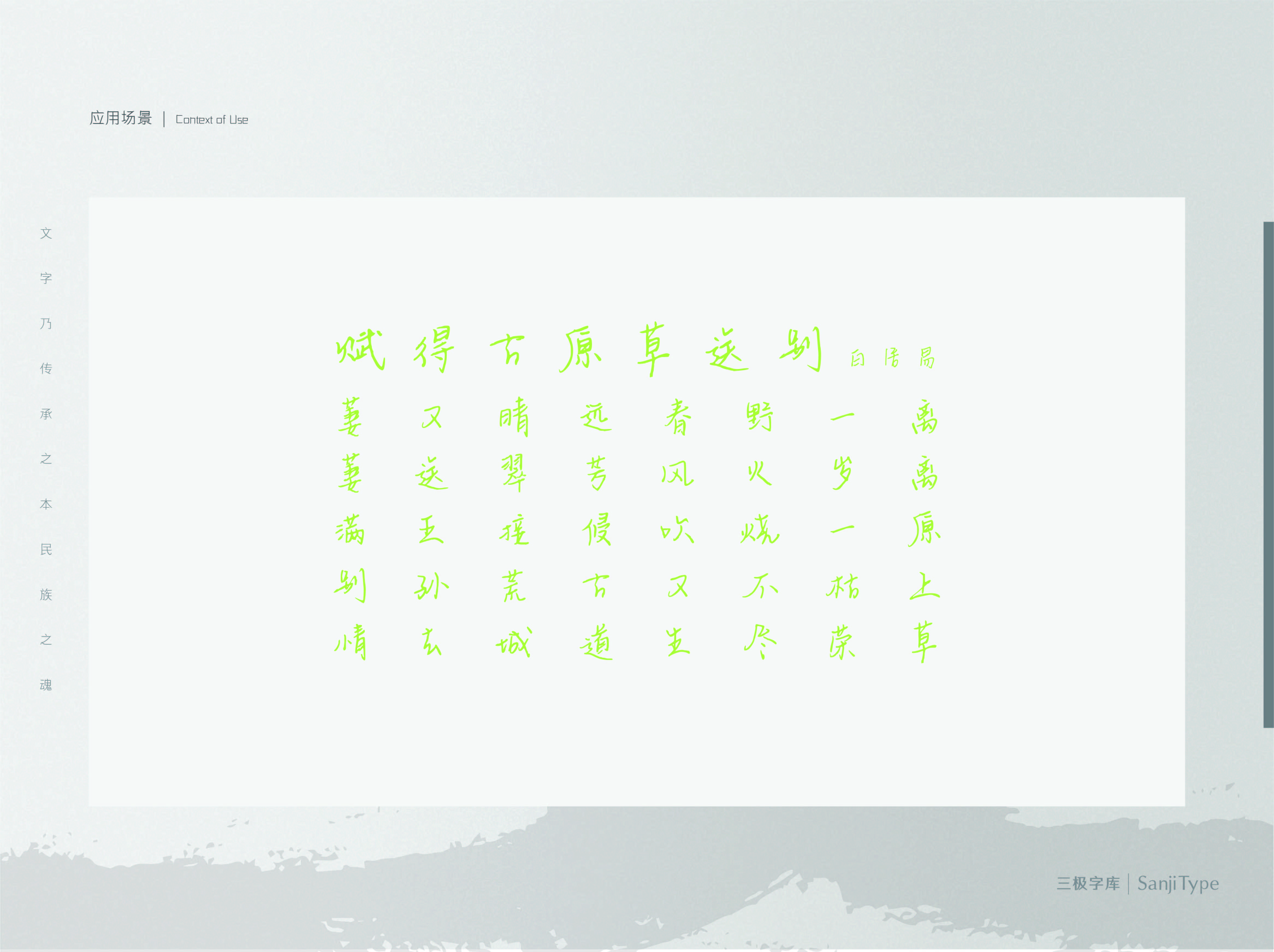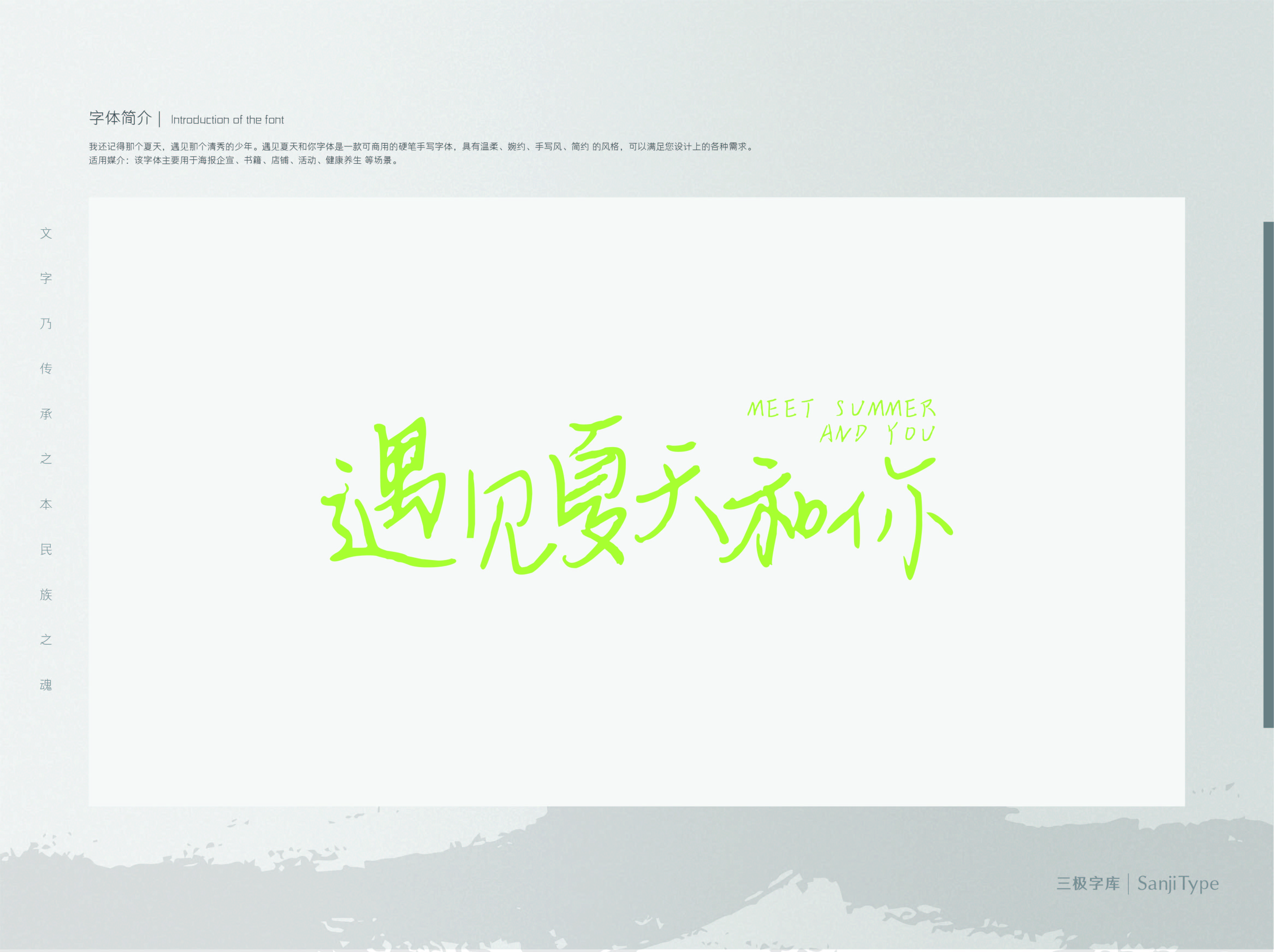遇见夏天和你,是一款清秀隽丽、感性文艺的硬笔字体。字迹清晰,结构别出新裁,富有诗意。适用于古现代诗歌、短文的排版以及文化、商业类品牌的广告语设计。