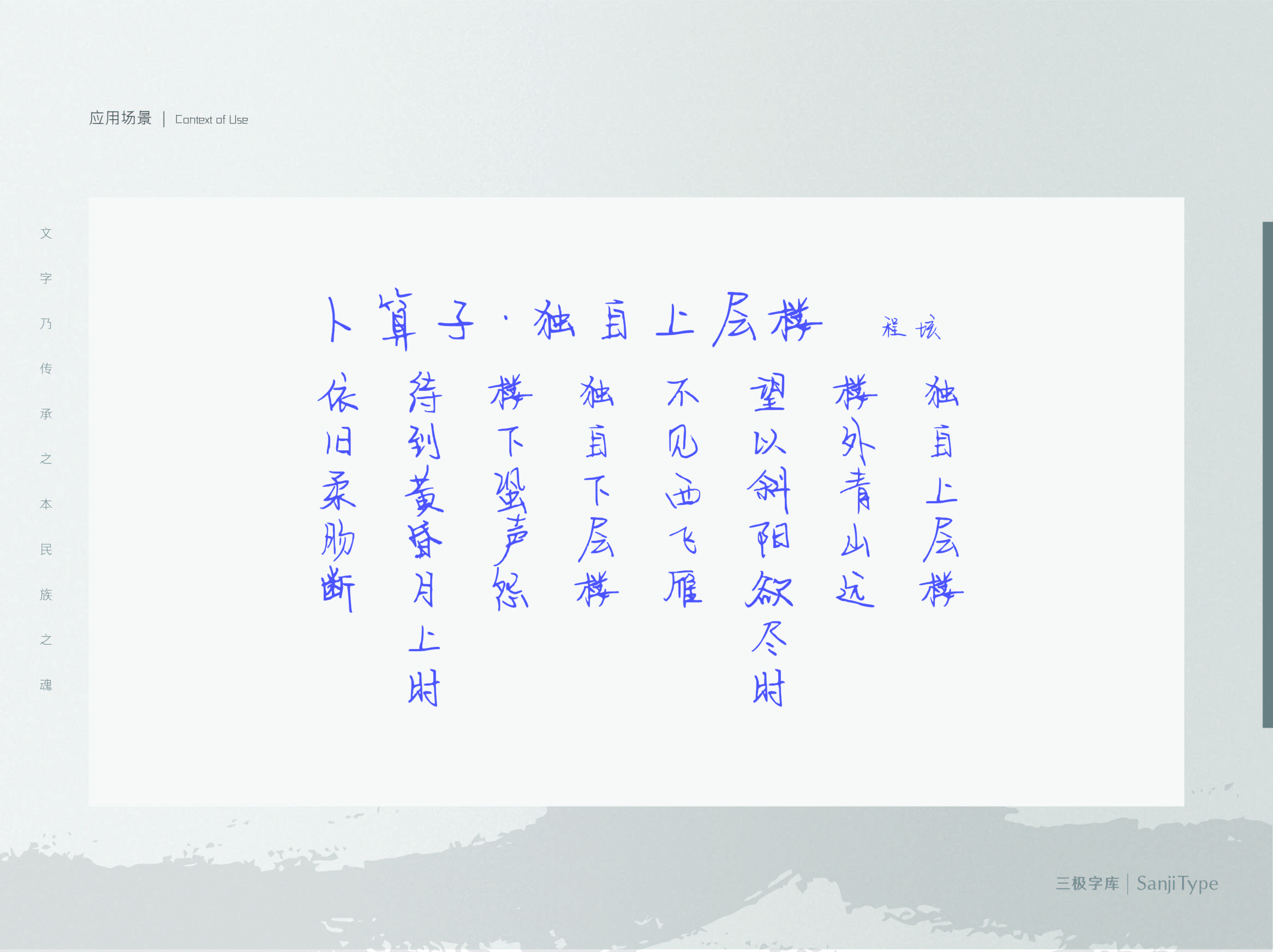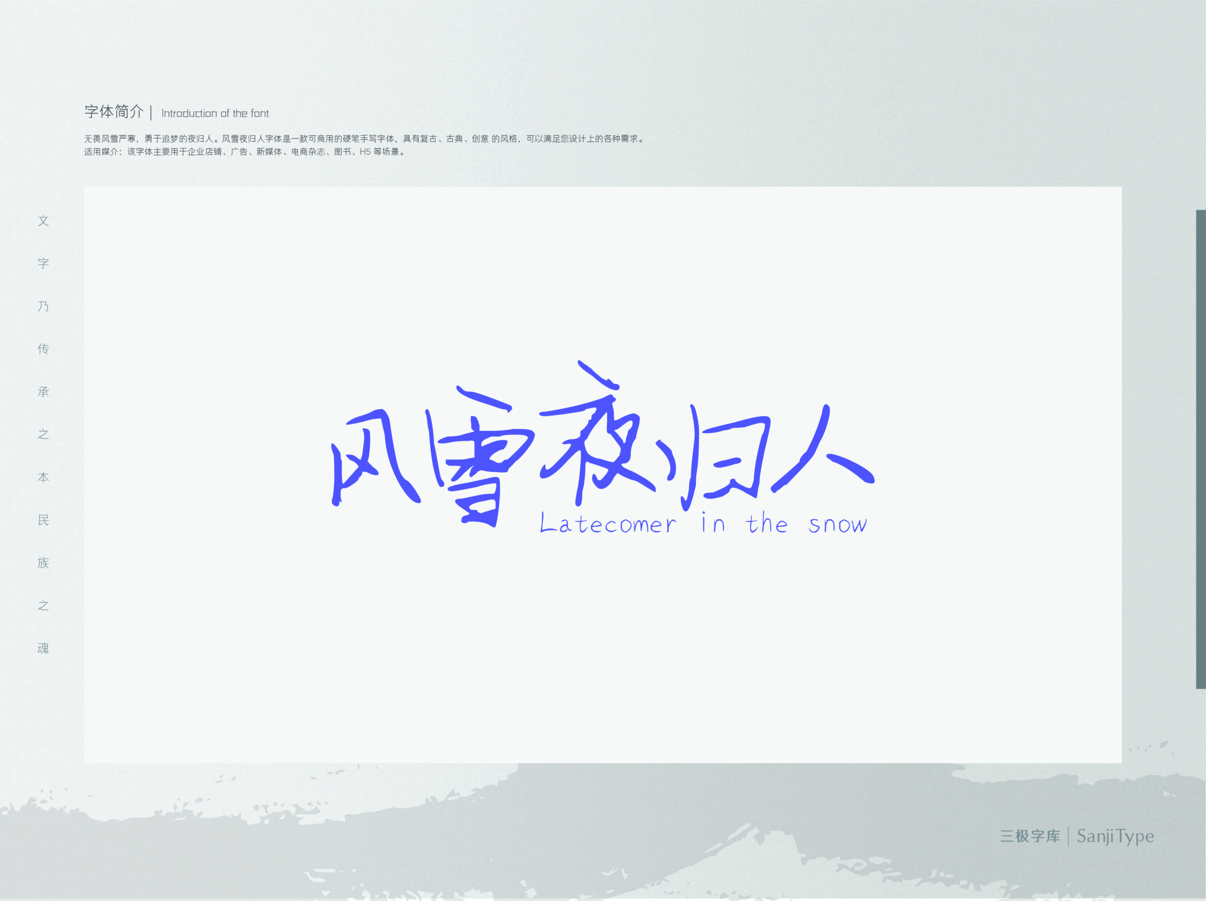 这款字体的倾斜角度较不规整,但保证可识别度,具有鲜明个性特点。线条遒劲,刚中显柔。让人赏心悦目,百看不厌。运用在文艺类设计、品牌广告和社交图片中,能够提升画面辨识度。