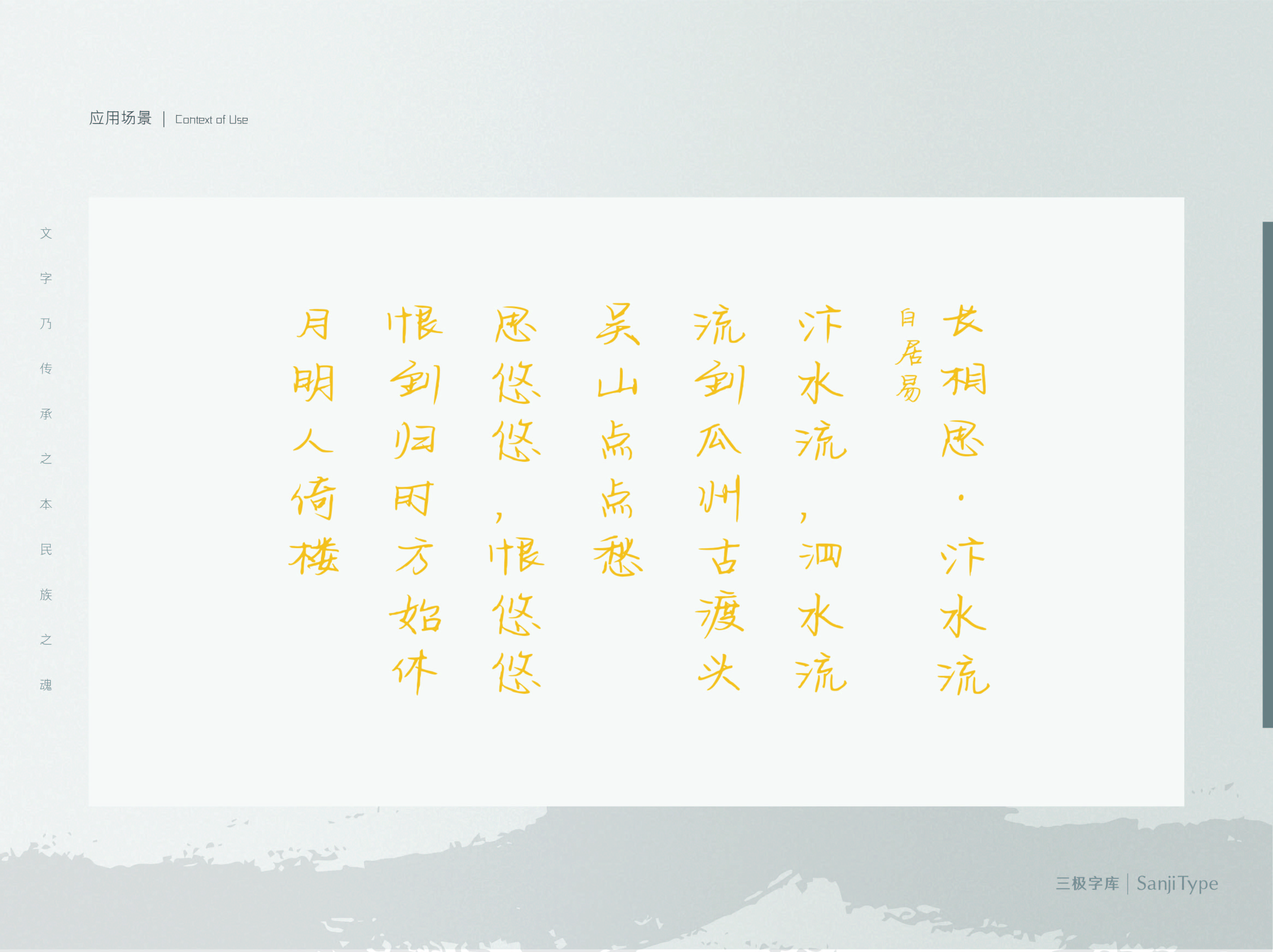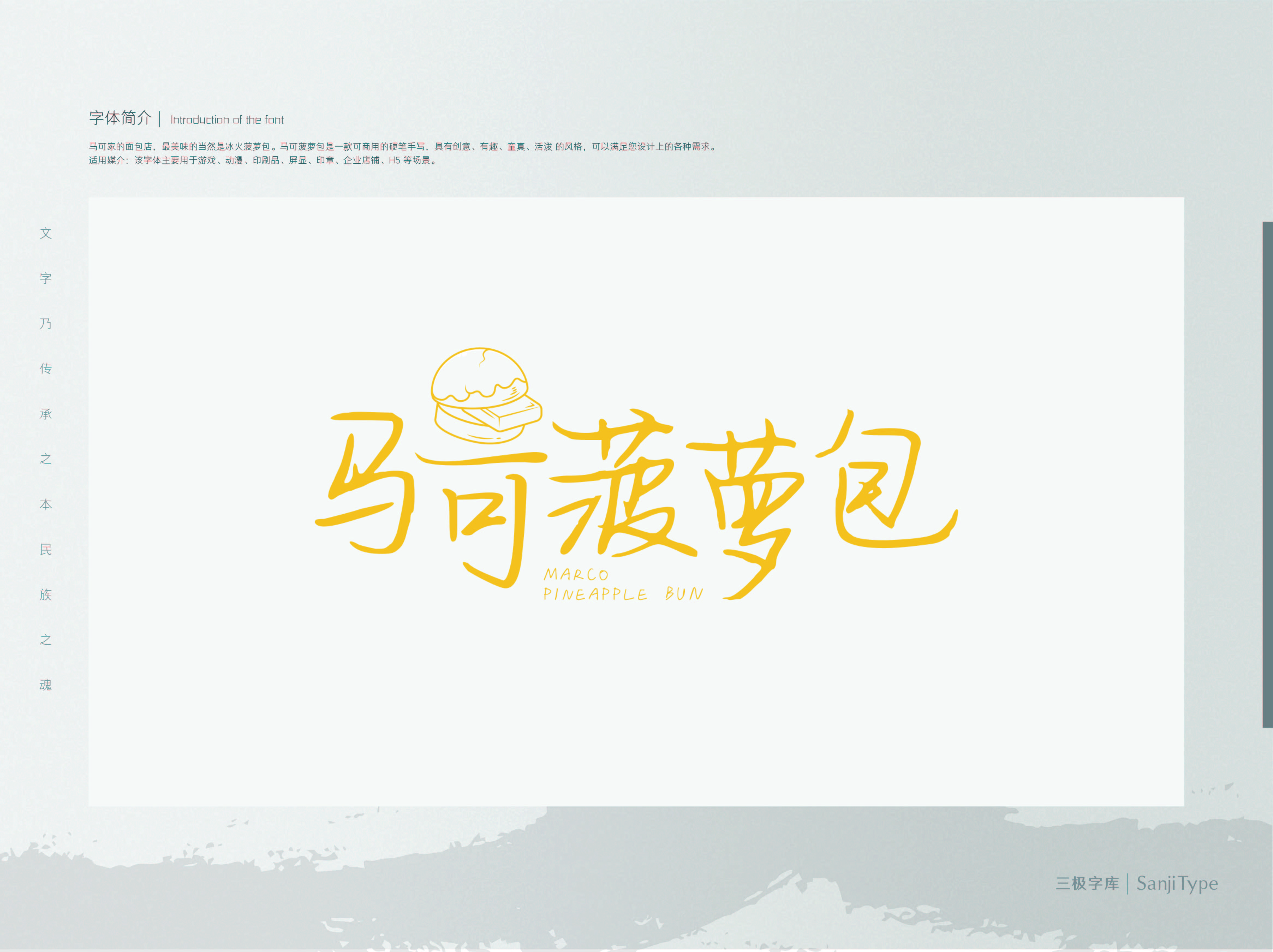 字面稍宽,笔画轻松随性,规整中带有圆润可爱感。本款字体不仅适用于标题也可用于正文排版。使用行业涵盖美食餐饮、报刊杂志、书刊、品牌广告等。