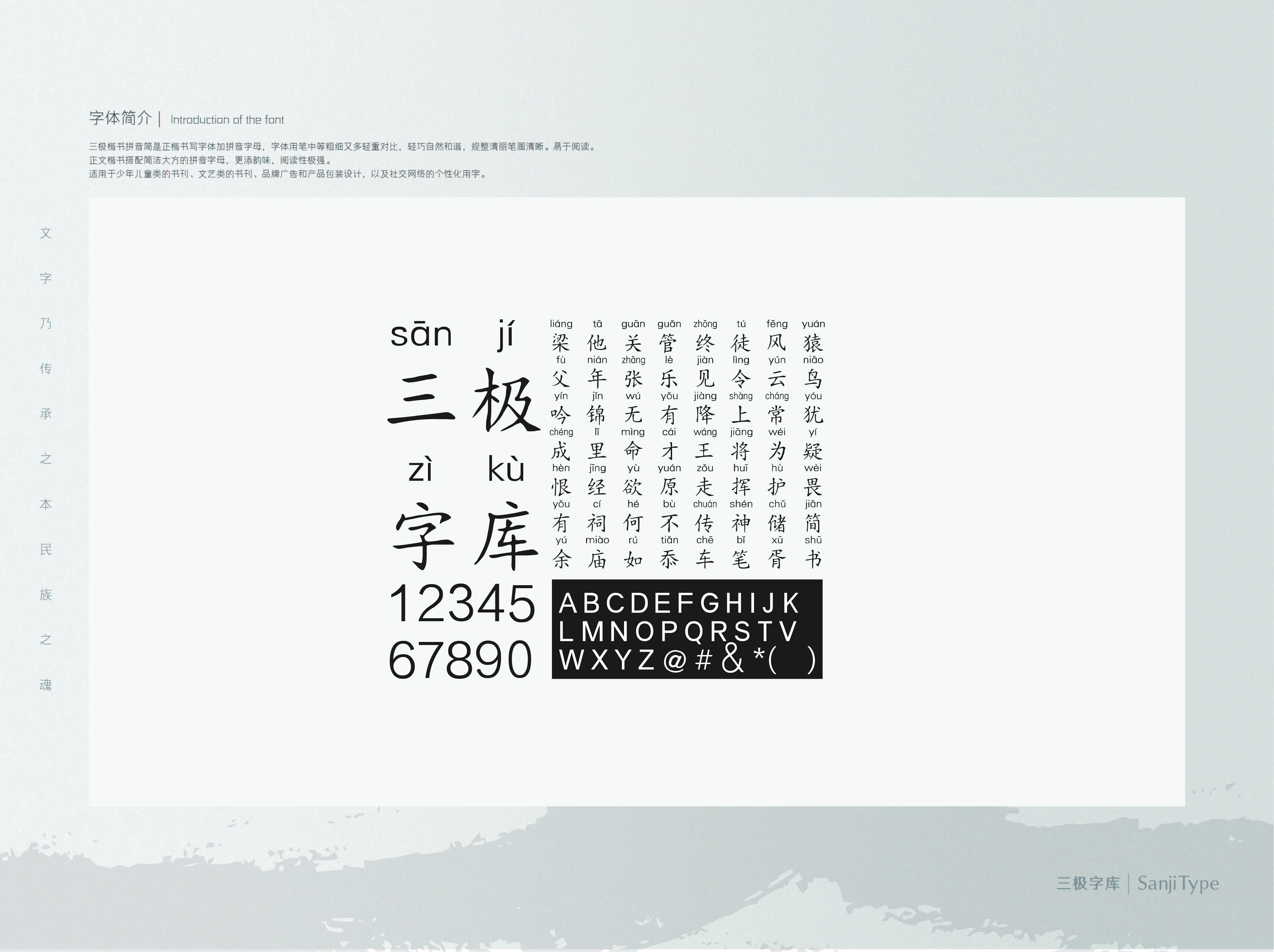三极楷书拼音简是正楷书写字体加拼音字母,字体用笔中等粗细又多轻重对比,轻巧自然和谐,规整清丽笔画清晰。易于阅读。正文楷书搭配简洁大方的拼音字母,更添韵味,阅读性极强。适用于少年儿童类的书刊、文艺类的书刊、品牌广告和产品包装设计,以及社交网络的个性化用字。