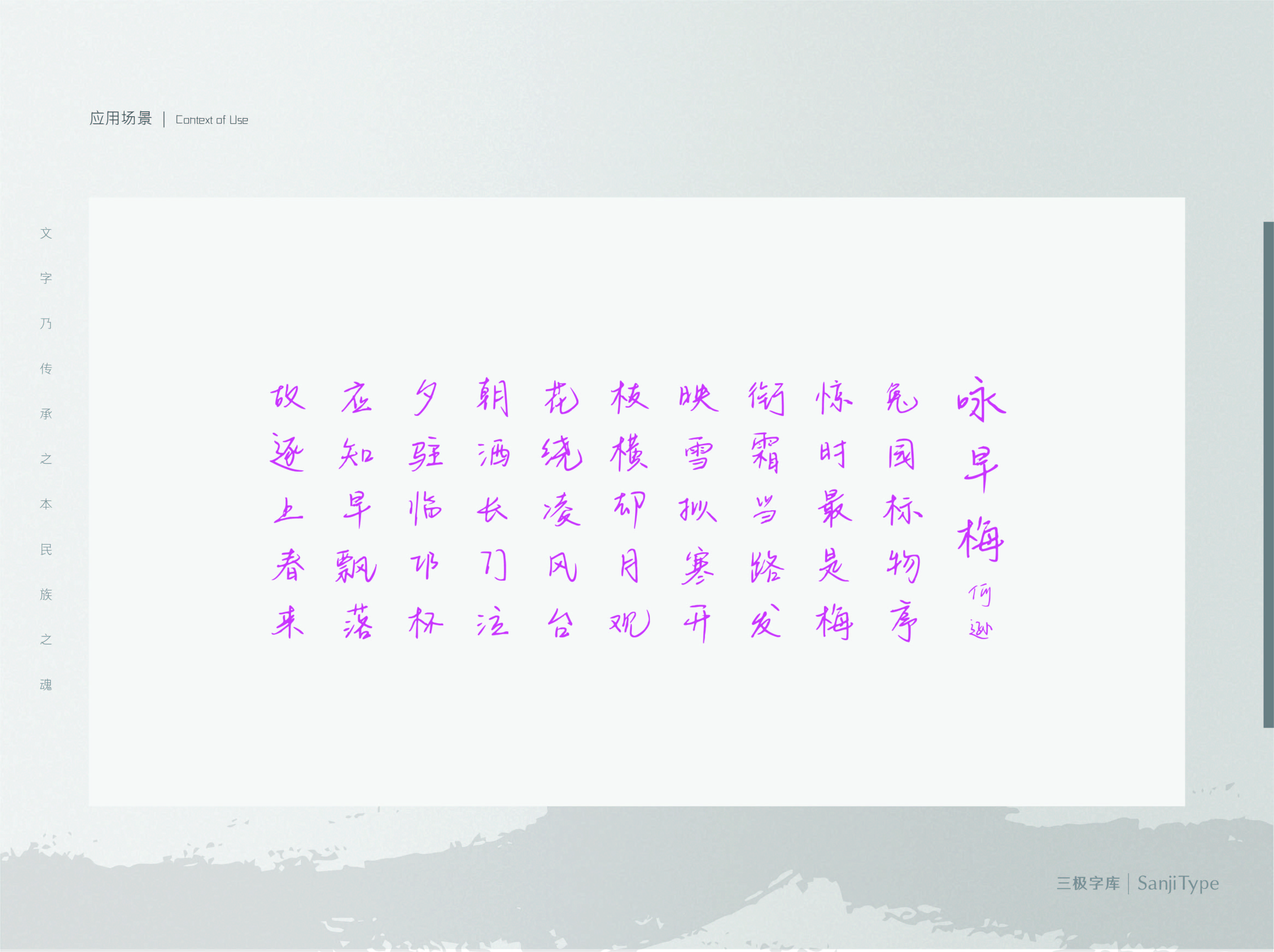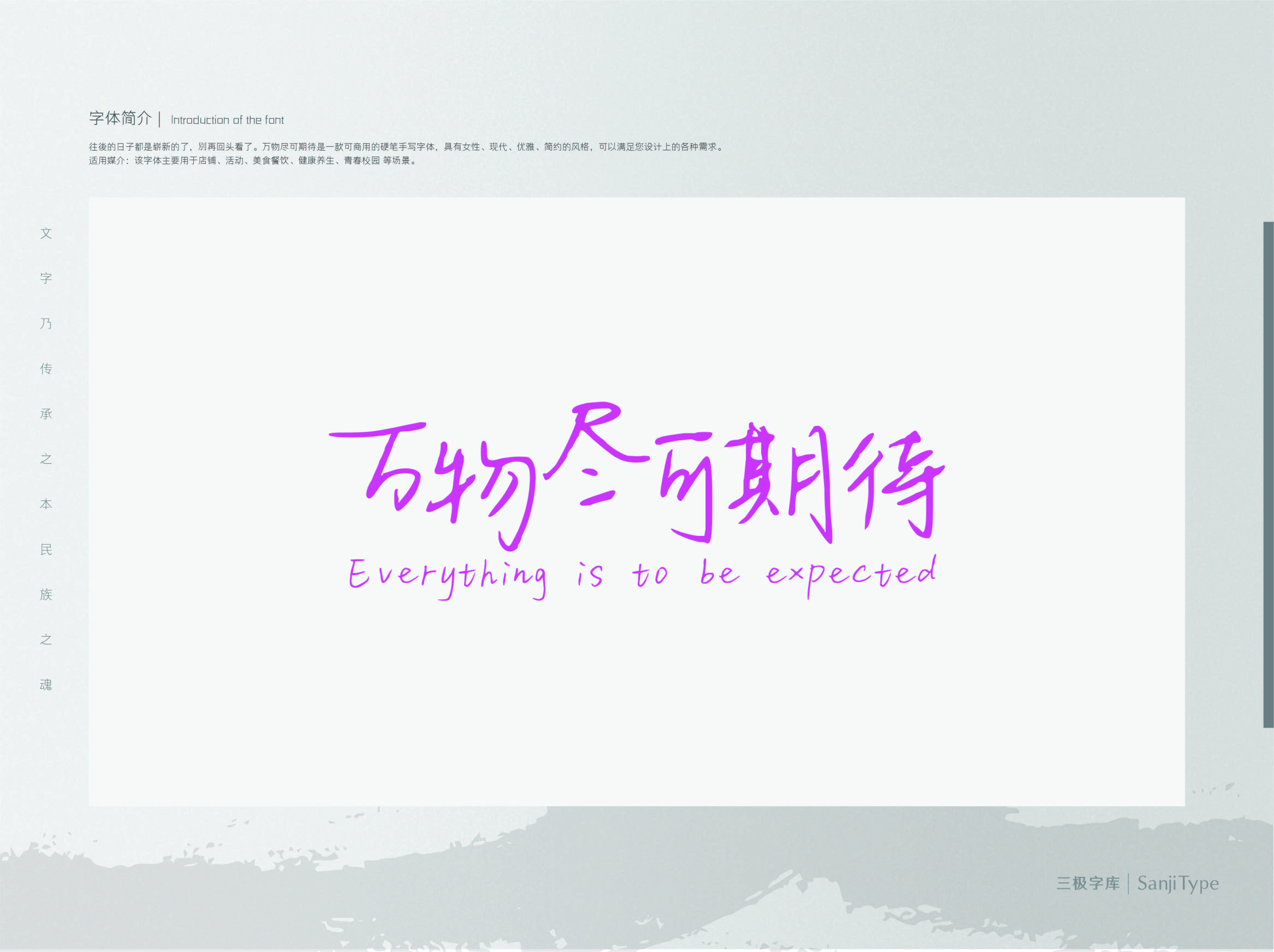 万物尽可期待是一款带有积极向上气质的硬笔字体。它线条飘逸,有着春回大地的视觉活力,笔画向右上倾斜增加了字体的率性。适用于温暖、治愈、公益等风格的设计场景。