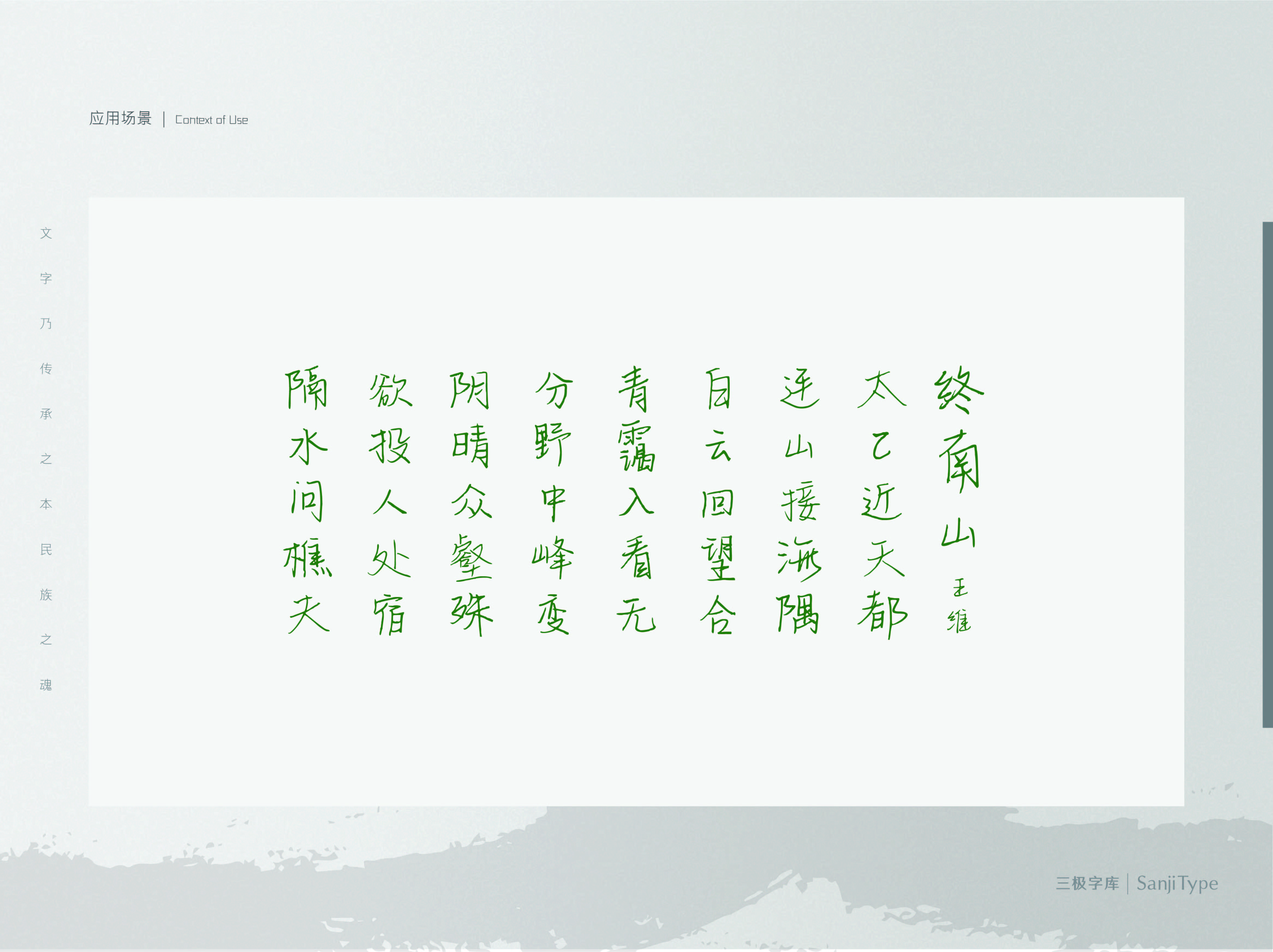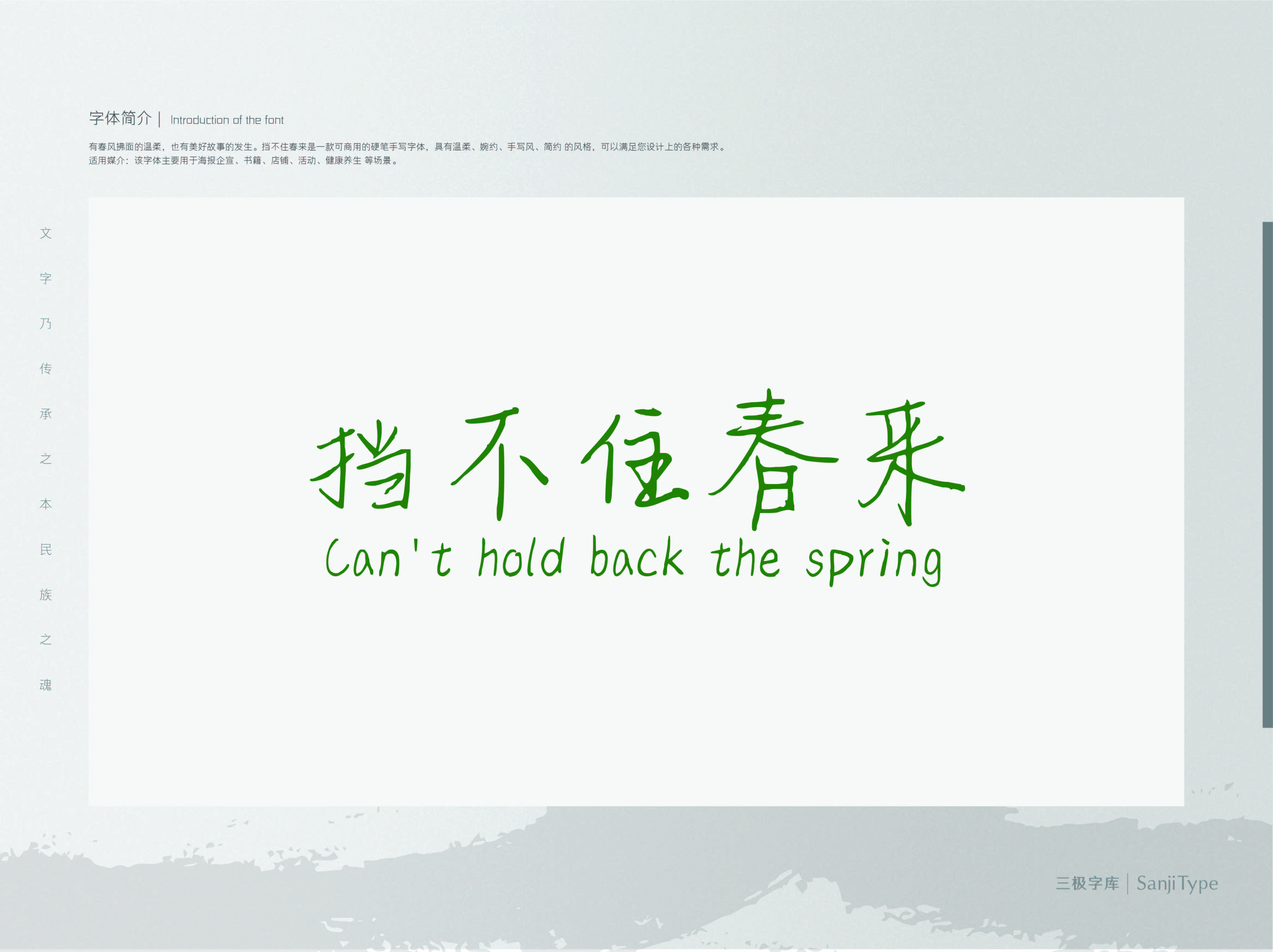 挡不住春来是一款笔画线条纤细,手写质感强的字体。字面大小有节奏变化,别出心裁。运用在文艺类设计、品牌广告和社交图片中,能够有效美化画面。