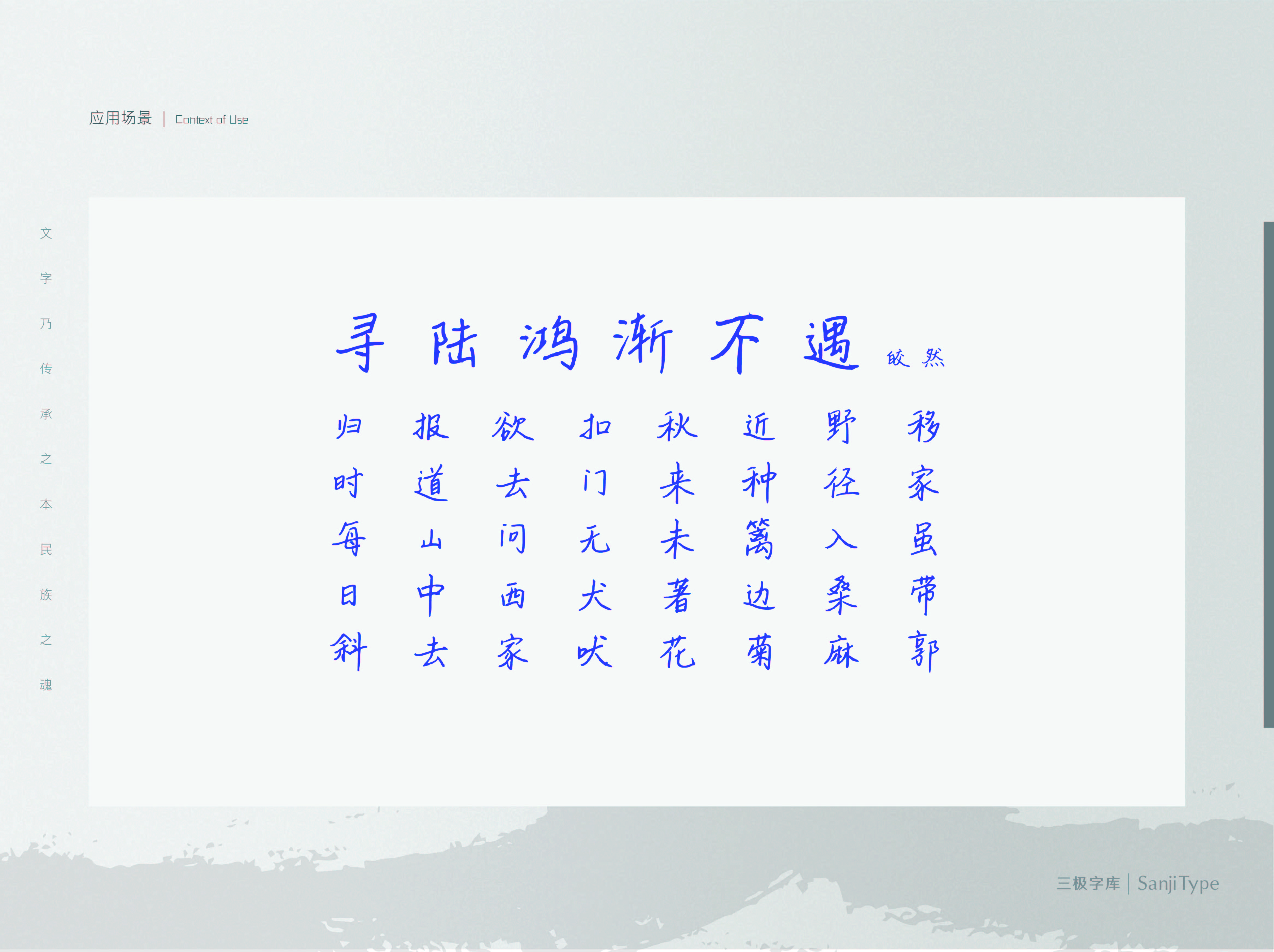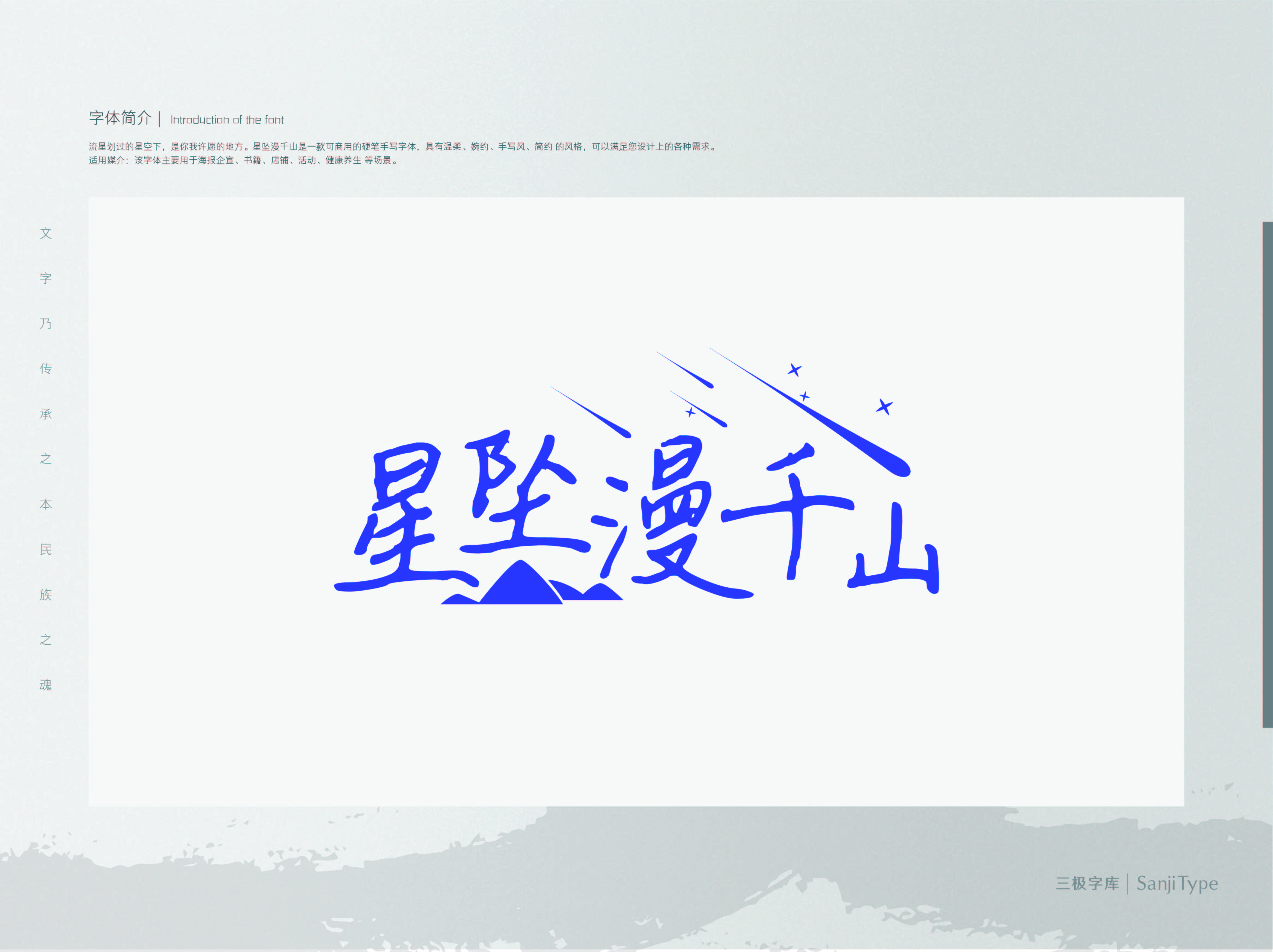 星坠漫千山这款字体字迹连贯干练,有型但不凌乱,具有良好的视觉观感。可以以标题或短文案的形式,应用于文化艺术、珠宝服饰、时尚娱乐等诸多设计场合。