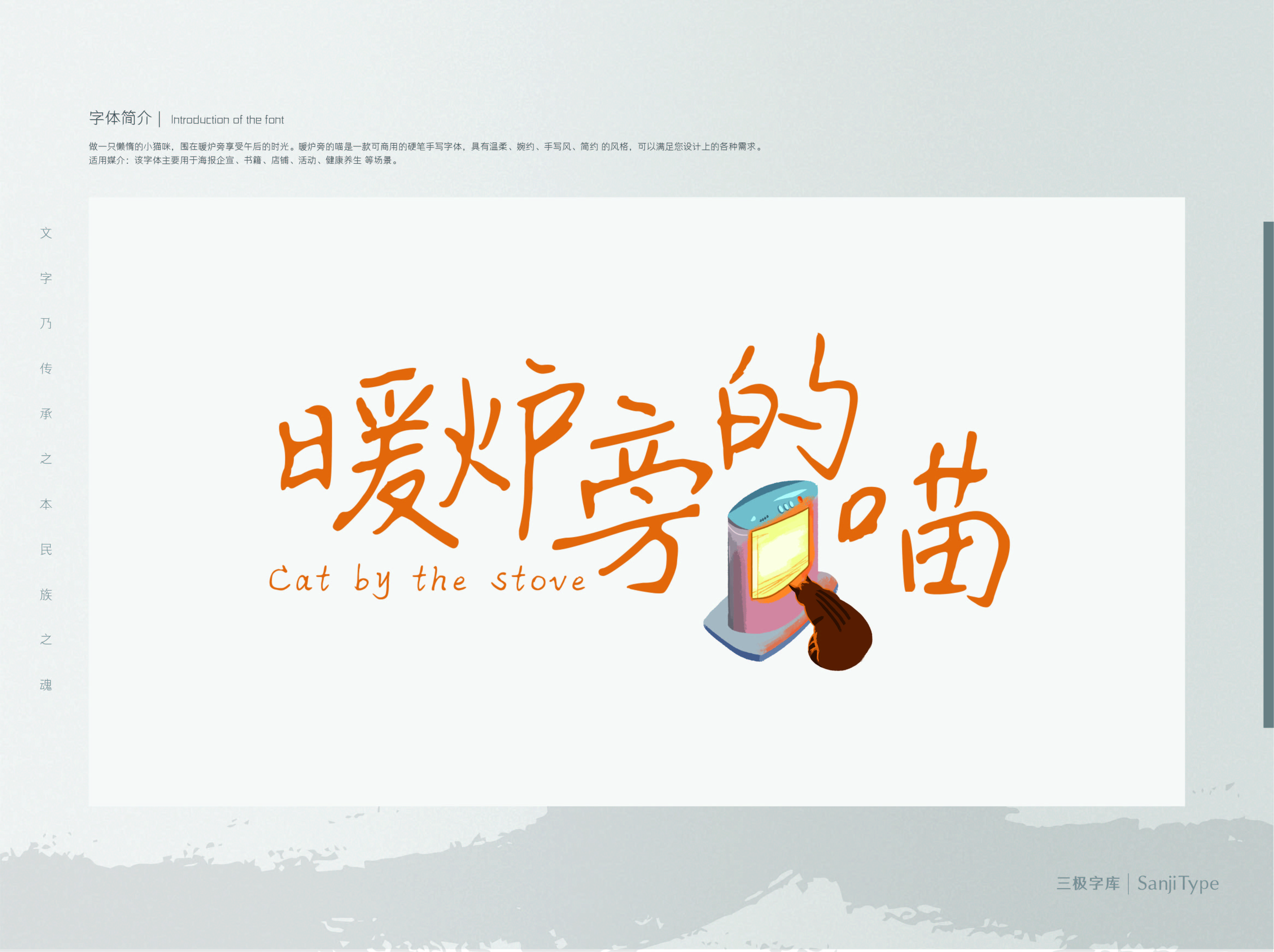 暖炉旁的喵,是一款温暖有力的字体。笔画轻重有秩,少量叠笔和重笔增加温暖厚重感。适用于童趣、可爱、公益等风格主题的设计场景。