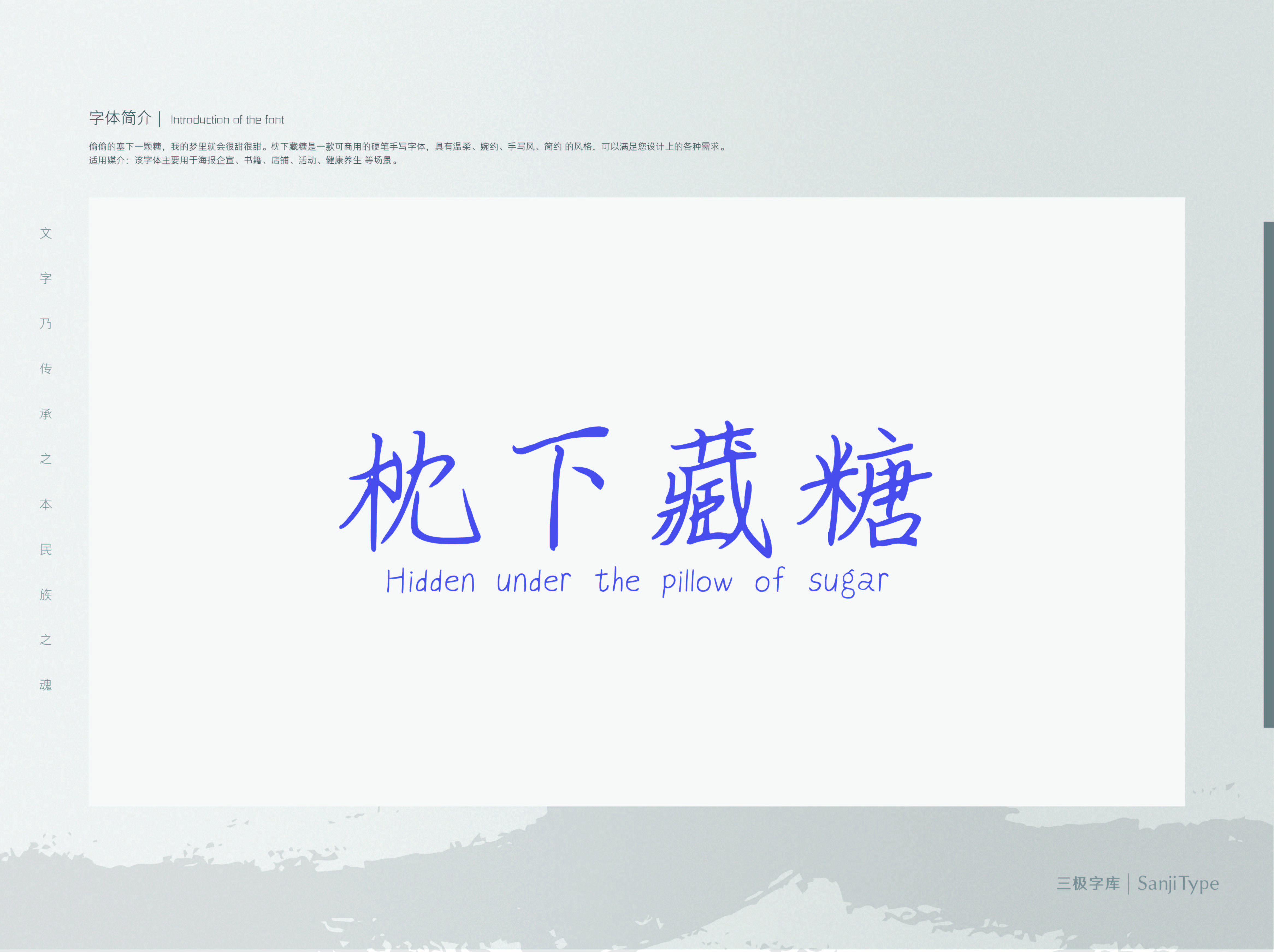枕下藏糖是一款可商用的硬笔手写字体,具有温柔、婉约、手写风、简约 的风格,可以满足您设计上的各种需求,该字体主要用于海报企宣、书籍、店铺、活动、健康养生 等场景。