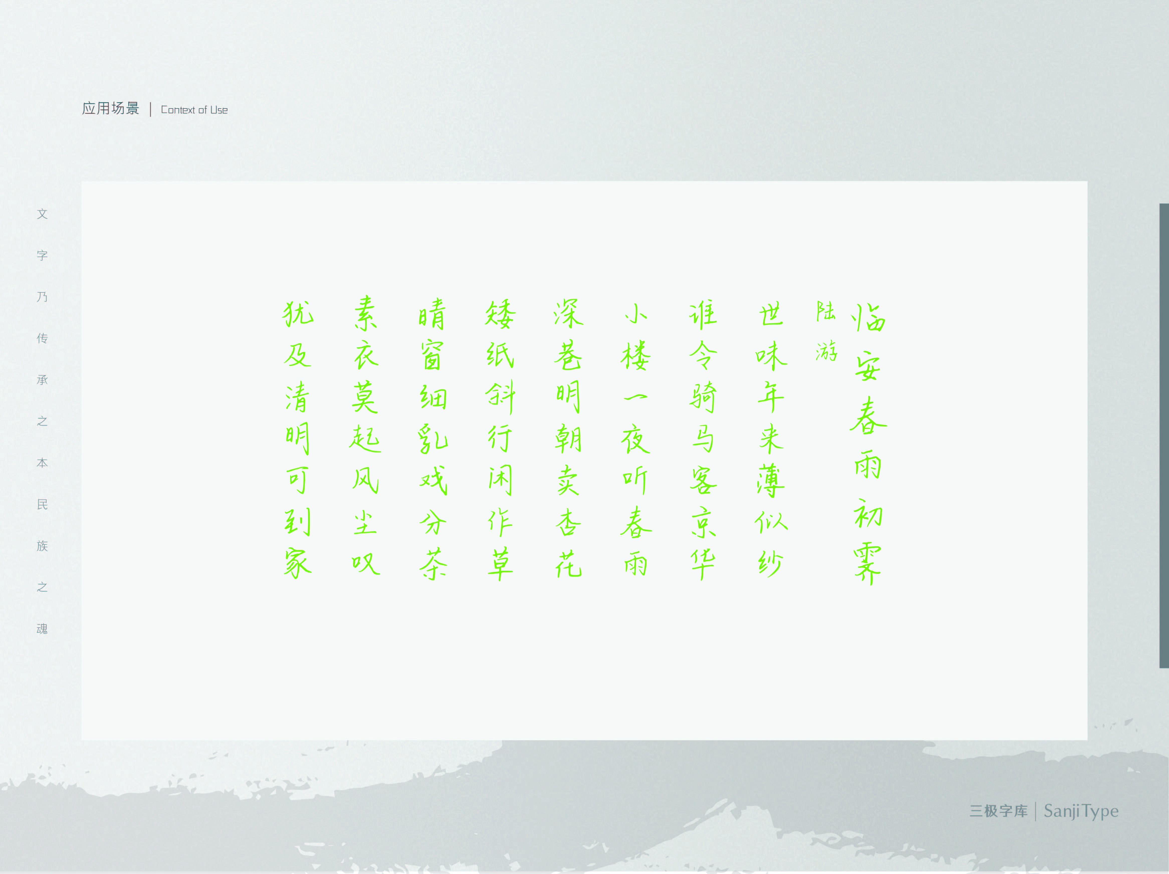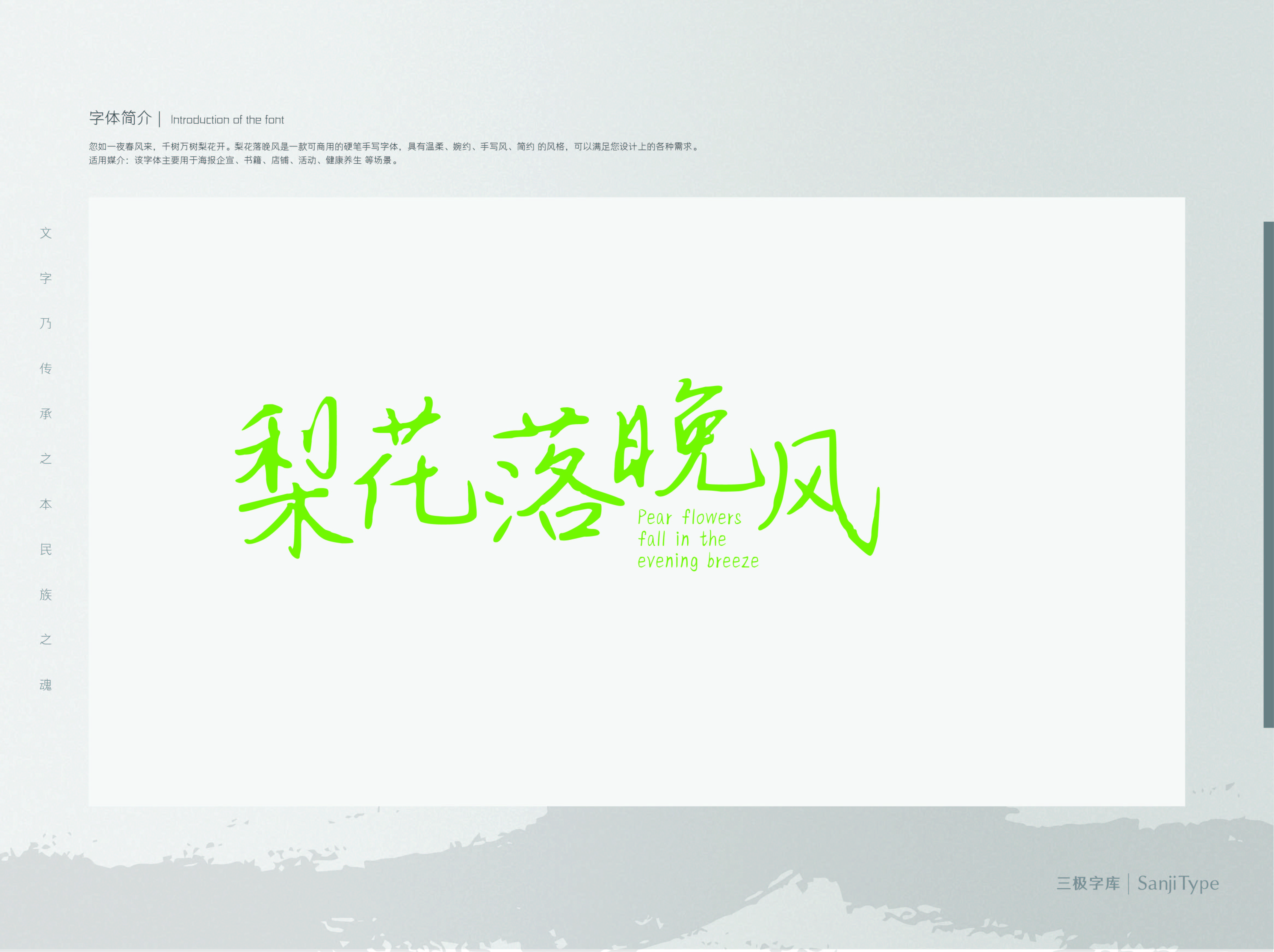 中宫收紧、笔画行云流水、线条飘逸流畅,是这款字体的艺术表现亮点。硬笔书写,笔锋以硬朗的方式呈现,更添英气。适用于现代诗歌、短文以及文化、商业类品牌的排版设计。