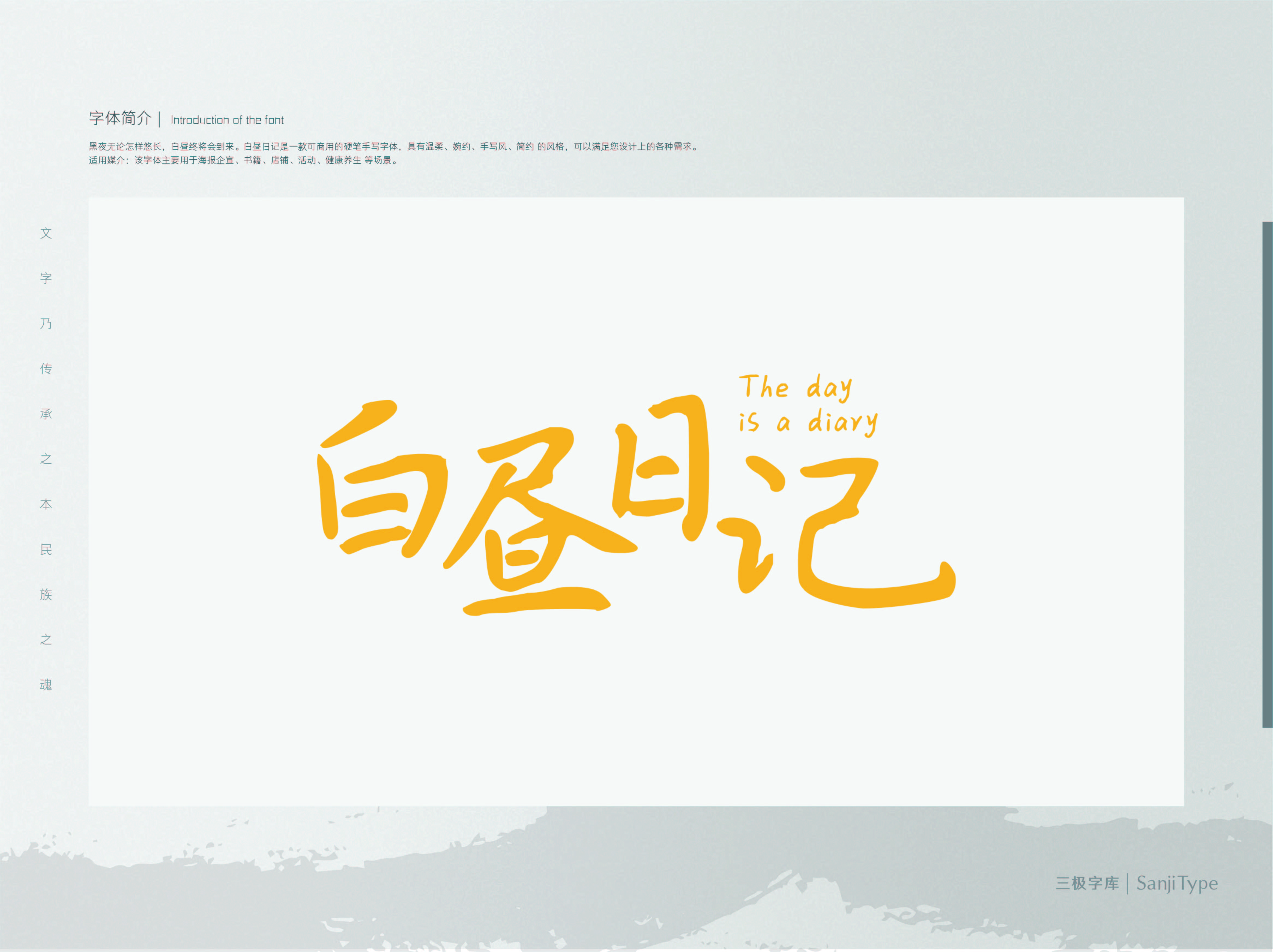 白昼日记是一款能够胜任标题与正文的字体。它线条简洁,带有宋体字装饰感,结构清晰,适用于书刊、品牌广告和产品包装设计,以及社交网络的个性化用字。