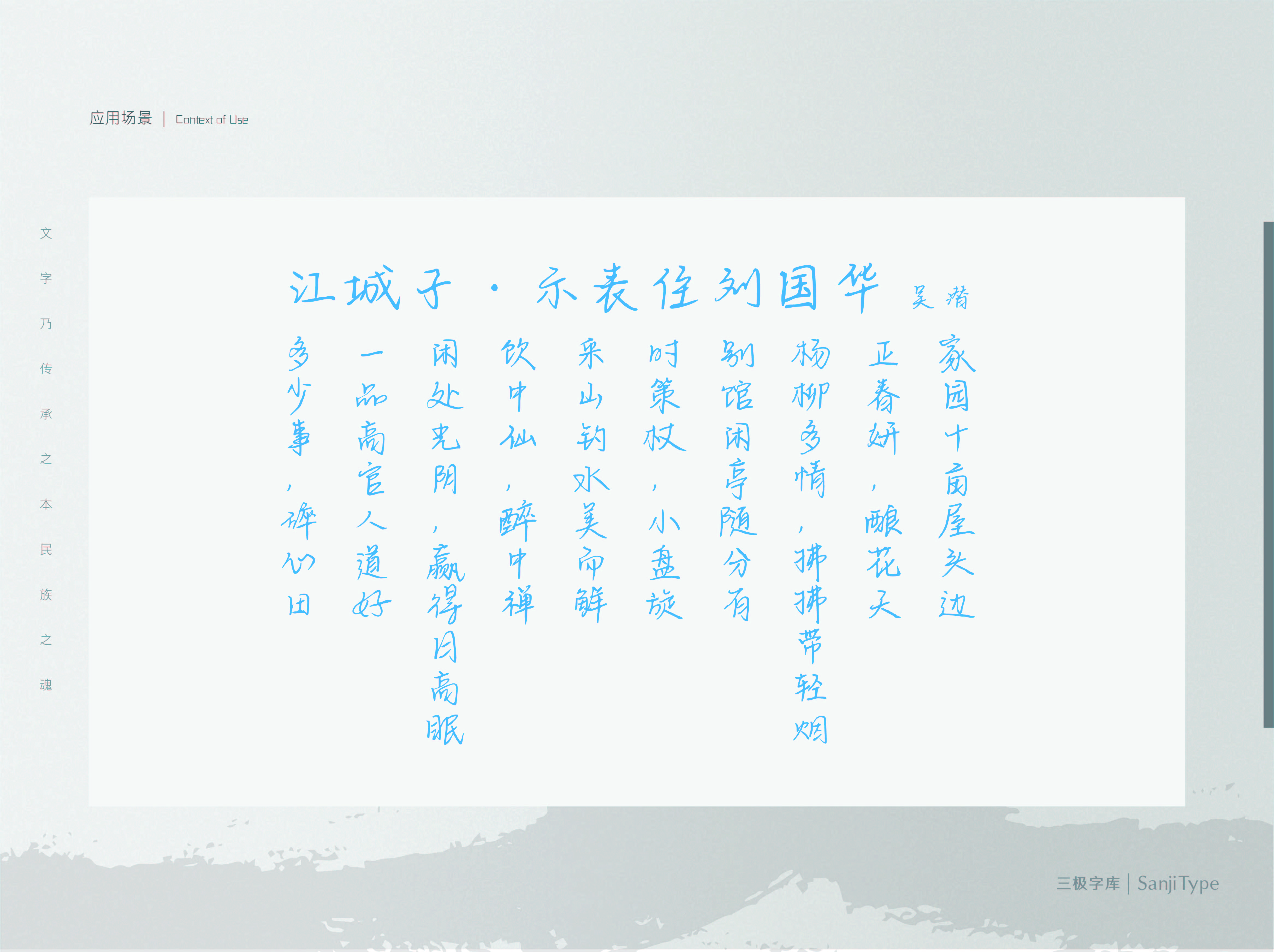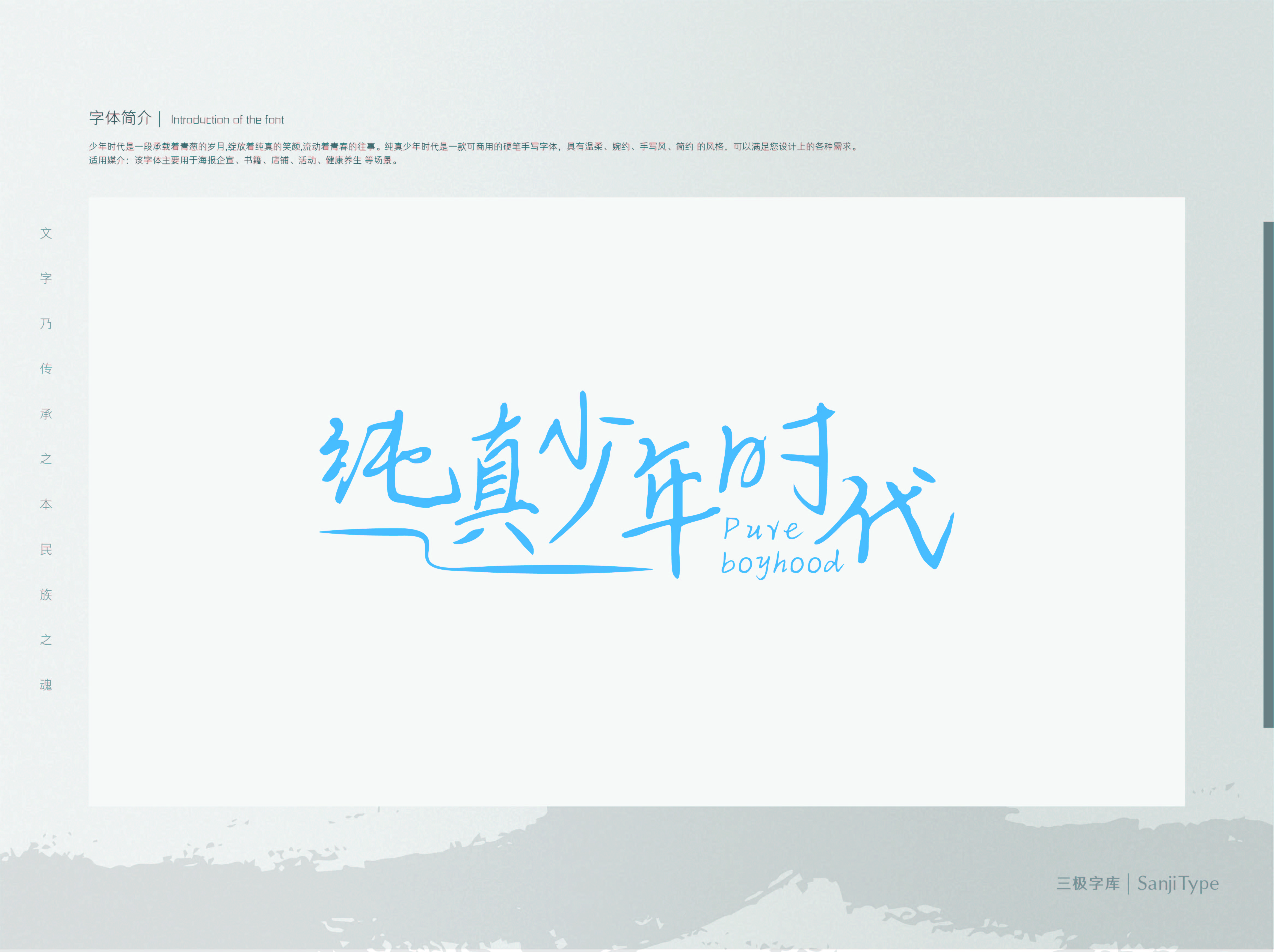 纯真少年时代是一款清爽随性的手写体。笔画细致,撇捺跨度大,连笔自然,整体给人一种干净利落、清爽文艺的感觉。适用于春夏季主题、现代诗歌短文的排版以及文化、商业类品牌的广告语设计。