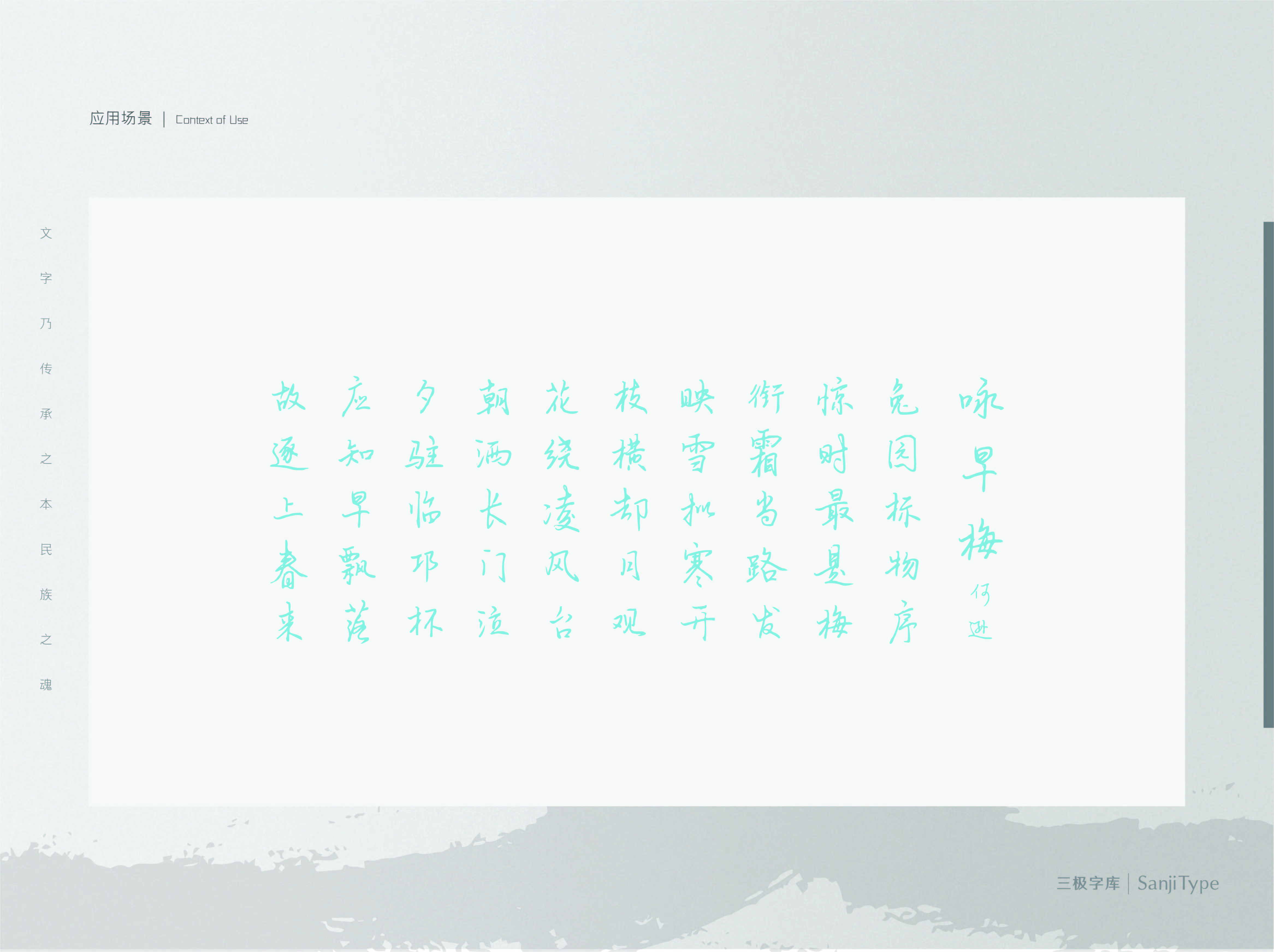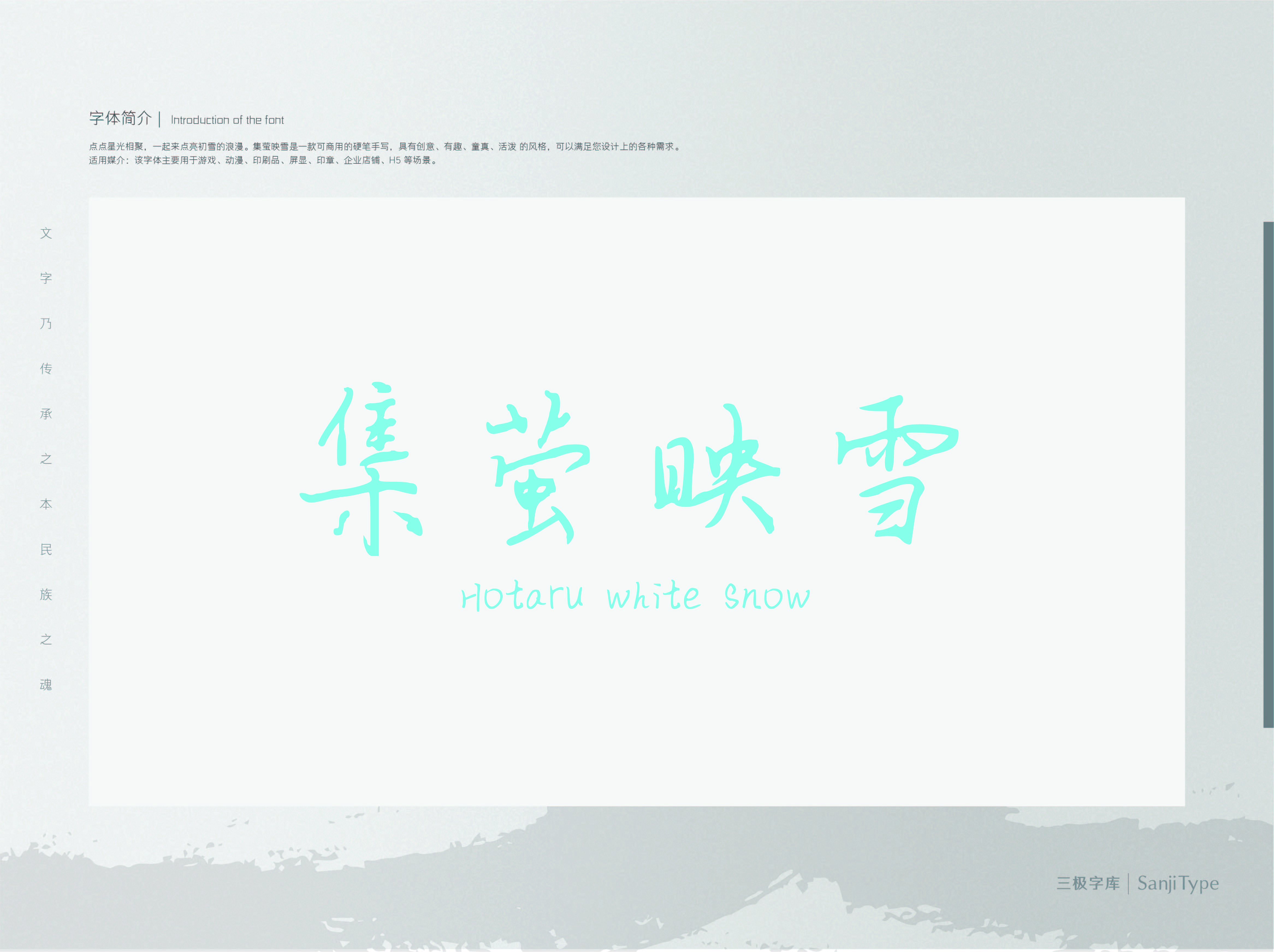 集萤映雪是一款富有诗意和温度的手写字体。中宫紧实,省略笔画的设定带出别致诗意,笔画结构规整易于阅读。适用于情感类短句、美文排版场景,可以有效增加版面感性、文艺、青春之感。
