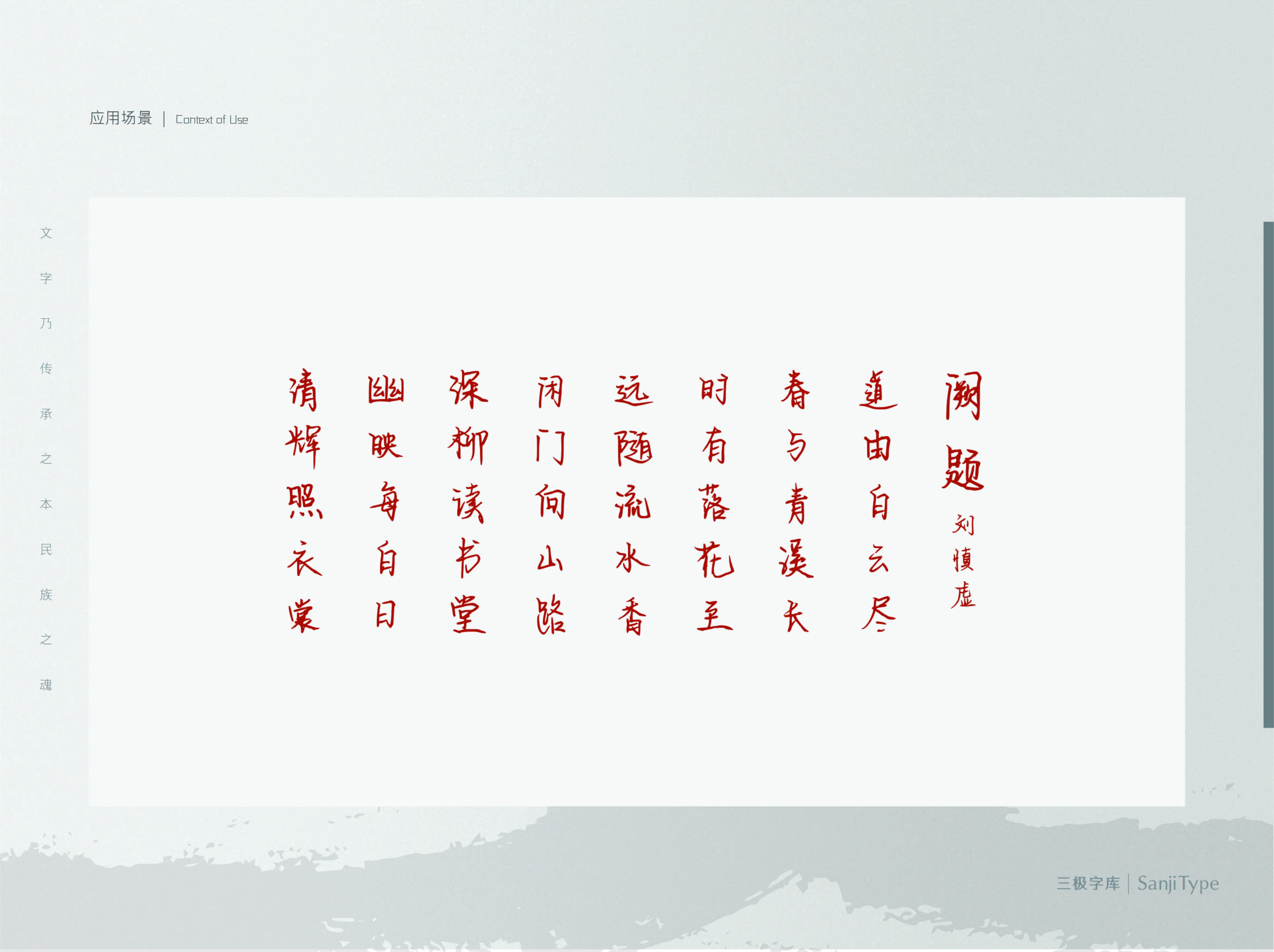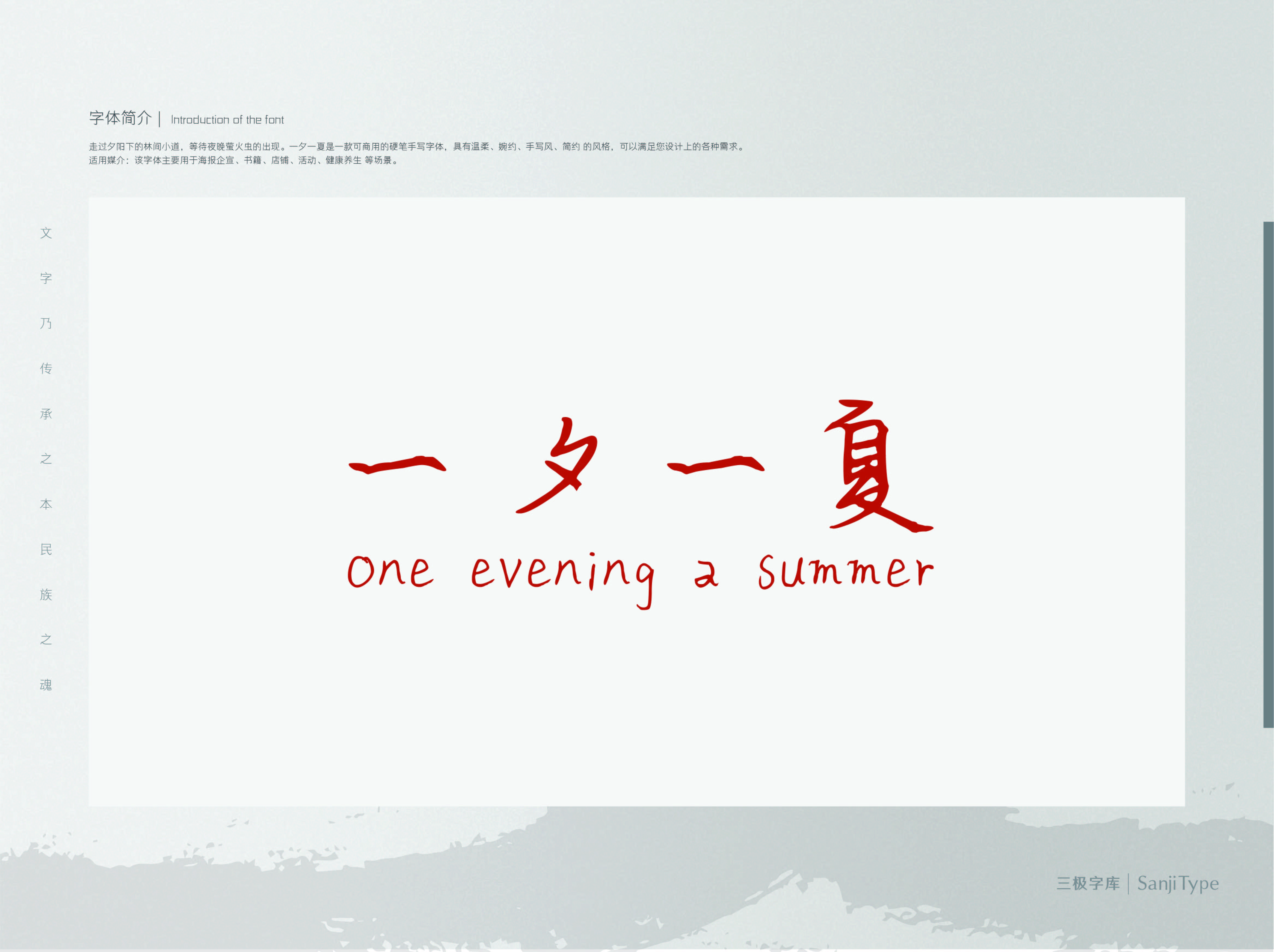 一夕一夏,这款字行笔节奏有徐有急,具有质朴清新的手写特点。笔锋纤细凌厉,点划粗细错落有致。作为标题用字时,张显格调,作为正文用字时,清晰美观。适用于ins风排版、美妆服饰、高端医美行业等设计场景。
