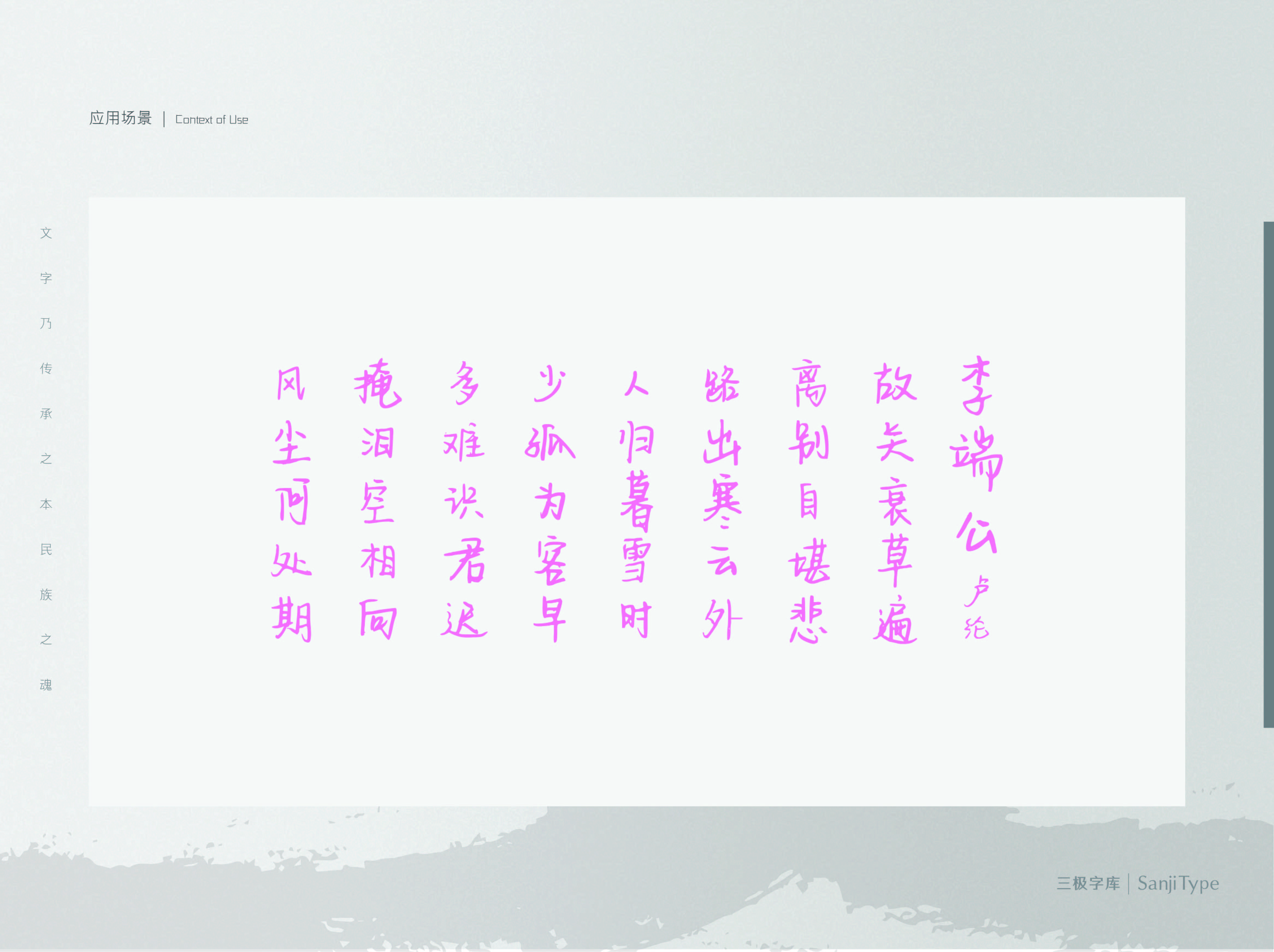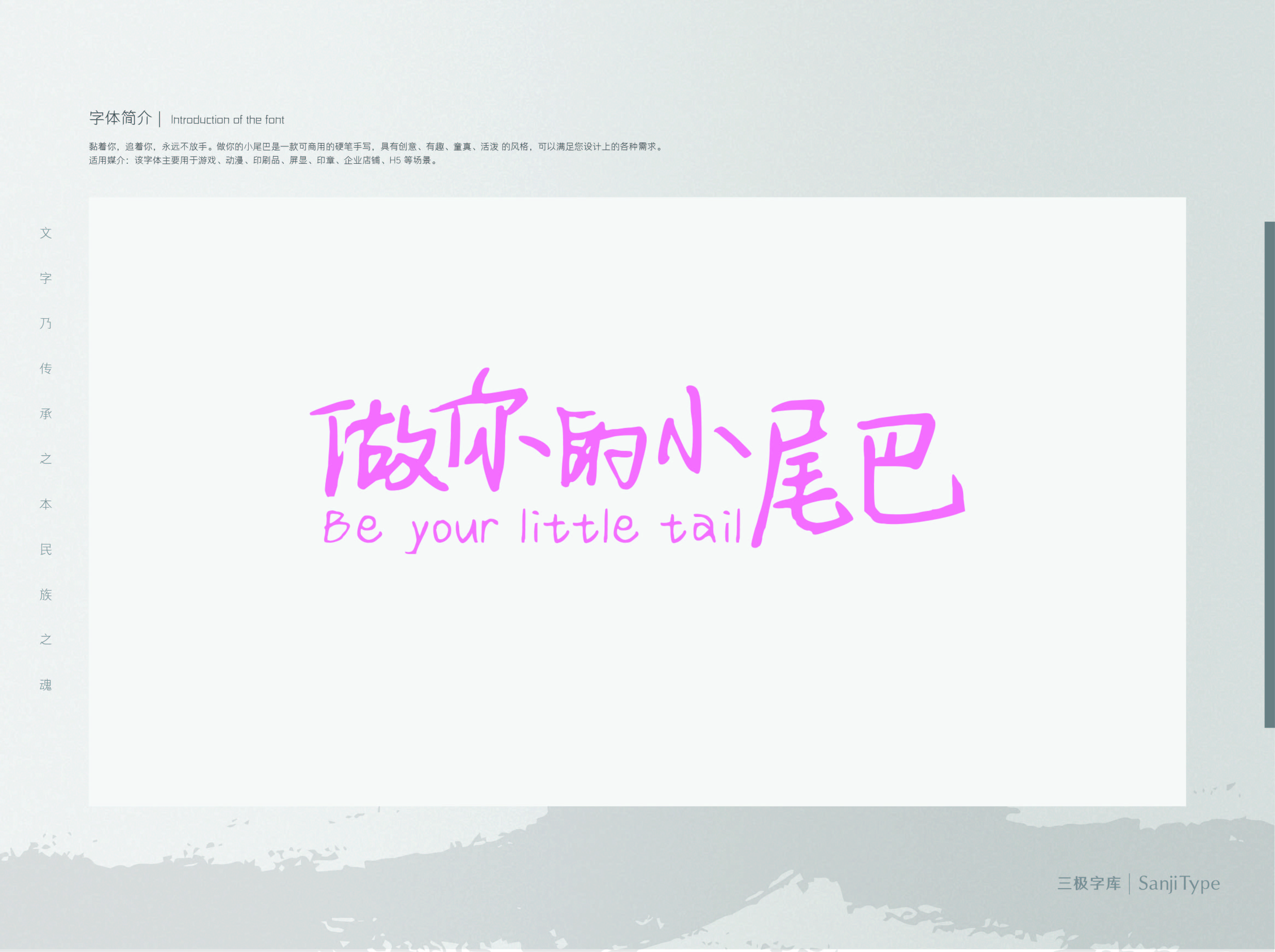 字形流畅,连笔带出“做你的小尾巴”的自由随性之感。笔画平衡美观,整体文艺细腻。适用于文艺类的书刊、品牌广告和产品包装设计,以及社交网络的个性化用字。