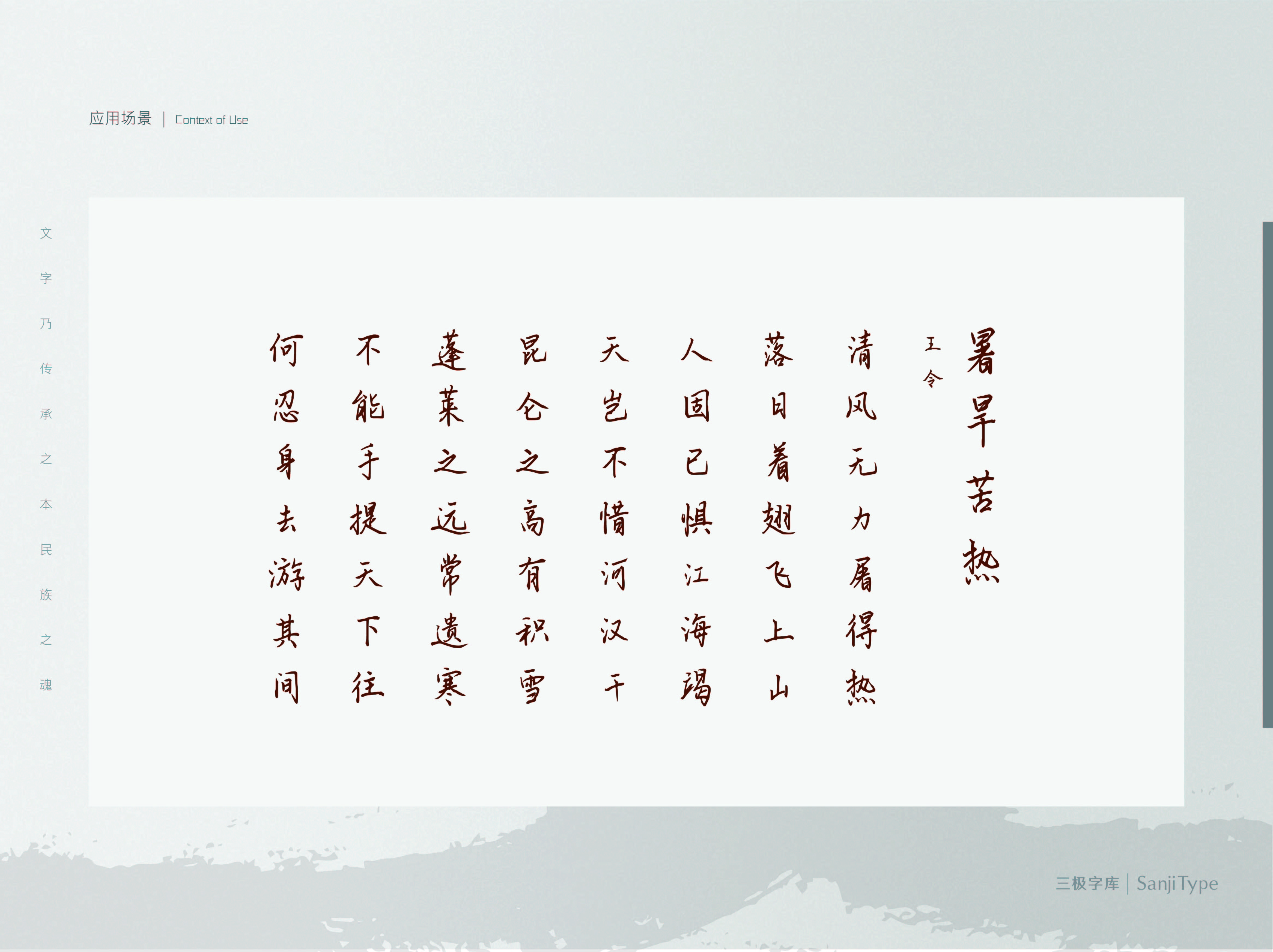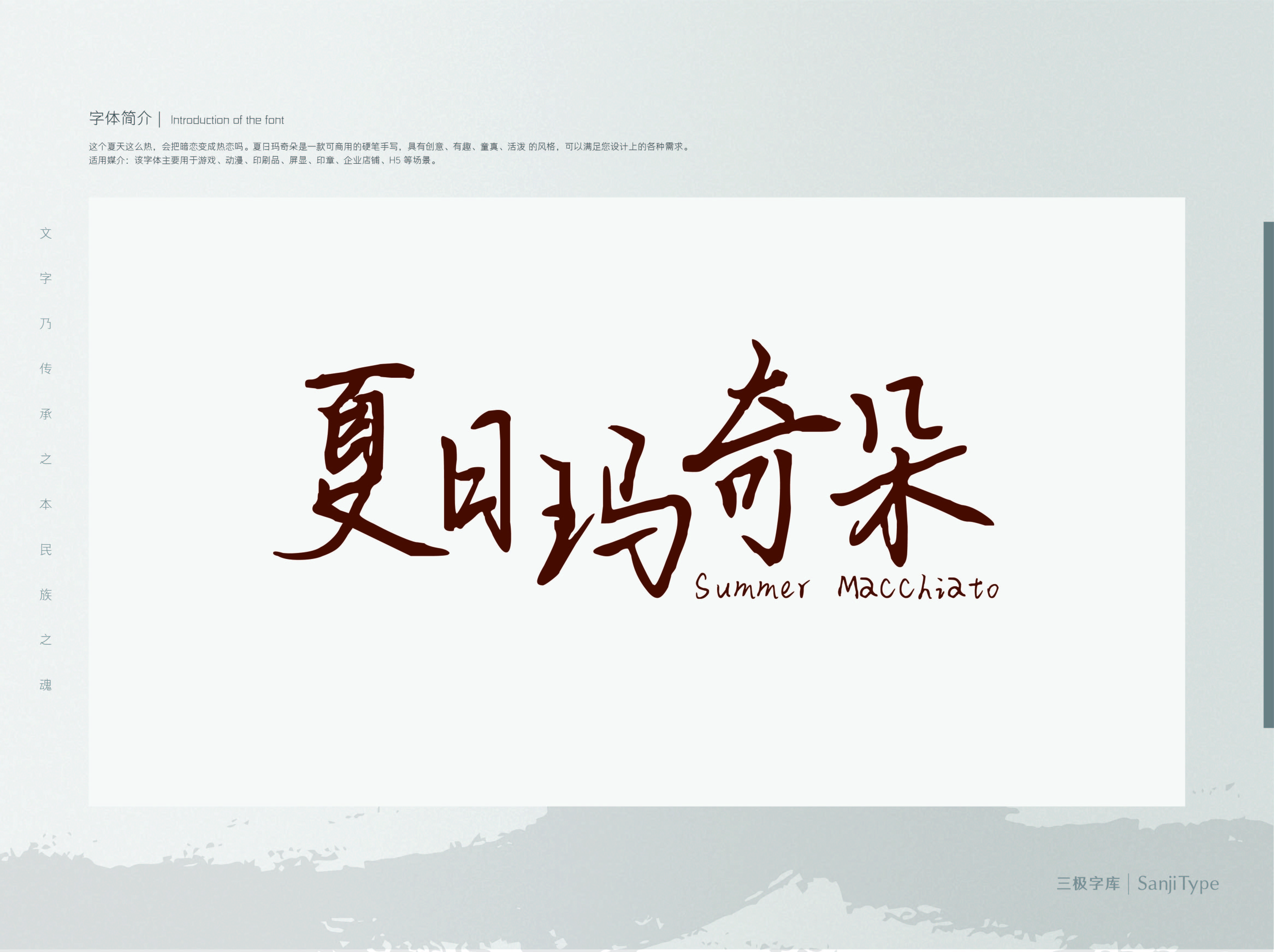 夏日玛奇朵是一款中宫收紧,笔画率真,带有青春气息的字体。撇捺外扩,勇于做减法。适用于青春活泼、文艺清新风格的广告标题、影视海报,个人社交平台封面等场景。