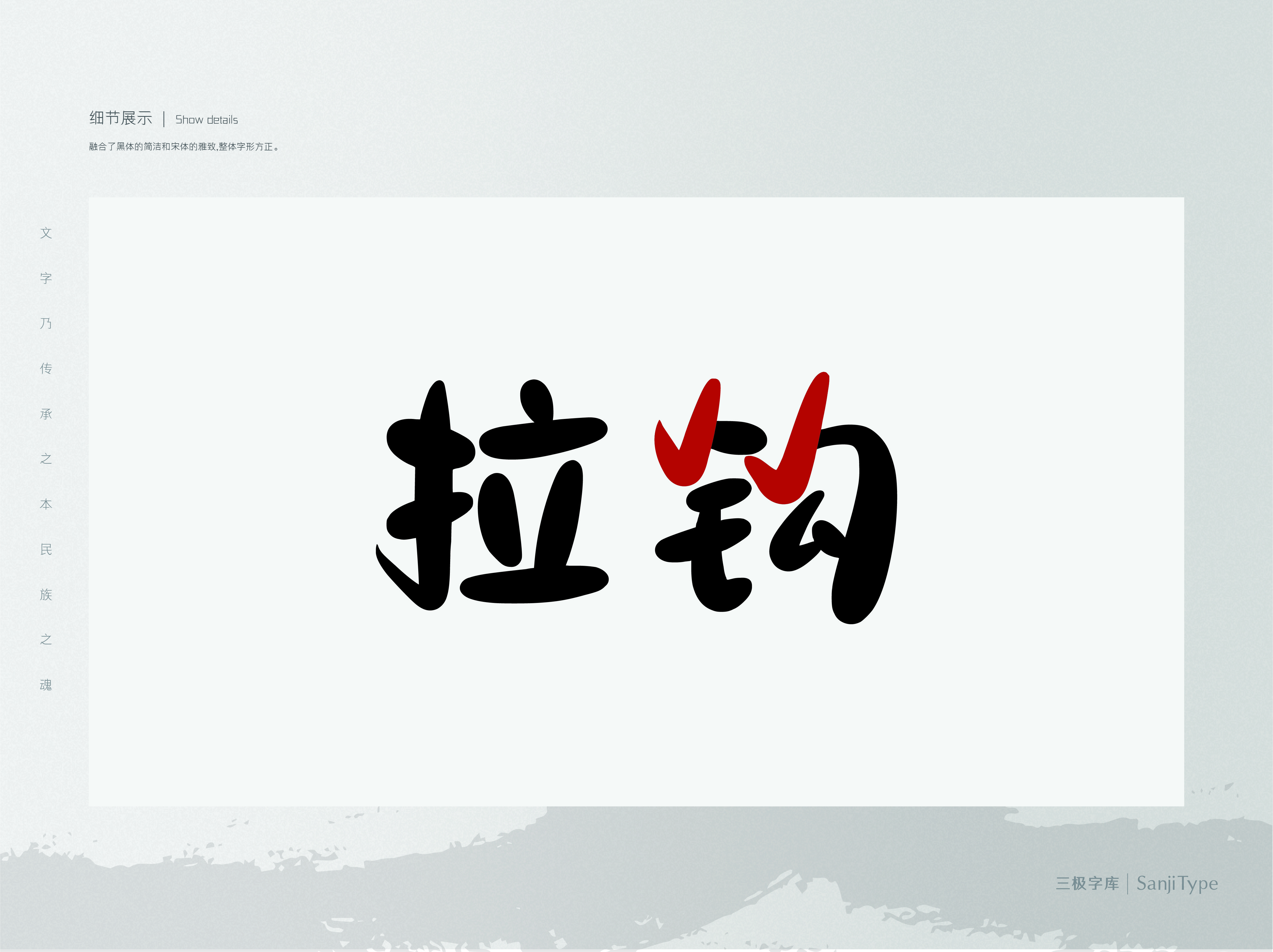 三极拉钩体,笔画较粗,起笔、收尾带钩,有很强的装饰性,富有强烈的节奏感,寓意拉钩上吊,一百年不许变。适合海报标题、片头、产品包装设计品牌宣传等设计中。