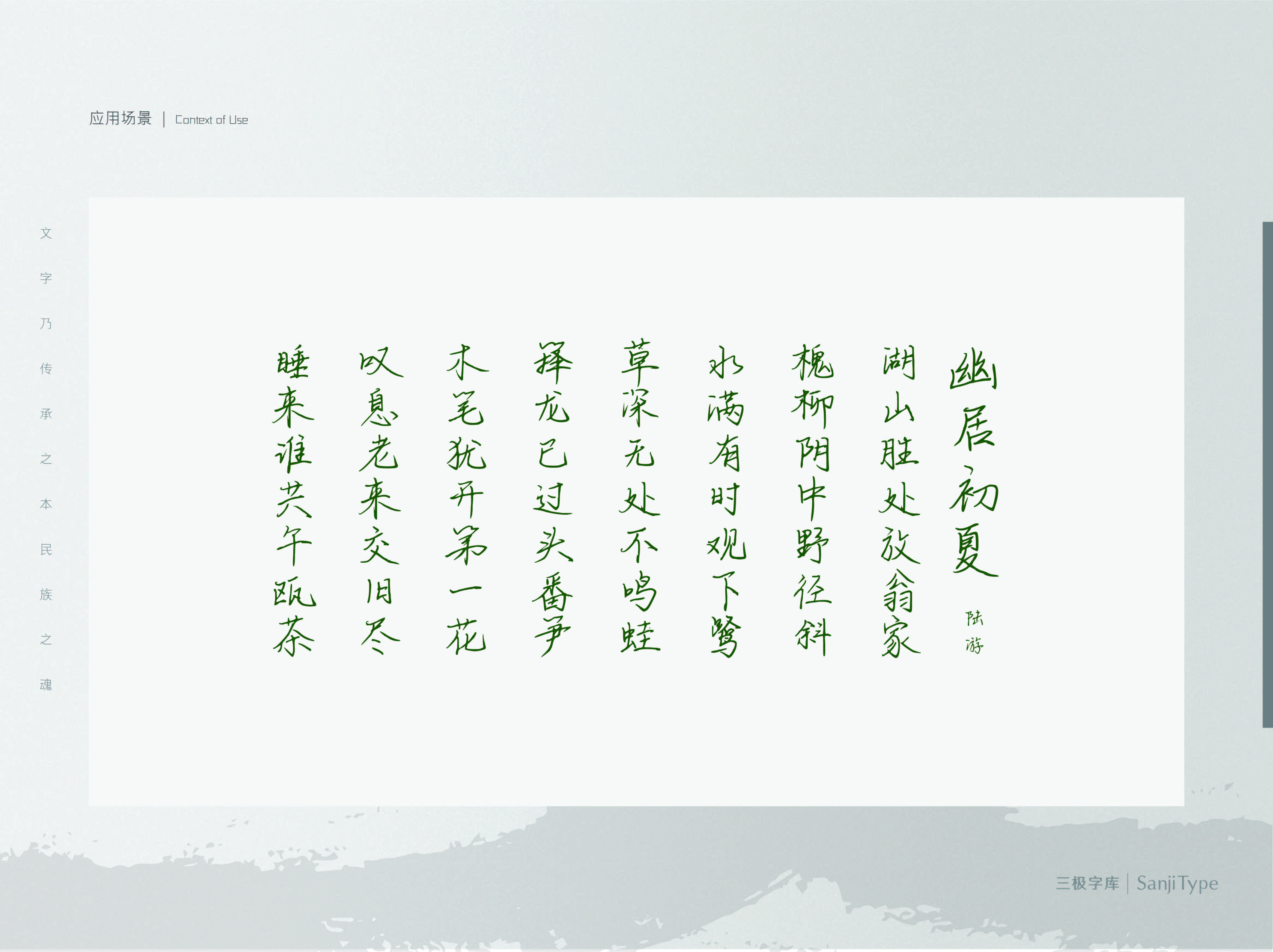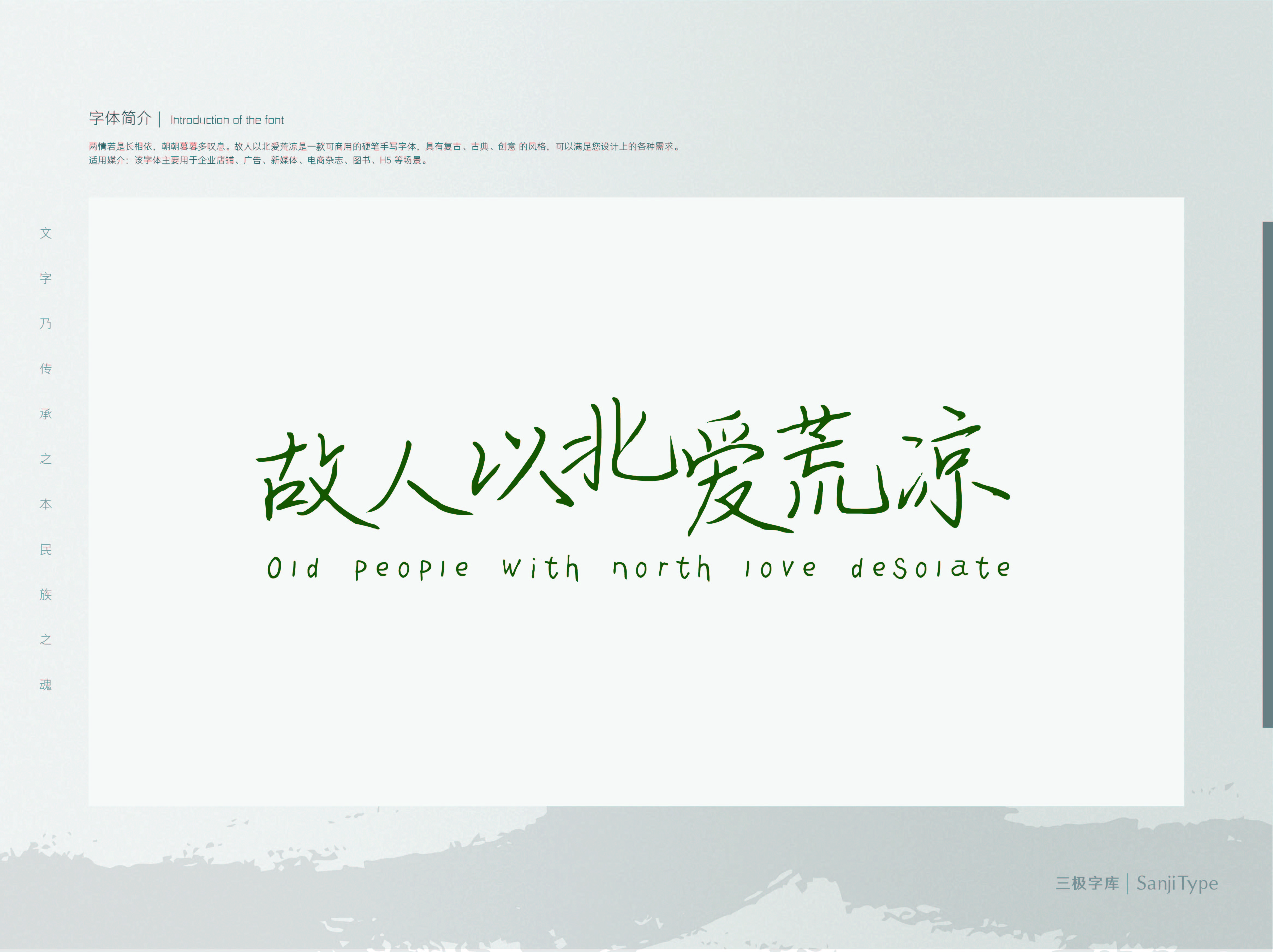 该字体撇捺舒展,线条流畅连贯,收笔带出锐利笔锋,具有书法般视觉感受。应用于经典文艺类的书刊封面、品牌海报中,能够发挥出该字体的最大视觉效果。