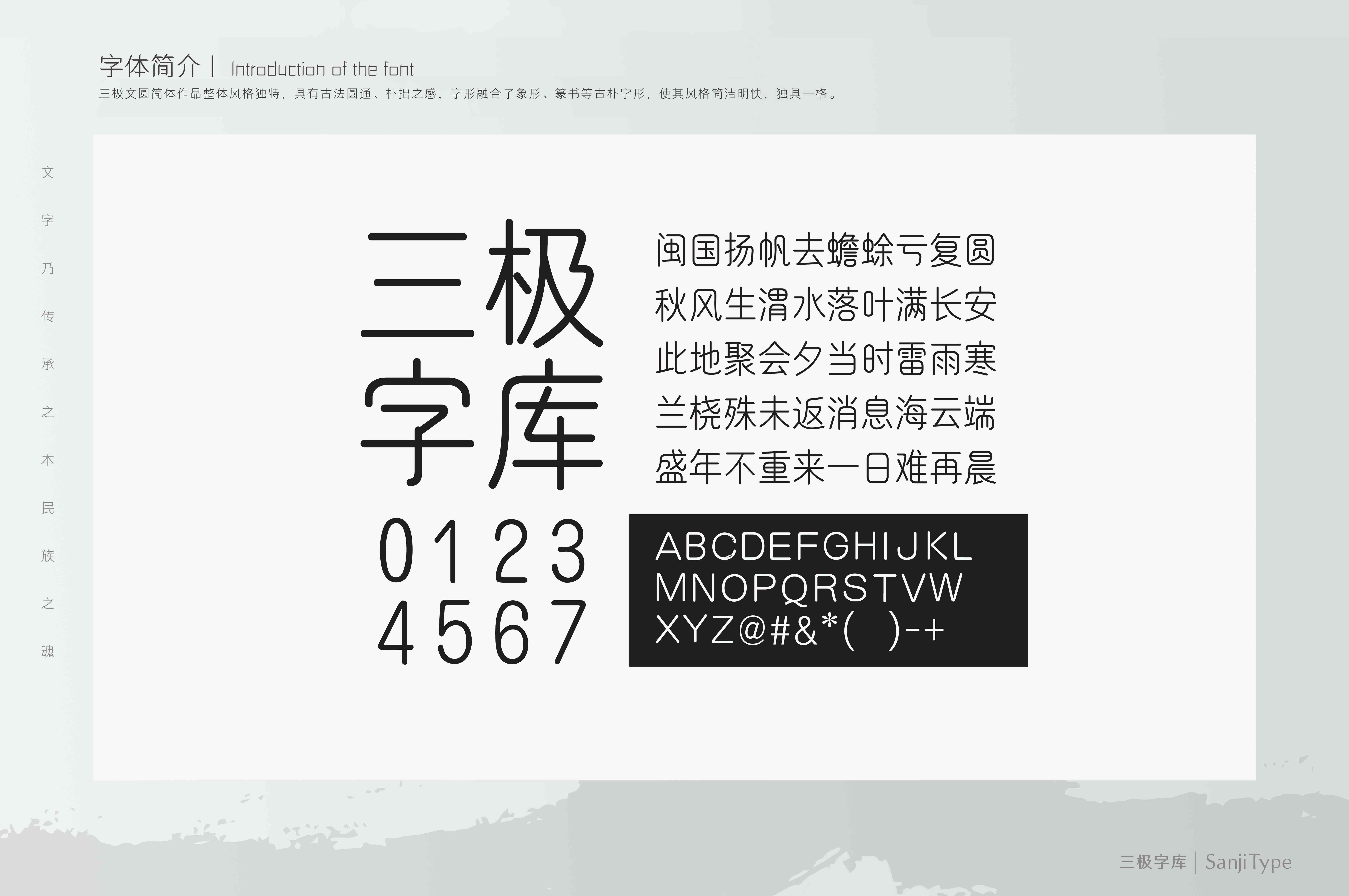 三极文圆简体作品整体风格独特,具有古法圆通、朴拙之感,字形融合了象形、篆书等古朴字形,使其风格简洁明快,独具一格。字体轻巧简洁,古拙而不凡。粗细匀称,起笔收笔为圆头,折、钩、撇捺转折圆润饱满,具有古拙婉转的气质。视觉效果简洁易识别,实用性强。本作品适用于传统印刷媒介的标题与正文排版,尤其适用于古典、工艺类型行业和书籍装帧。
