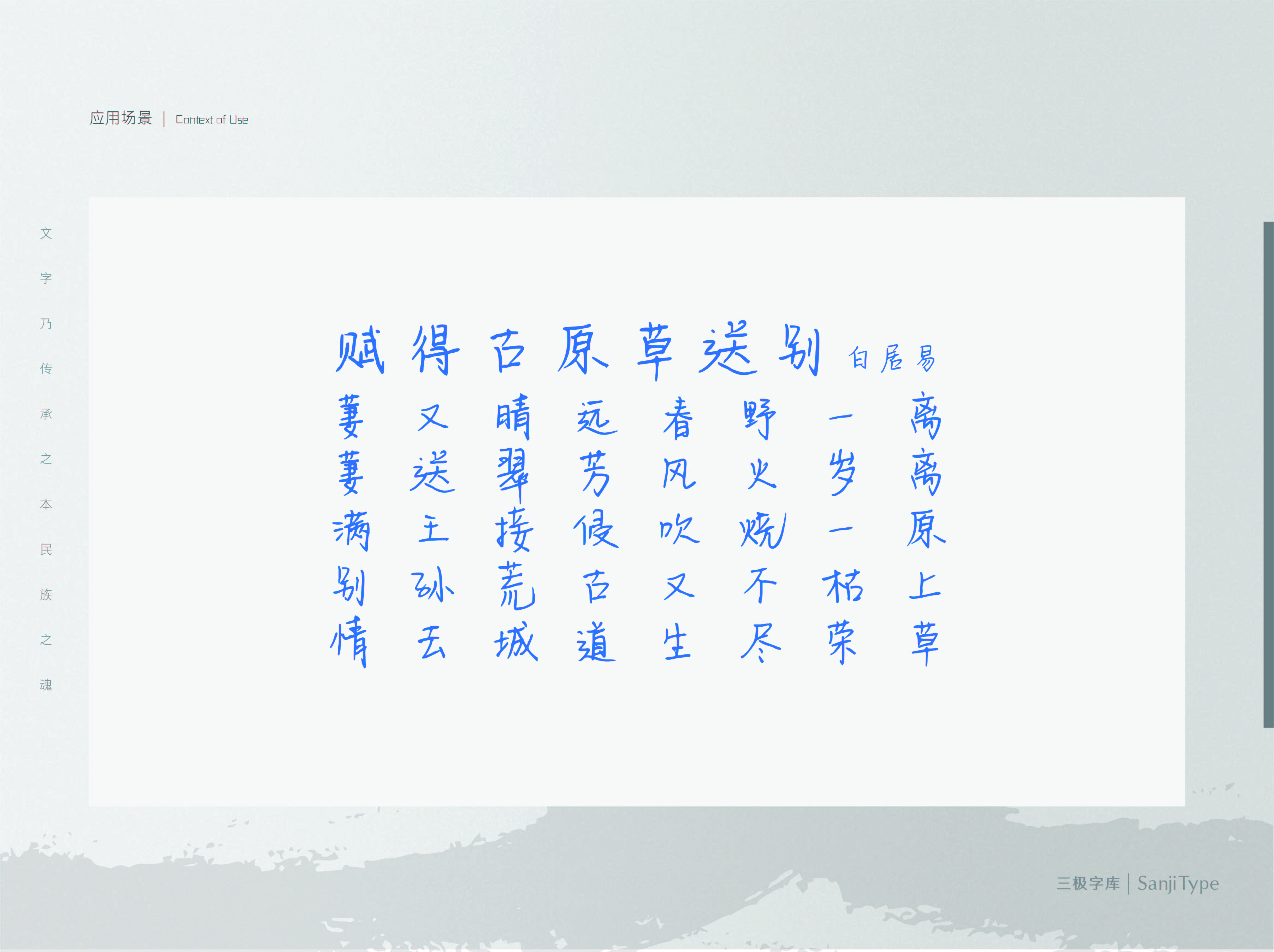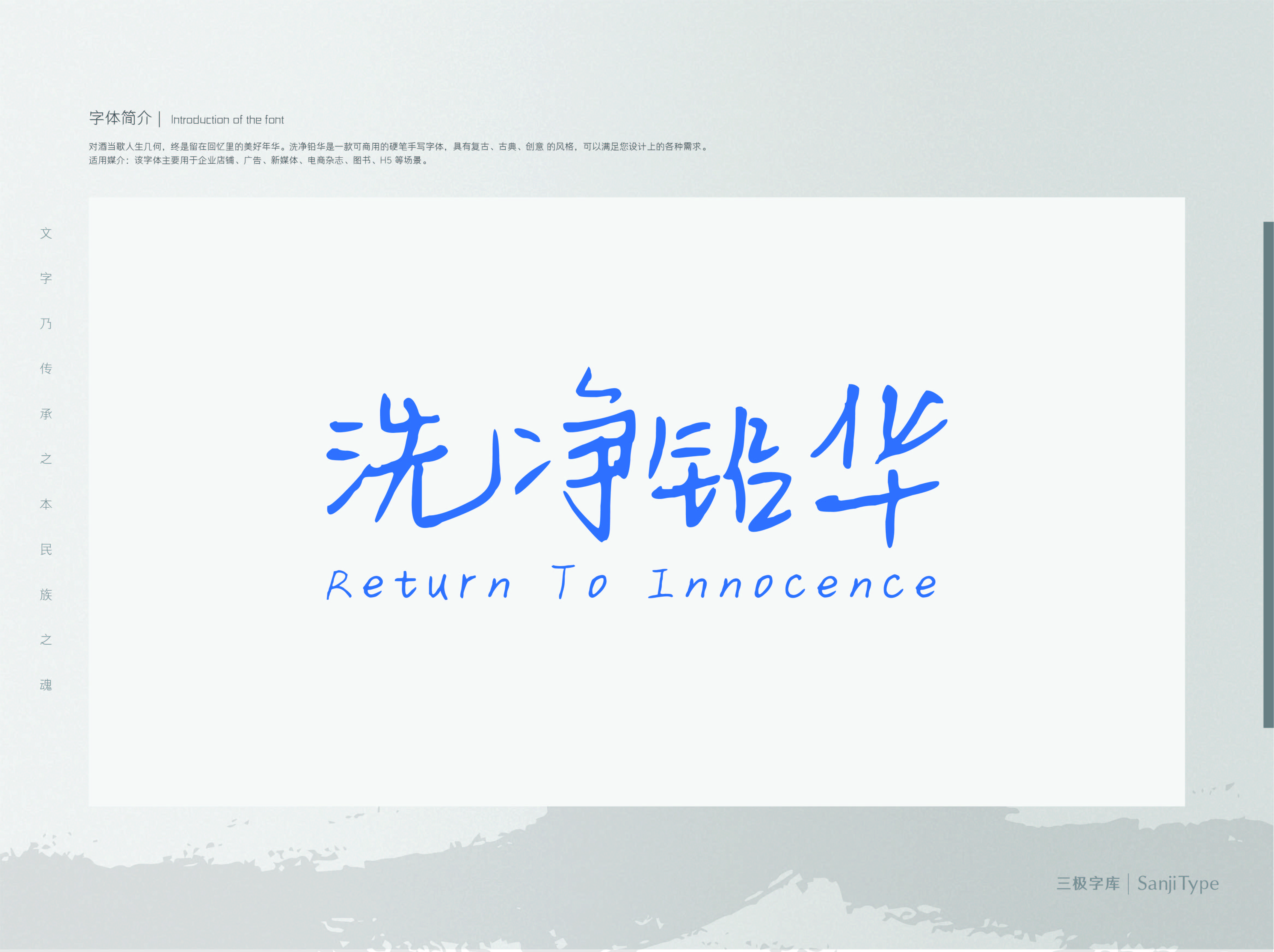 洗净铅华是一款精致利落的手写体。笔画纤细,竖勾有力,没有多余的装饰,整体给人一种干净利落、精致清爽的感觉。适用于冷色调、中性等主题设计,给予画面大面积留白时更能凸显该字体的视觉张力。