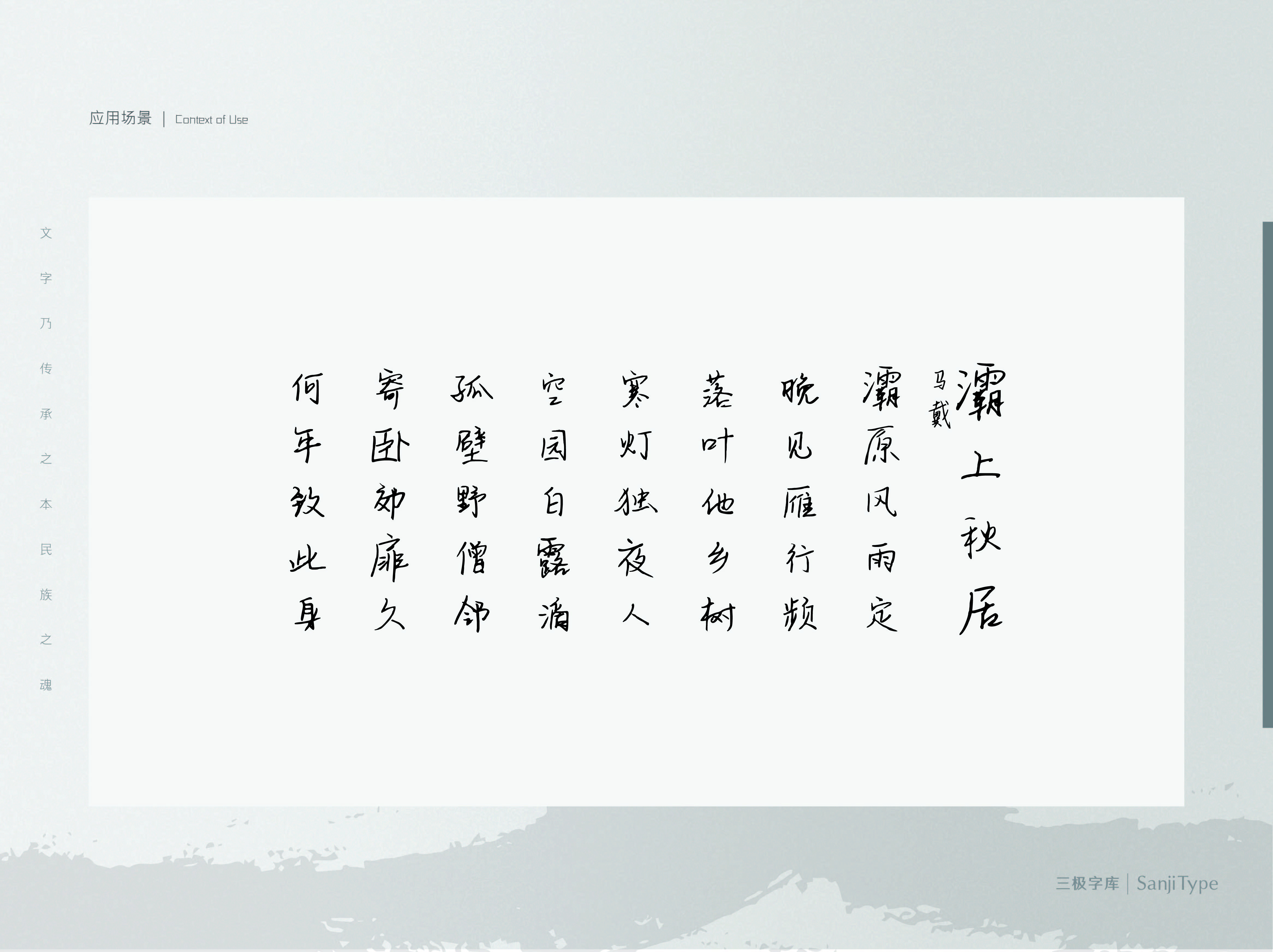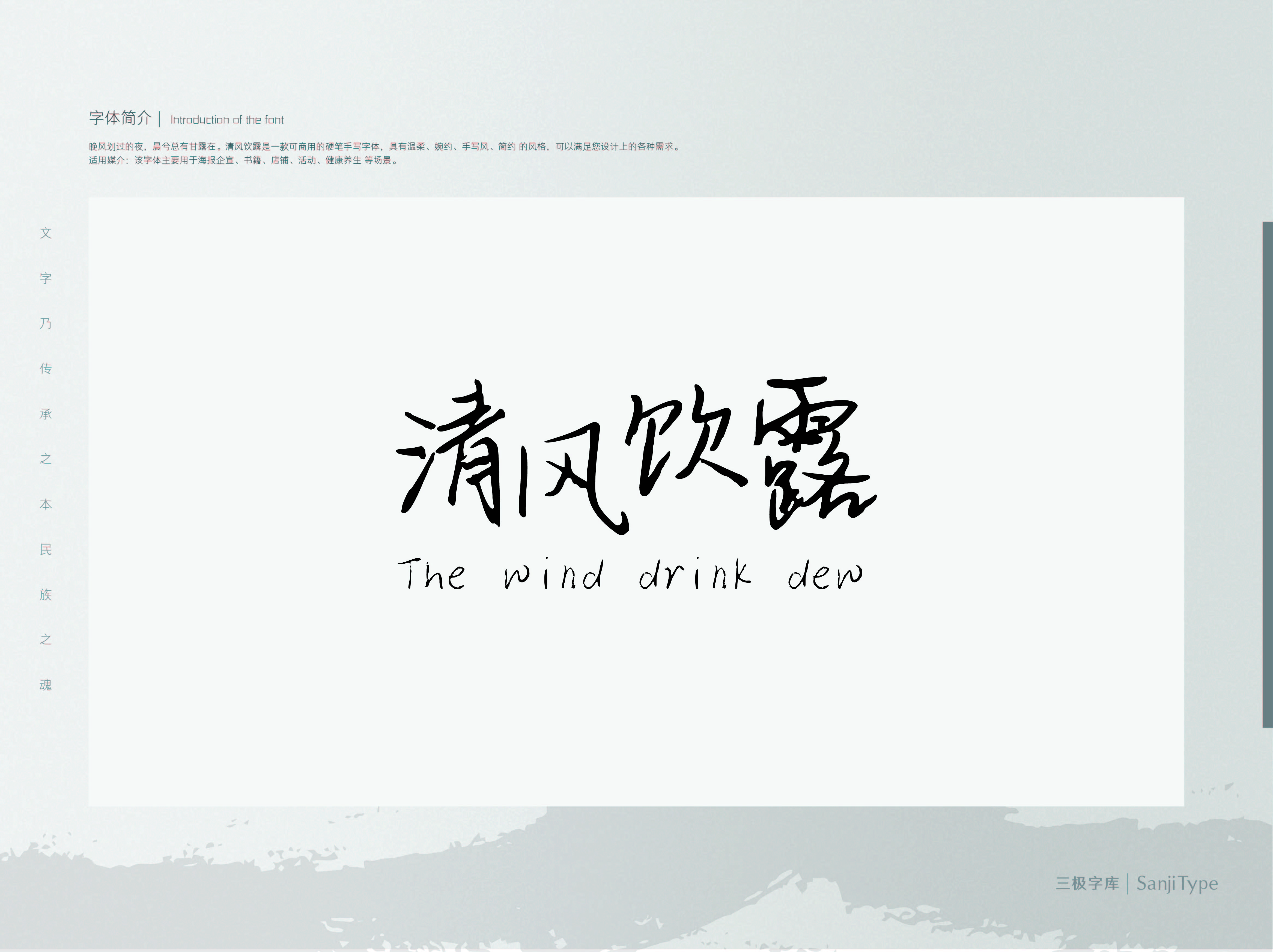 清风饮露这款字体予人一种文人风骨之气,笔致行云流水,结构严谨有变化,起收笔间彰显着书法笔韵。适用于名人名言、引经据典、品牌广告语等特殊段落中,可以有效增加画面的视觉张力。