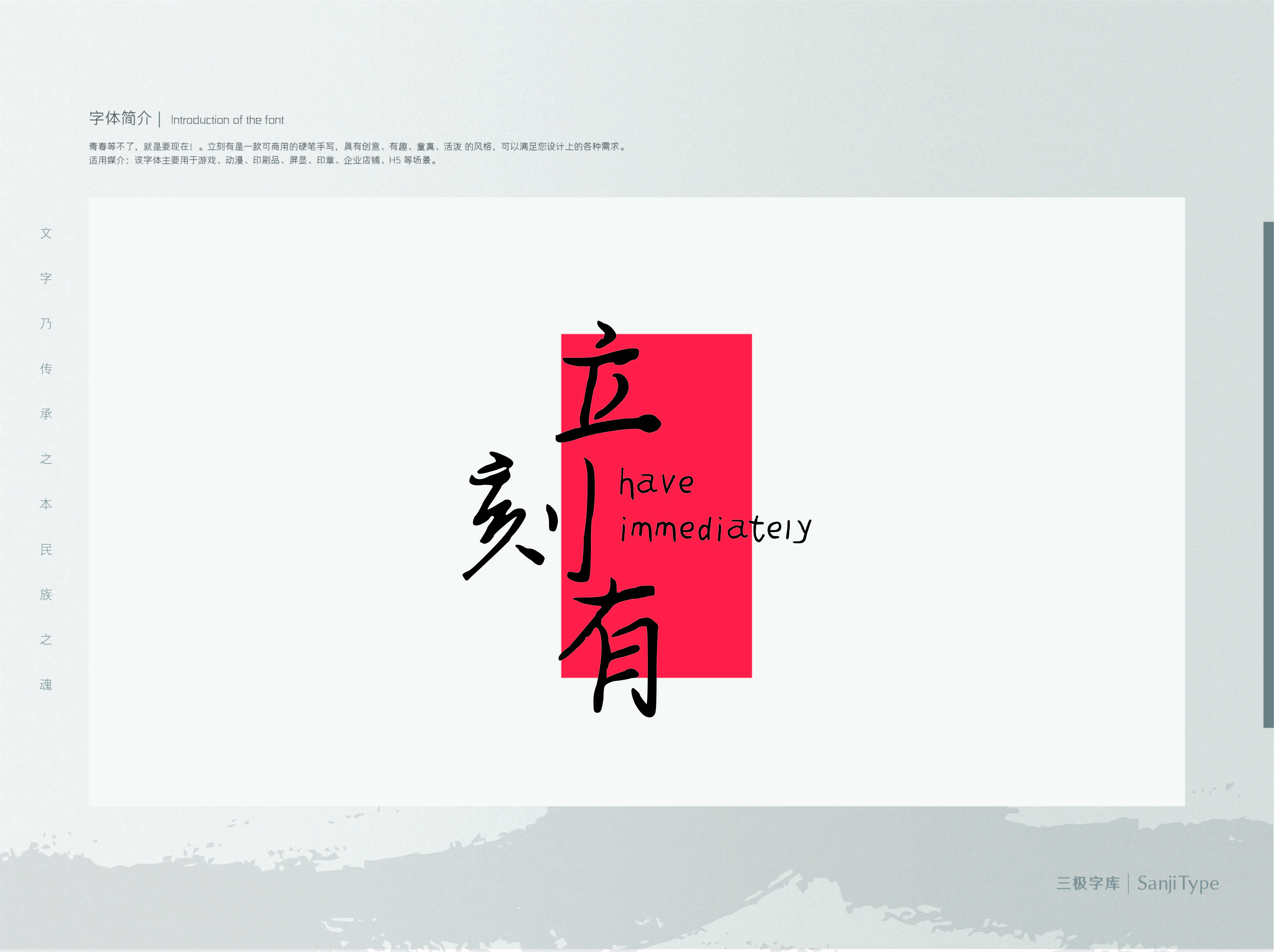 立刻有,是一款喷洒青春活力的手写字体。它笔画张弛有度,字面大小错落有致,拥有独具一格的热情魅力。适运用在文艺类设计、品牌广告和社交图片中,能够有效美化画面。
