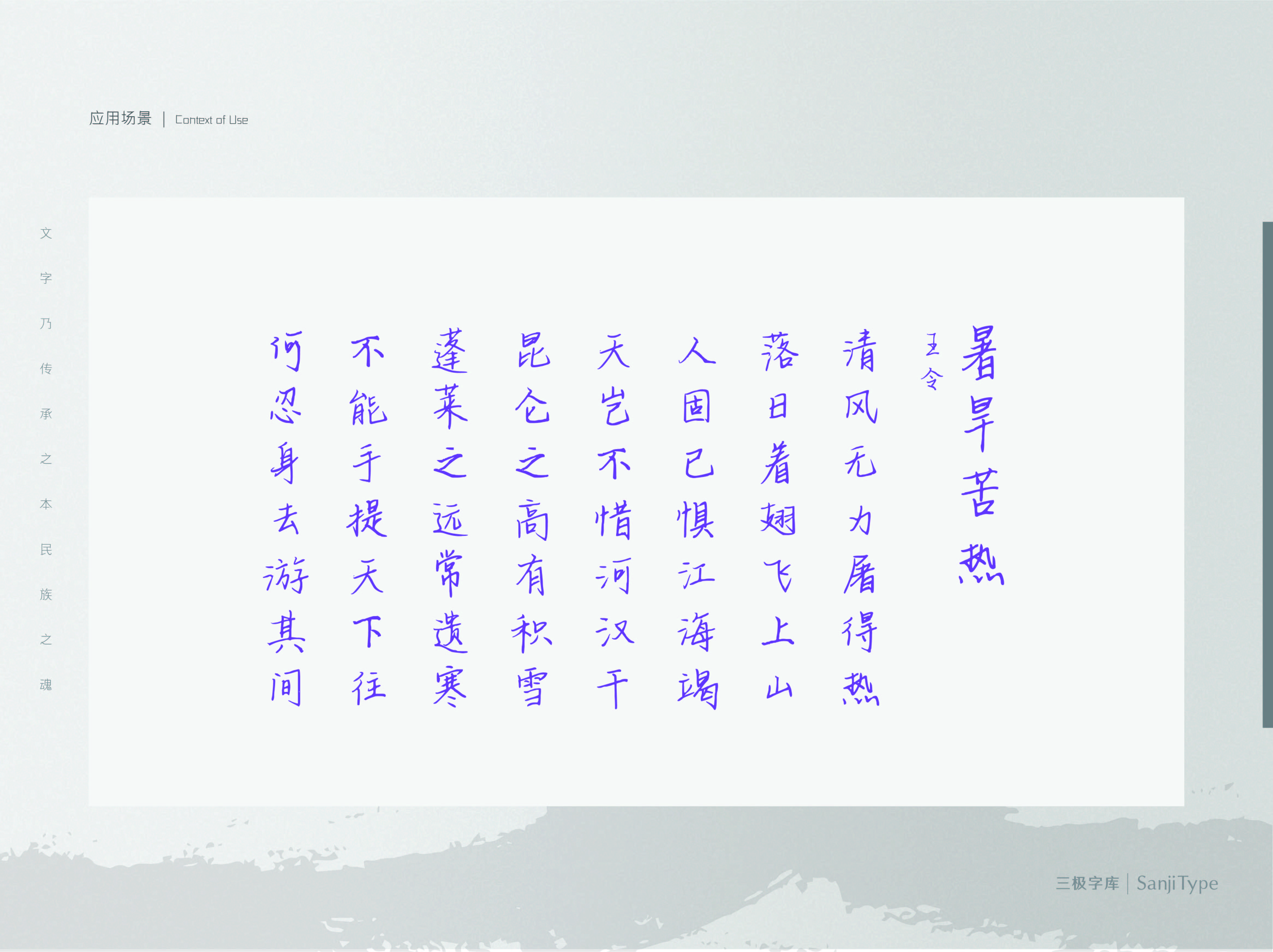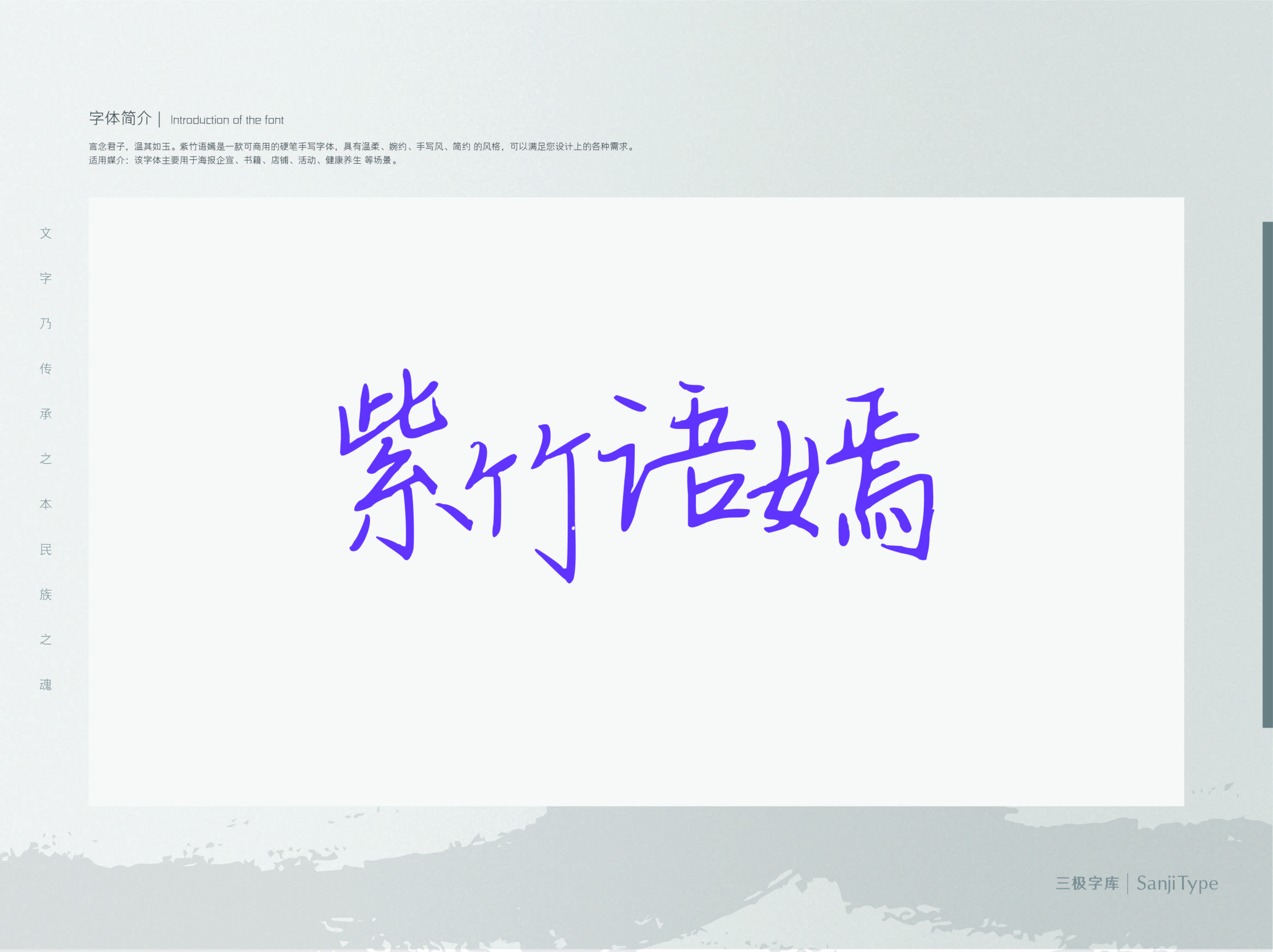 紫竹语嫣这款字部件线条简洁,收笔圆润,结构清晰,能够胜任标题与正文用字。适用于书刊、品牌广告和产品包装设计,以及社交网络的个性化用字。