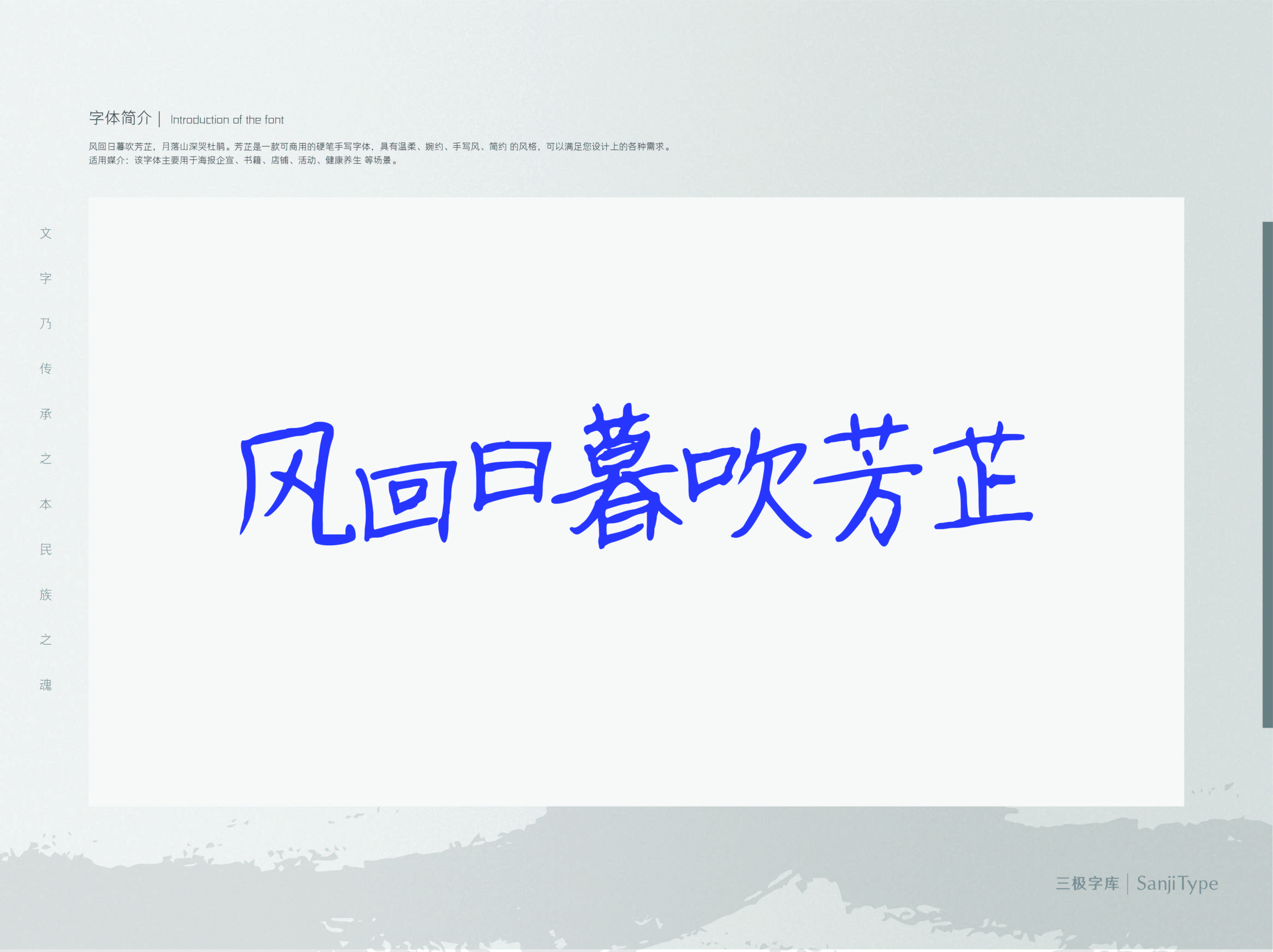 芳芷是一款亲切随性的手写字体。该字体字形宽,横笔延伸,笔画造型富有细节变化,亲和力十足。适用于温暖、治愈、公益等风格的设计场景。