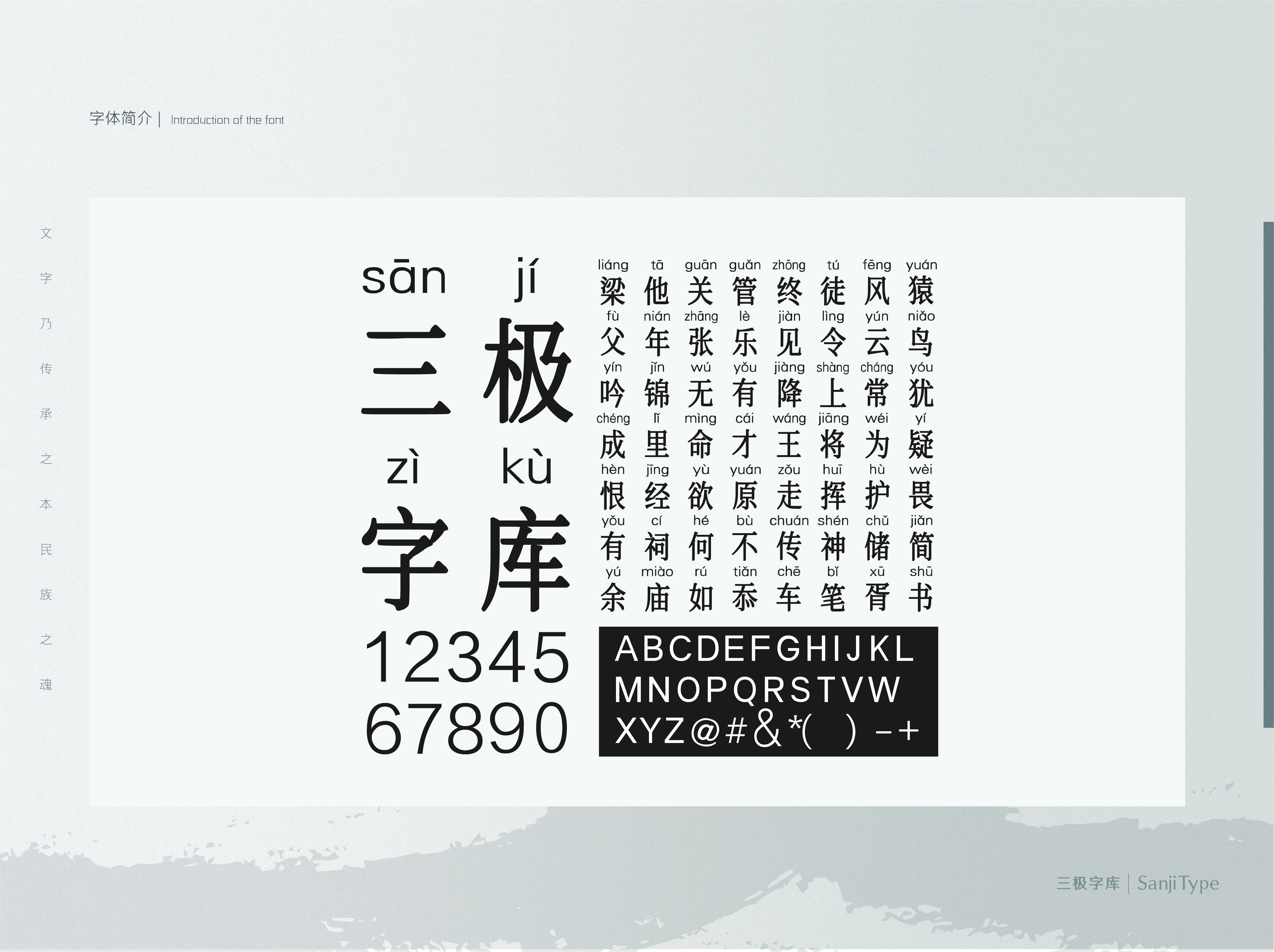 三极粗宋拼音简由宋体字形加拼音字母组成,中宫收紧,笔画中粗,字形瘦高。宋体特征明显,工整规矩,笔画清晰,易于阅读。正文粗宋搭配简洁的拼音字母,更添韵味,阅读性极强。适用于少年儿童类的书刊、文艺类的书刊、品牌广告和产品包装设计,以及社交网络的个性化用字。
