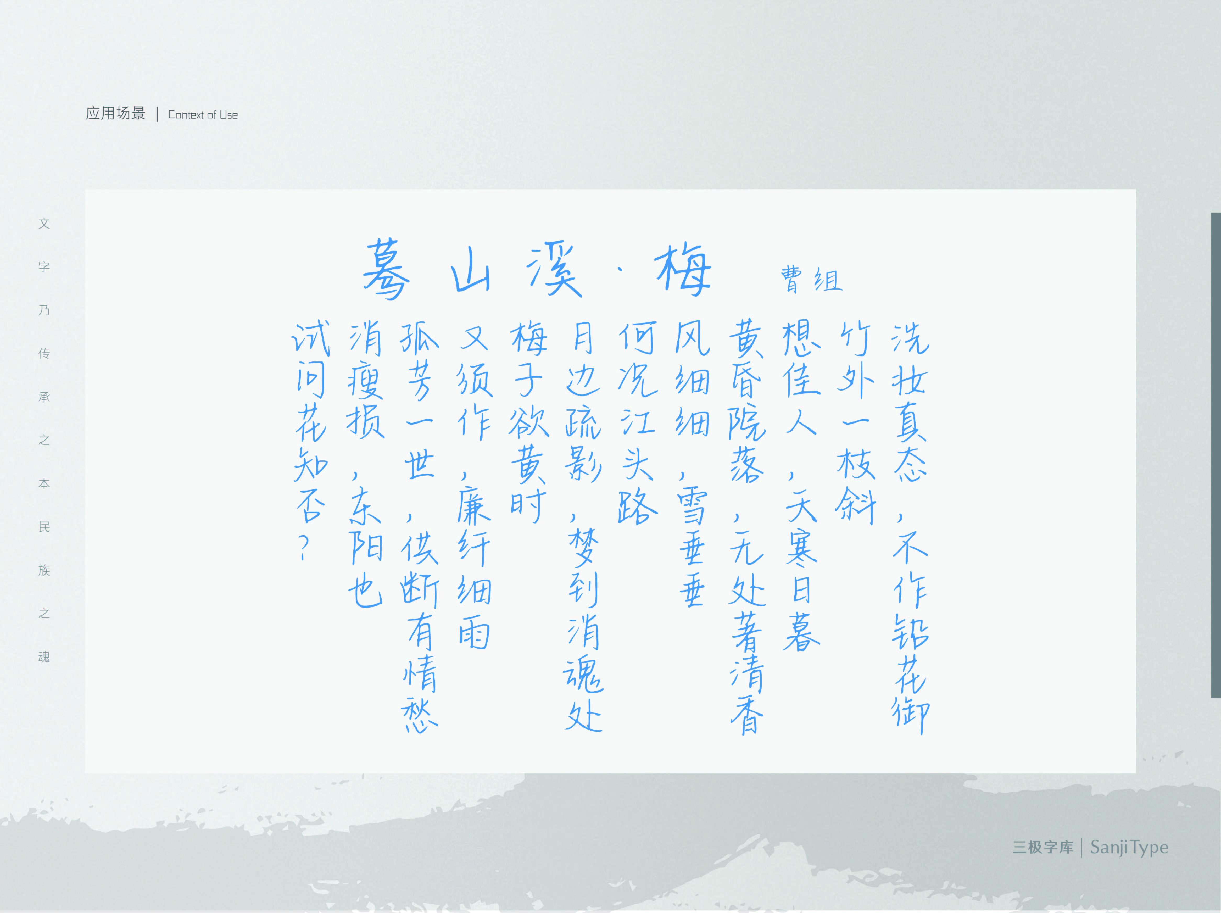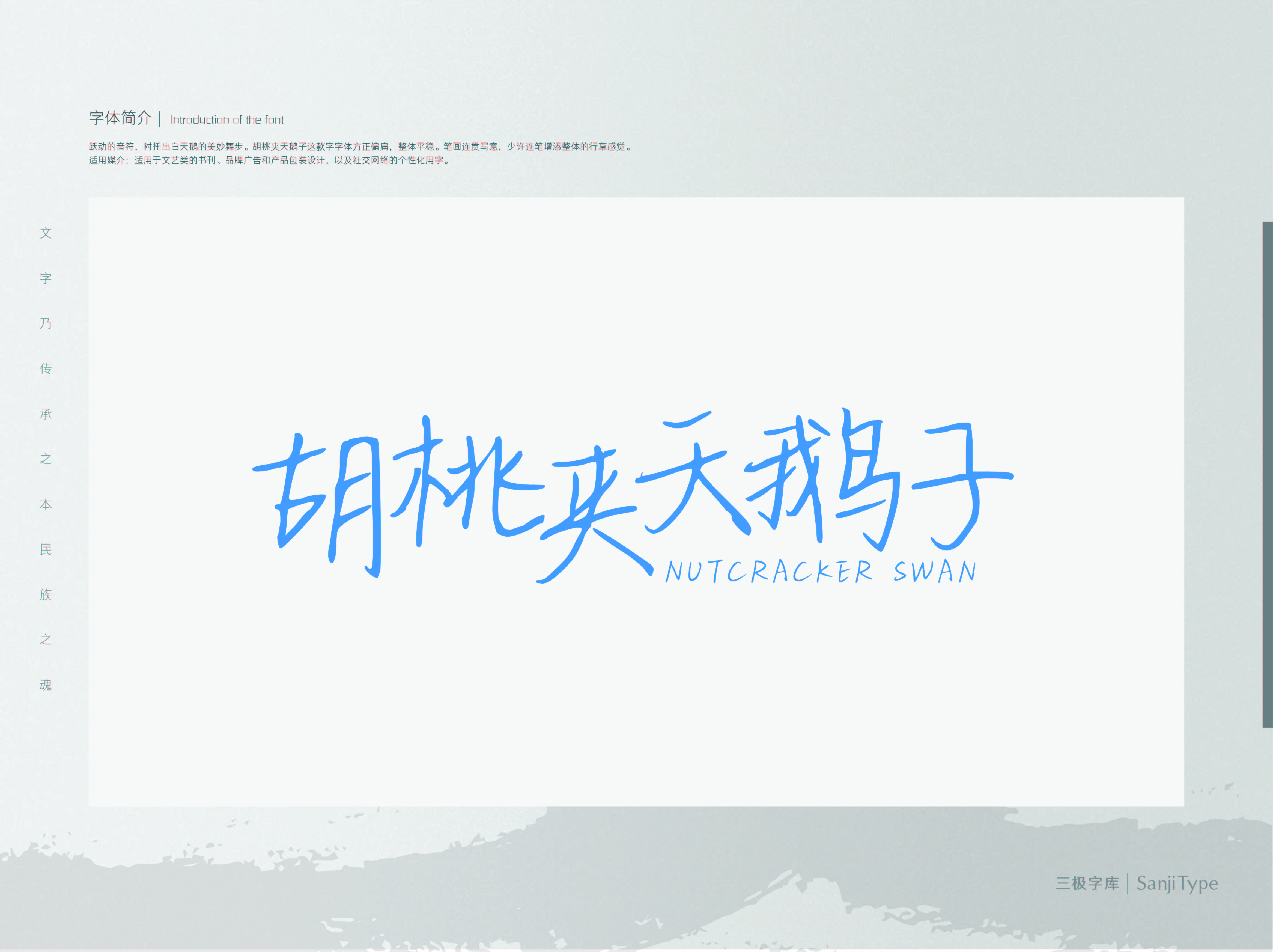 胡桃夹天鹅子这款字字体手写感强,编排时建议使得文字彼此间有位置偏差,更能挥发出字体本身的洒脱随性。适用于文艺类的书刊、品牌广告和产品包装设计,以及社交网络的个性化用字