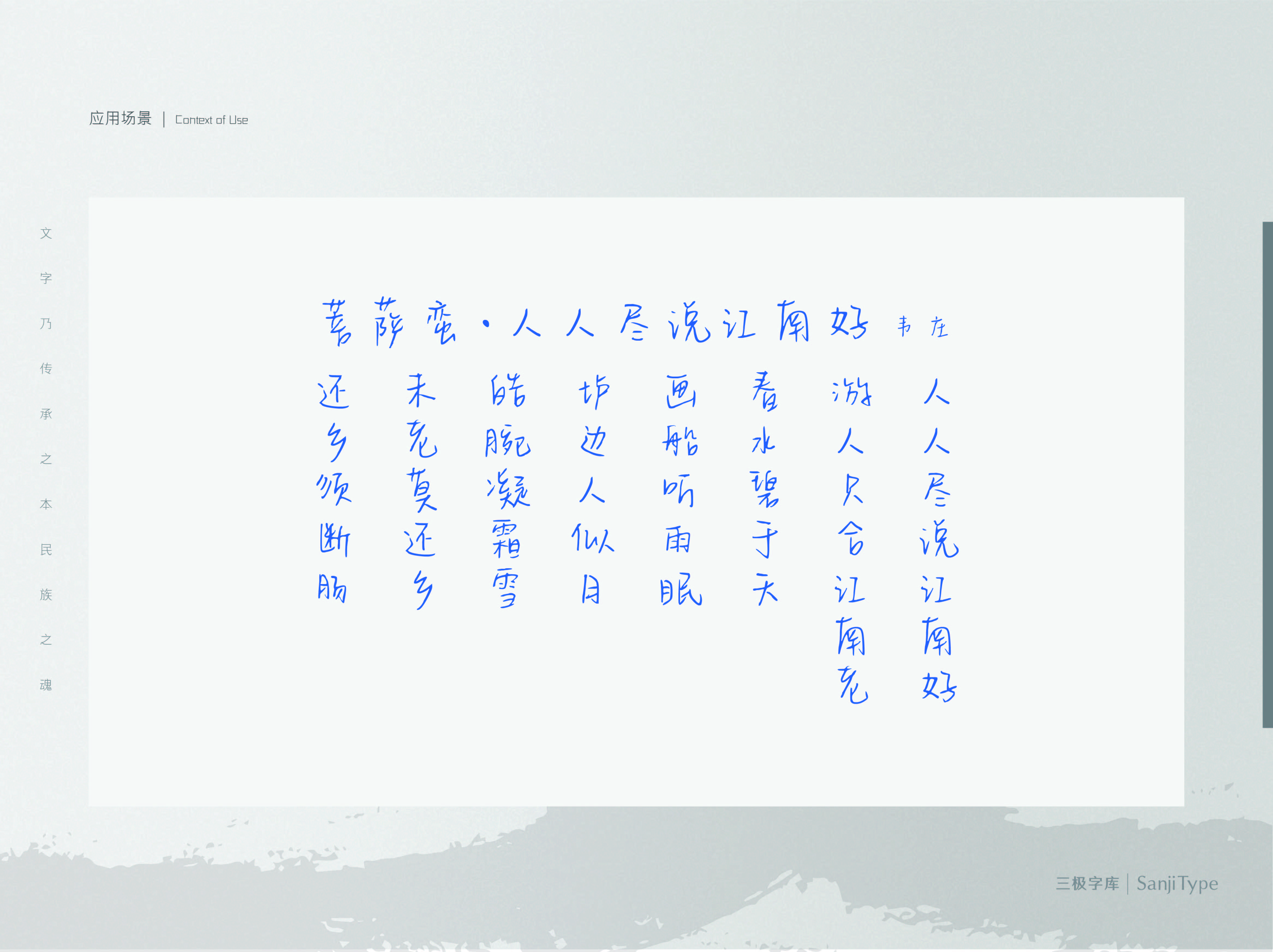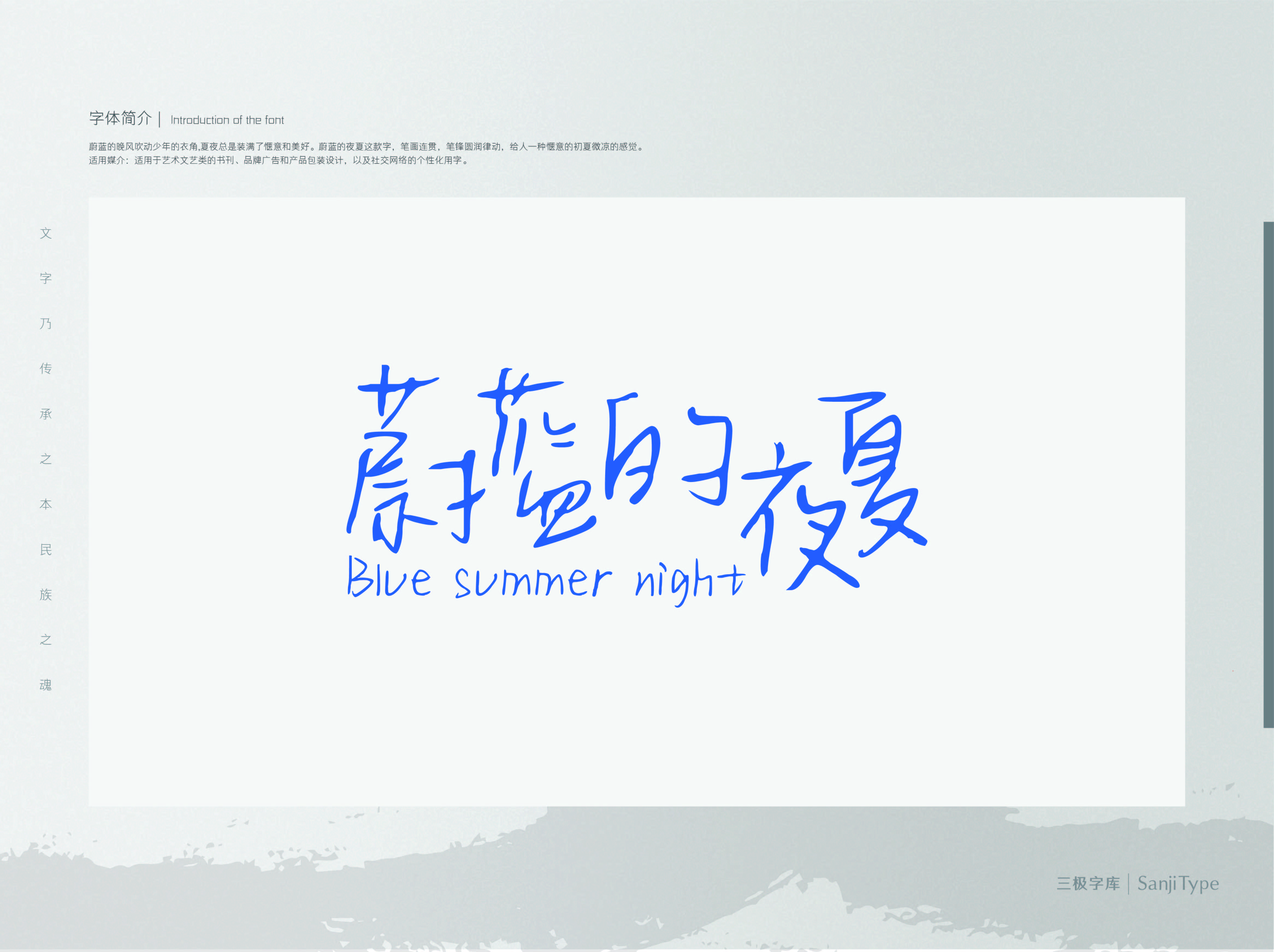 蔚蓝的夜夏这款字,笔画连贯,笔锋圆润律动,给人一种惬意的初夏微凉的感觉。适用于艺术文艺类的书刊、品牌广告和产品包装设计,以及社交网络的个性化用字。