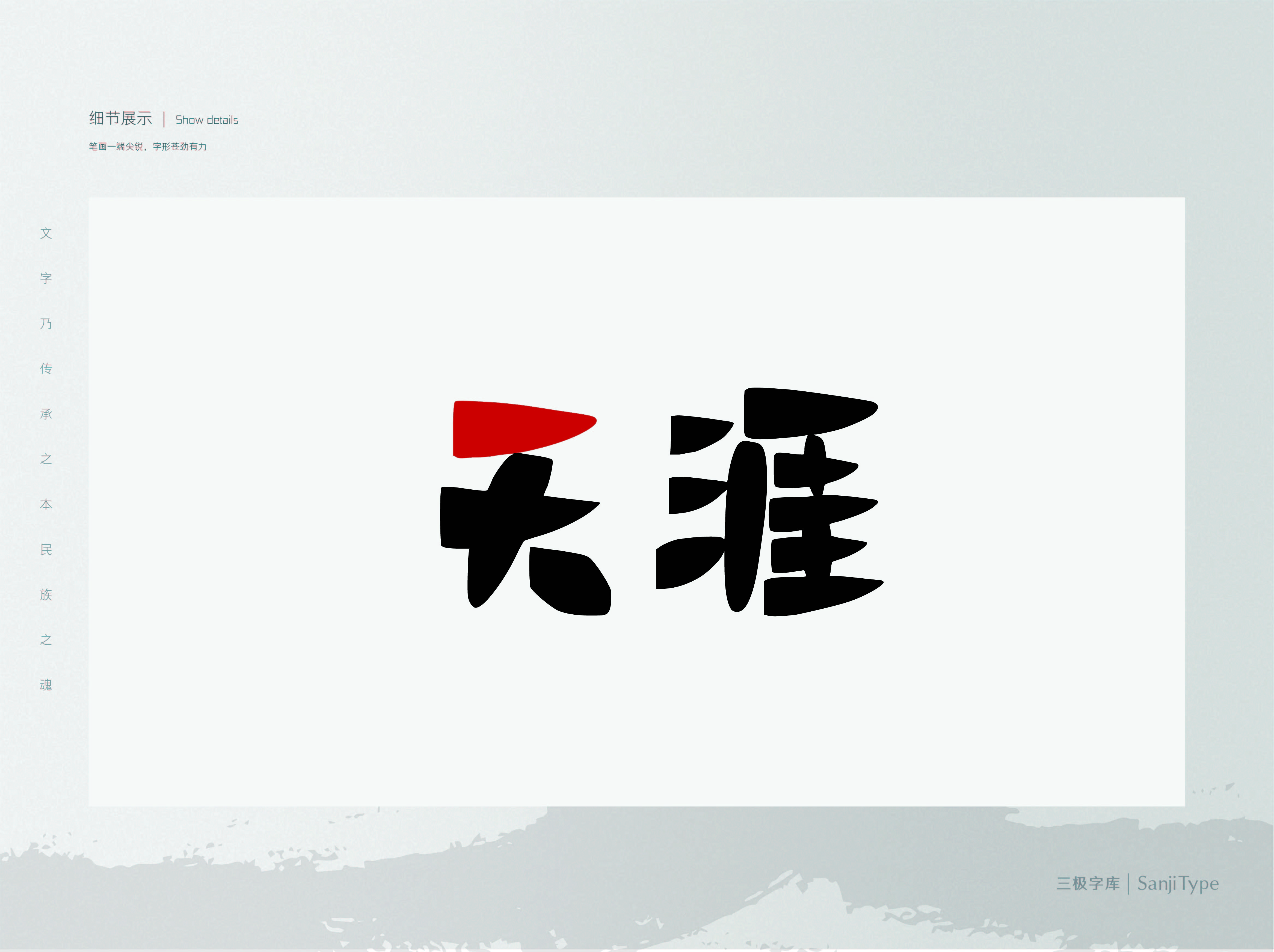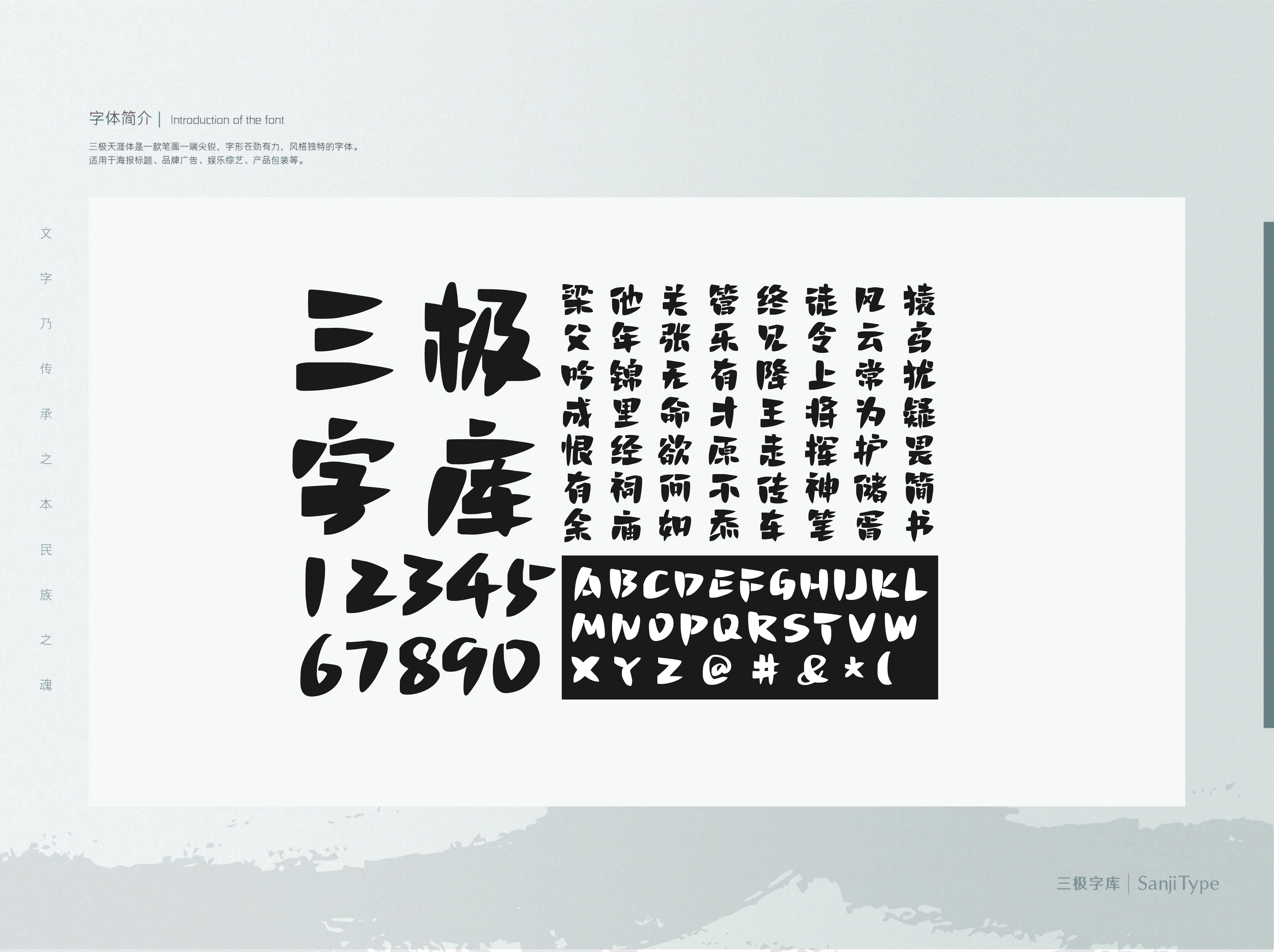 三极天涯体是一款字形有趣,风格可爱独特的字体。笔画造型一端较尖锐,呈三角形状。给人感觉板正中略带稚气,具有趣味性。适用于少年儿童类的书刊、品牌广告和产品包装设计,以及社交网络平台的封面标题用字。
