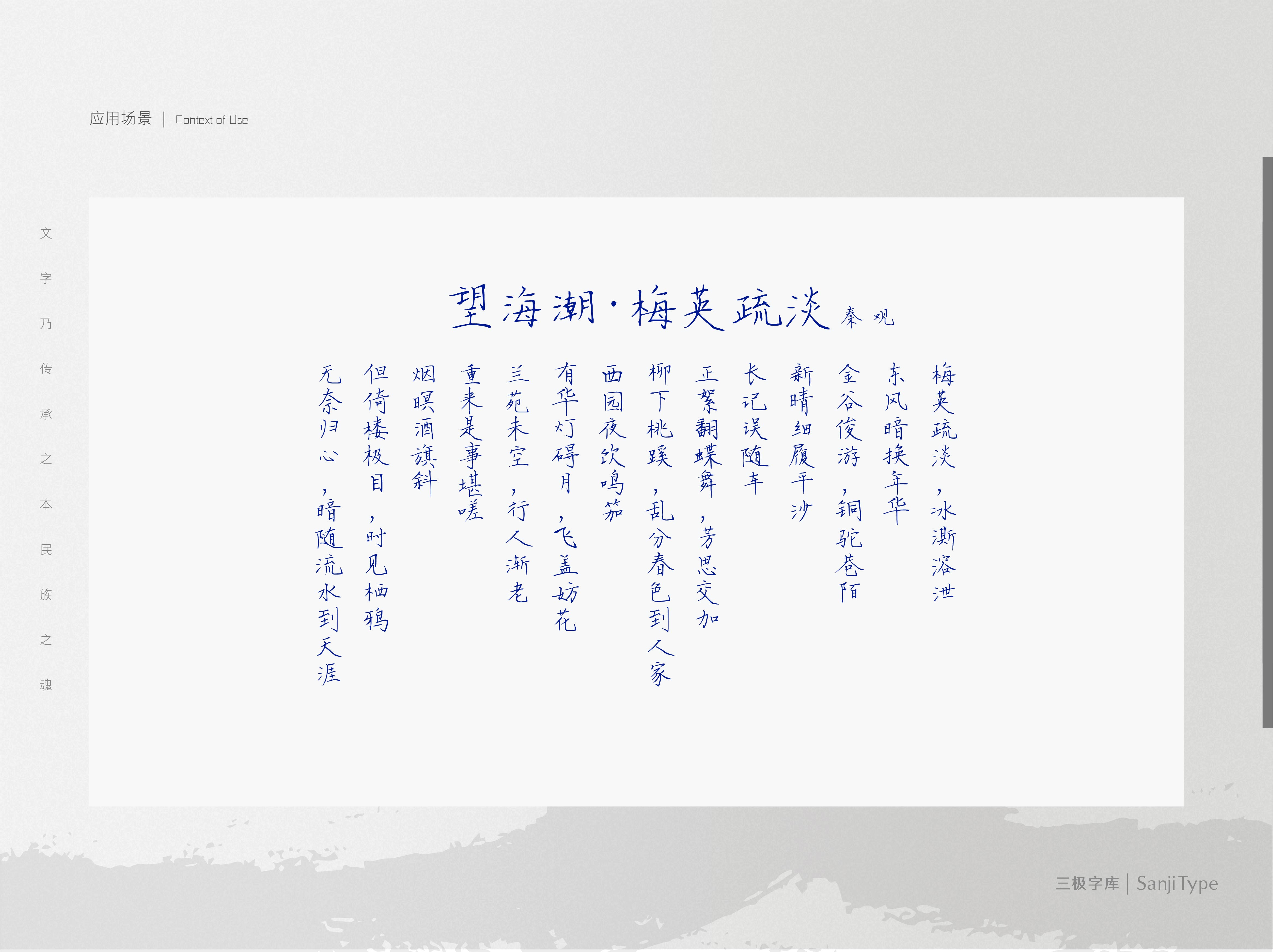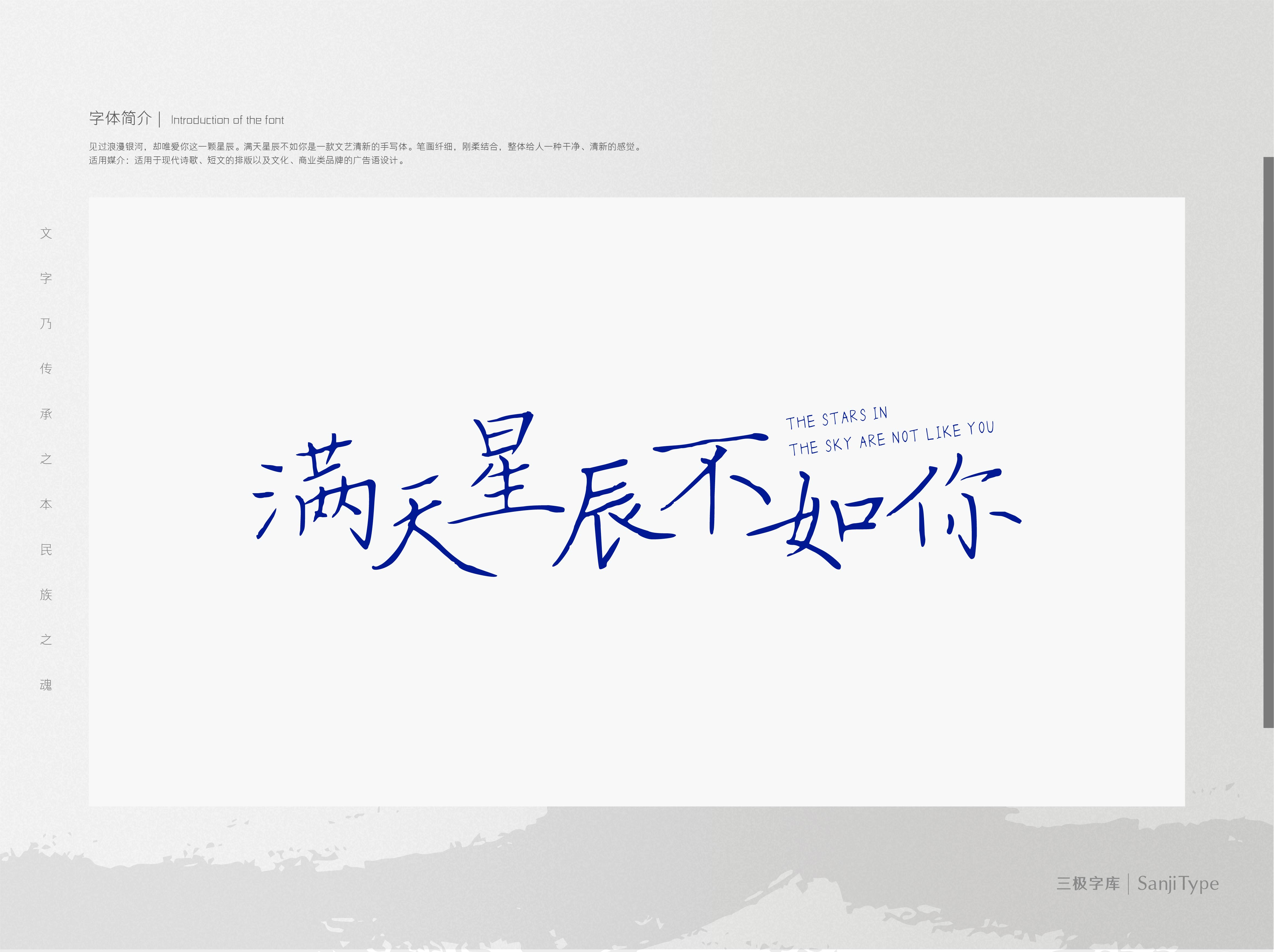 满天星辰不如你是一款精致利落的手写体。笔画纤细,竖勾有力,整体给人一种干净利落、清爽文艺的感觉。适用于秋冬季主题、现代诗歌短文的排版以及文化、商业类品牌的广告语设计。