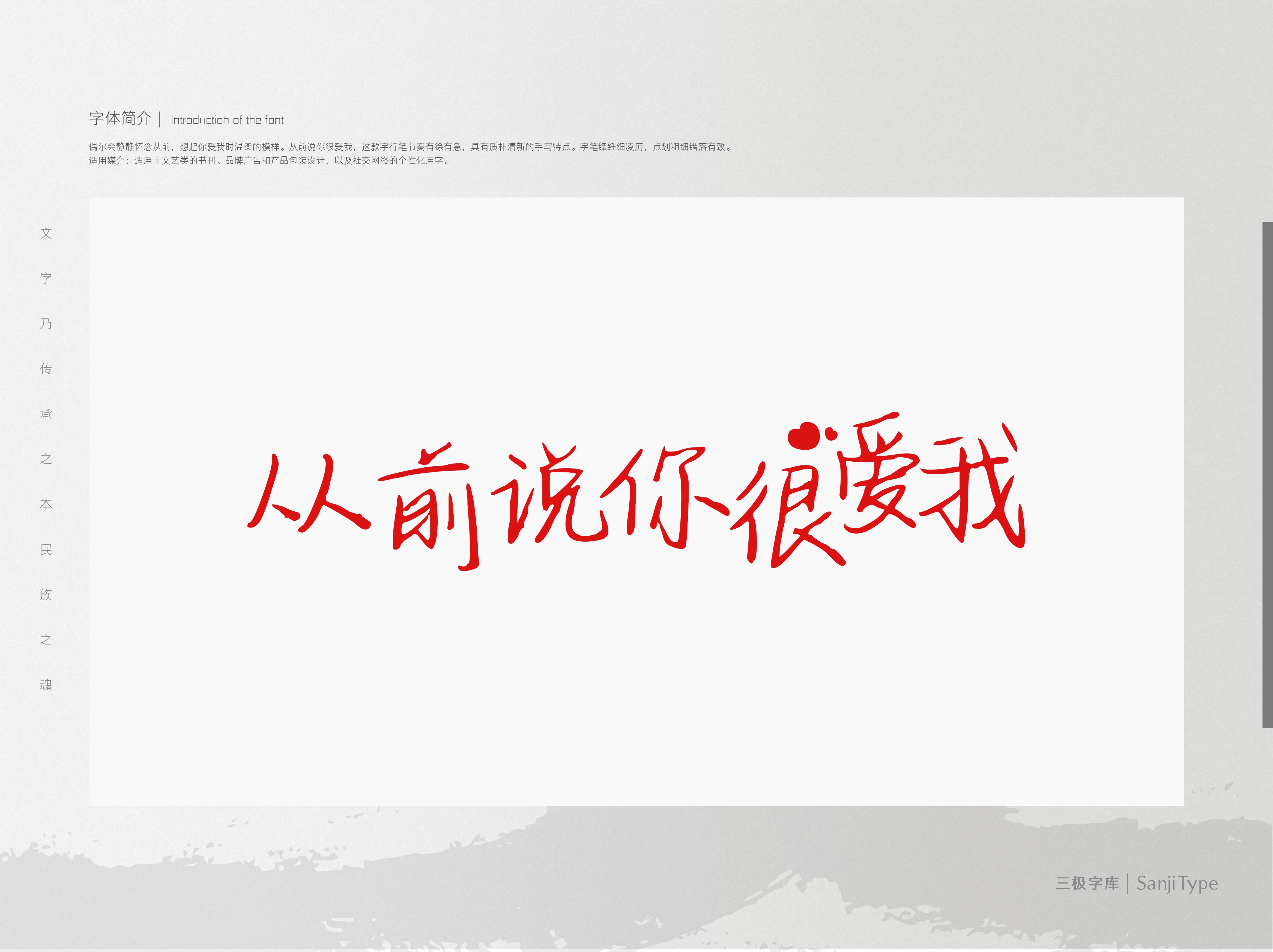 从前说你很爱我,这款字行笔节奏有徐有急,具有质朴清新的手写特点。笔锋纤细凌厉,点划粗细错落有致。适用于ins风照片排版、美妆服饰设计等具有格调的排版场景。