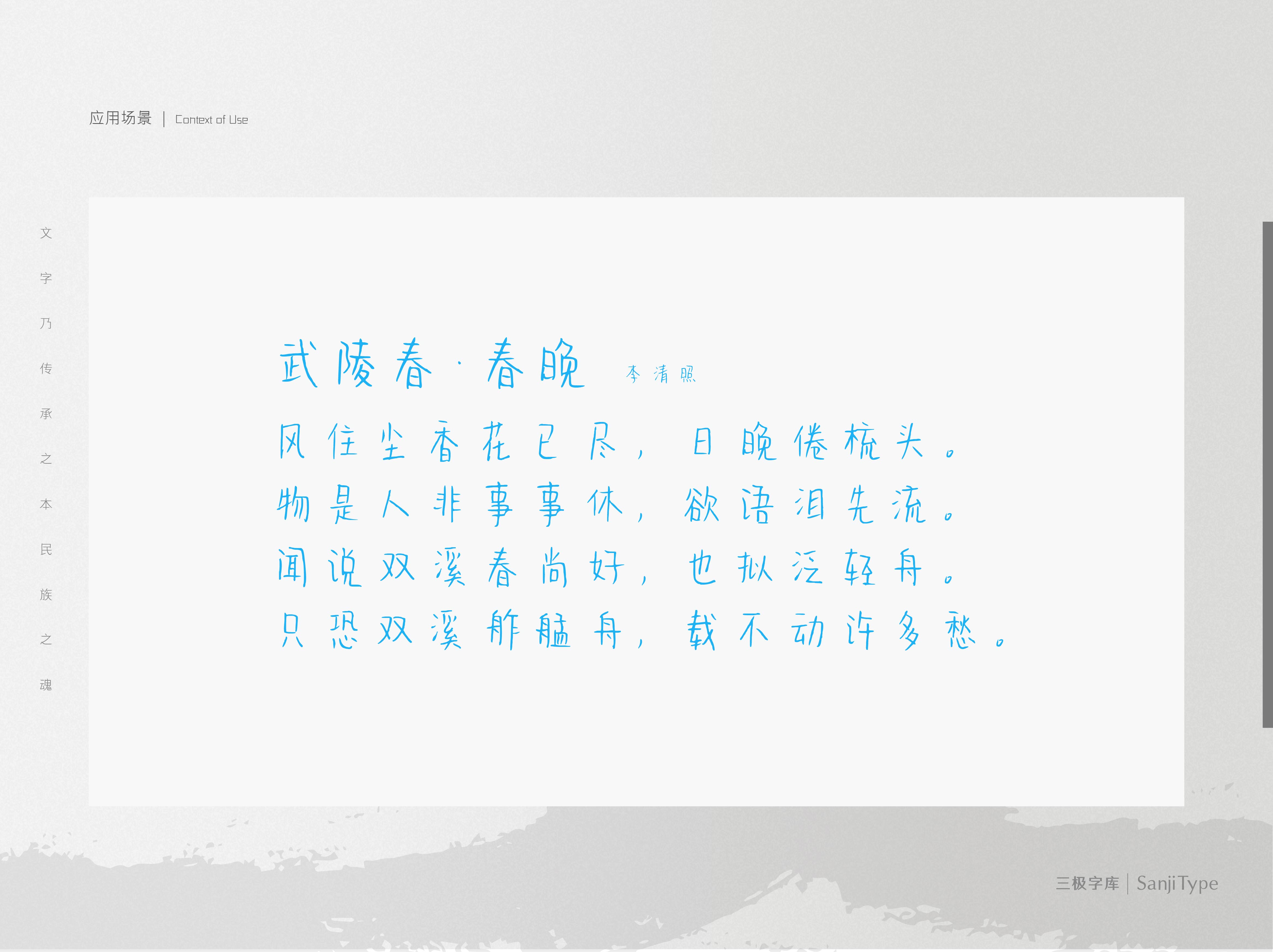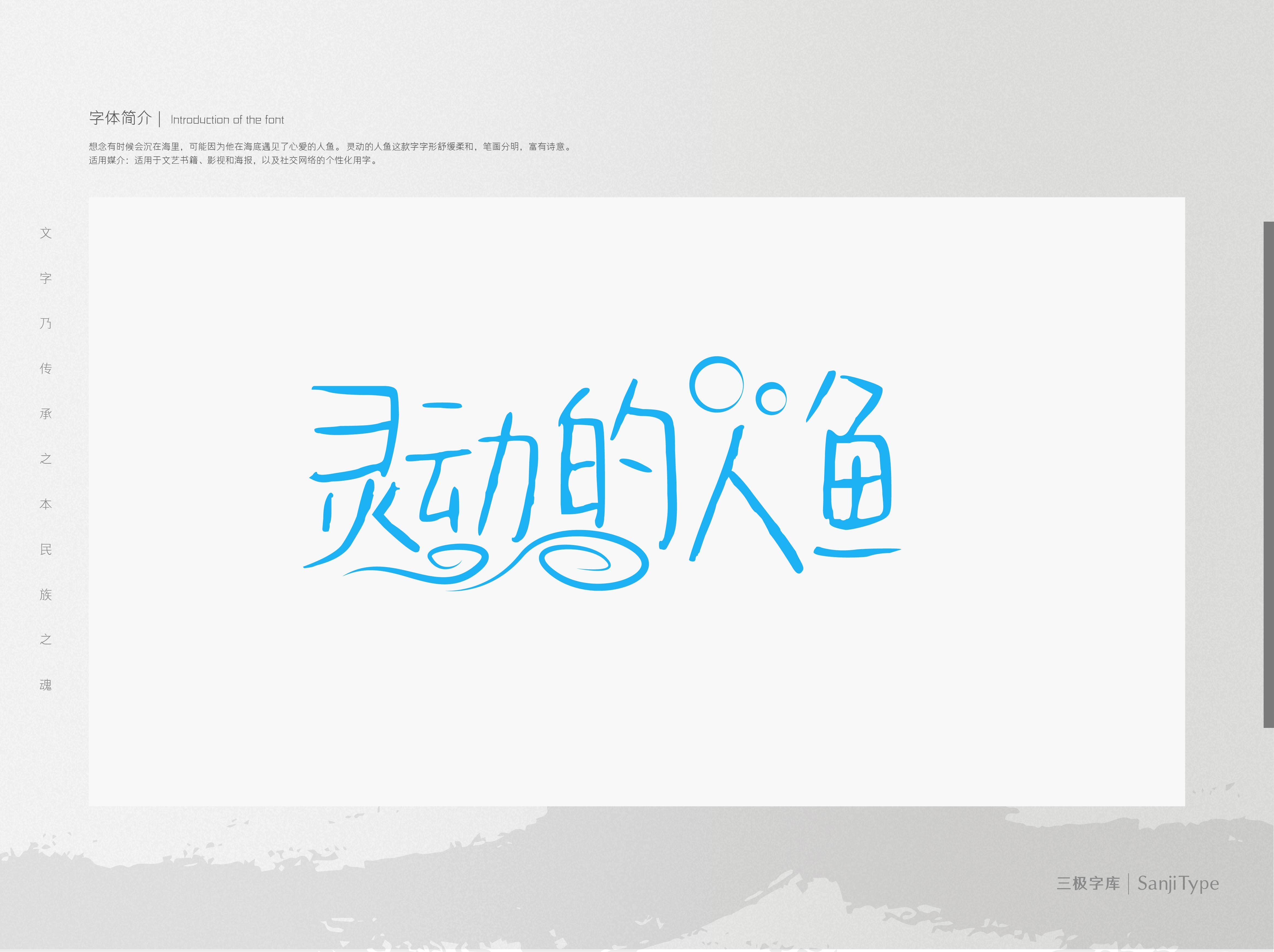 灵动的人鱼这款字笔画偏细,字形修长。重心偏下,转折角度较硬,整体带有一种折线感,体现出些许笨拙的手写韵味。