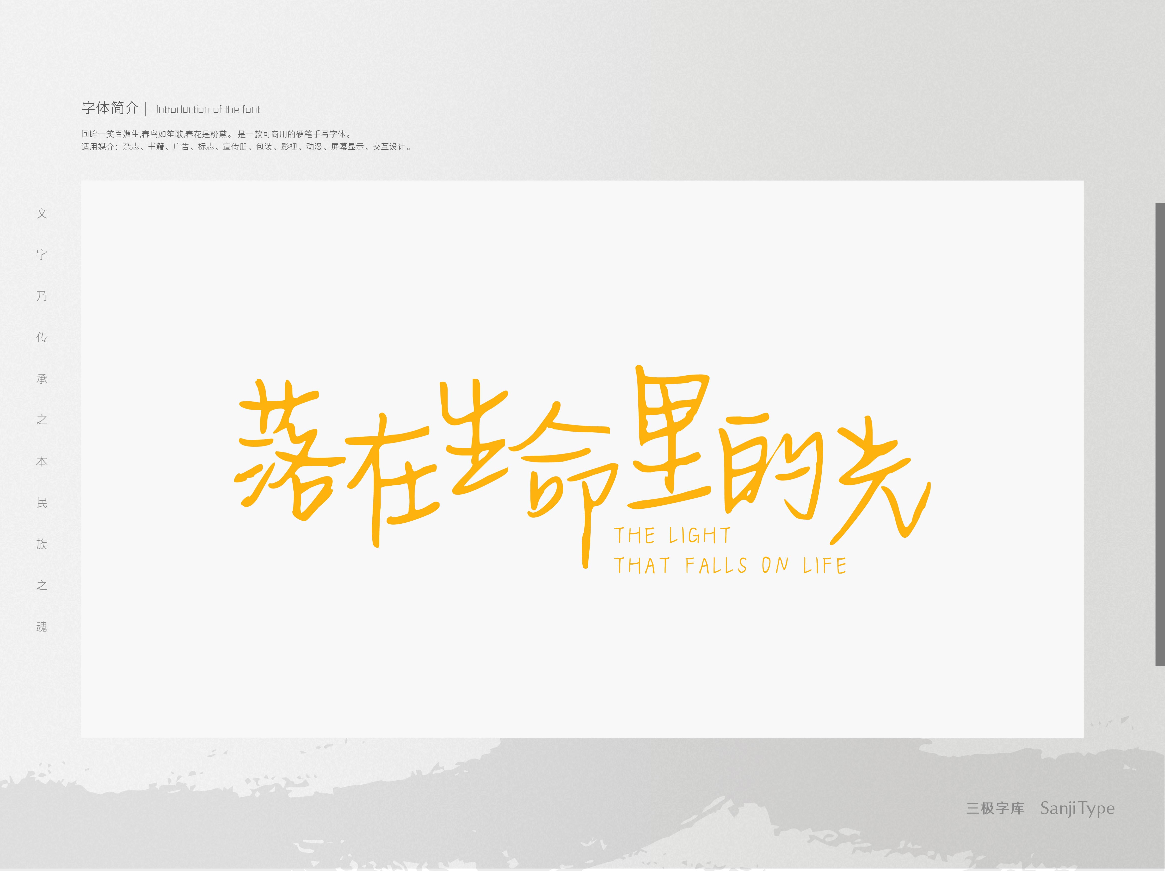 落在生命里的光是一款朝气蓬勃、极具生命力的手写字体。笔画顺畅自然,中宫较紧,具有人文气息。适用于节日赞歌、颂扬精神等积极向上的内容场景排版。
