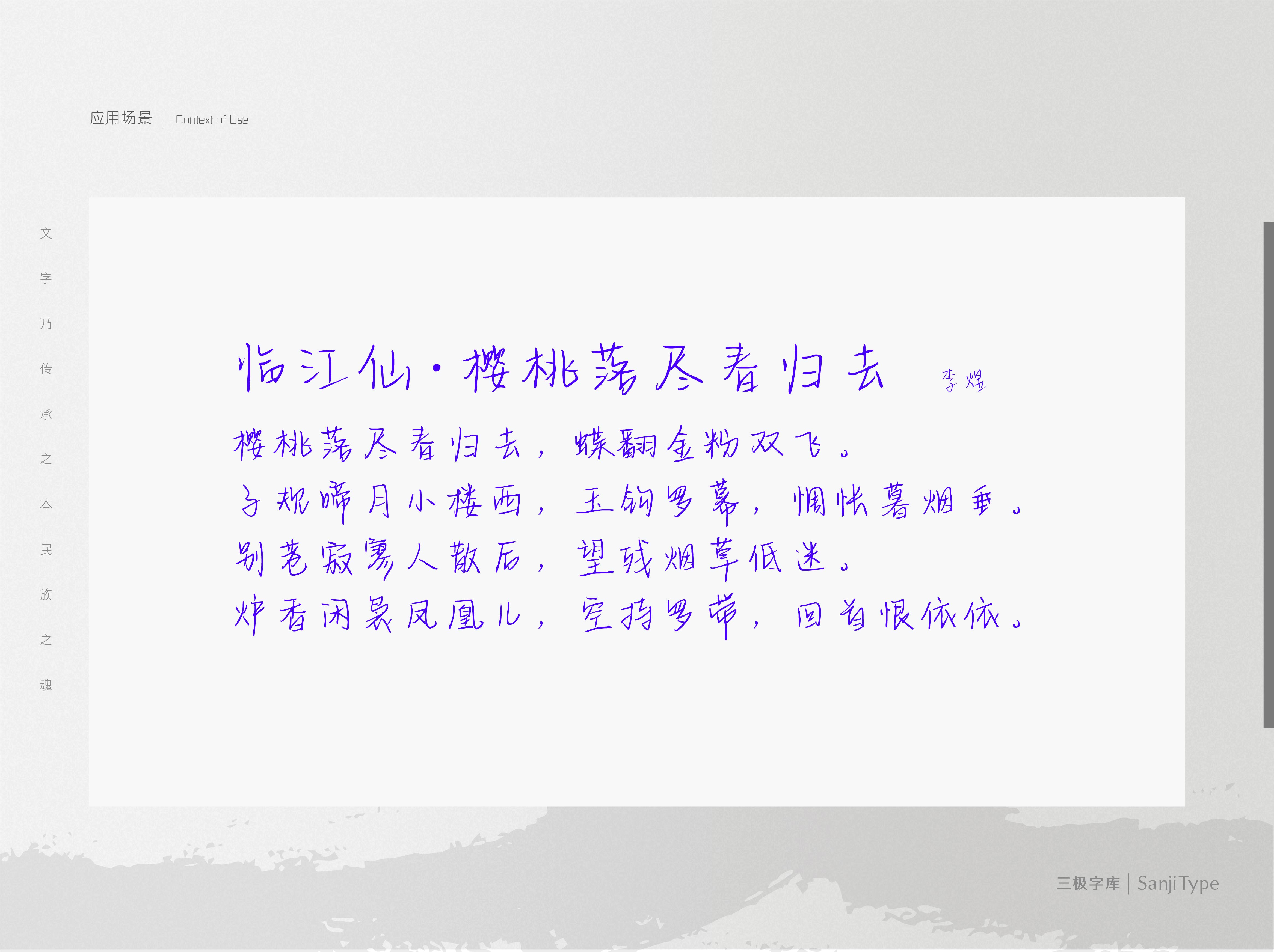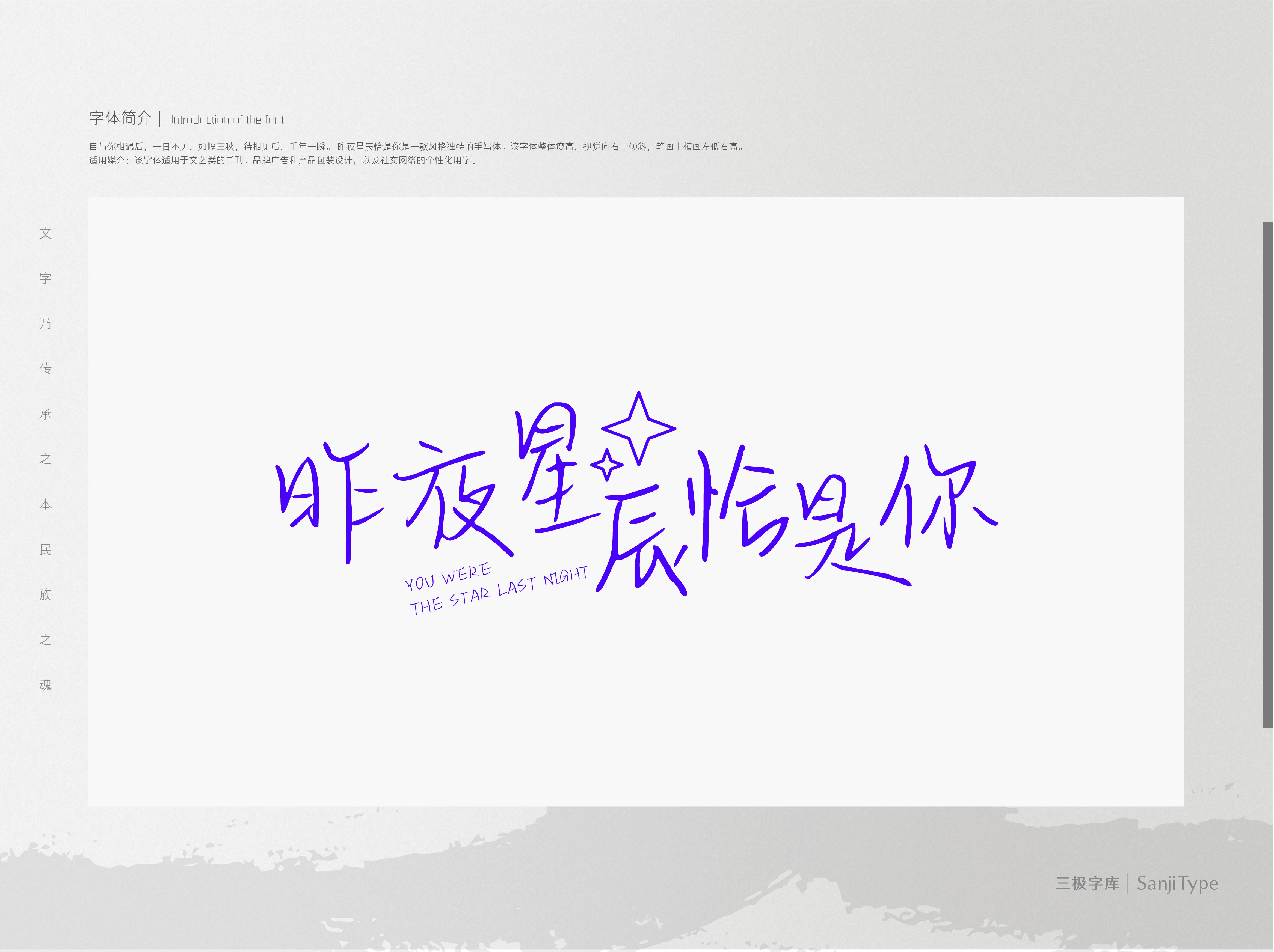 昨夜星辰恰是你是一款风格独特的手写体,整体瘦高,视觉向右上倾斜,多柔和转折。该字体适用于文艺书籍装帧、女性品牌广告和产品包装设计,以及社交网络的个性化用字。