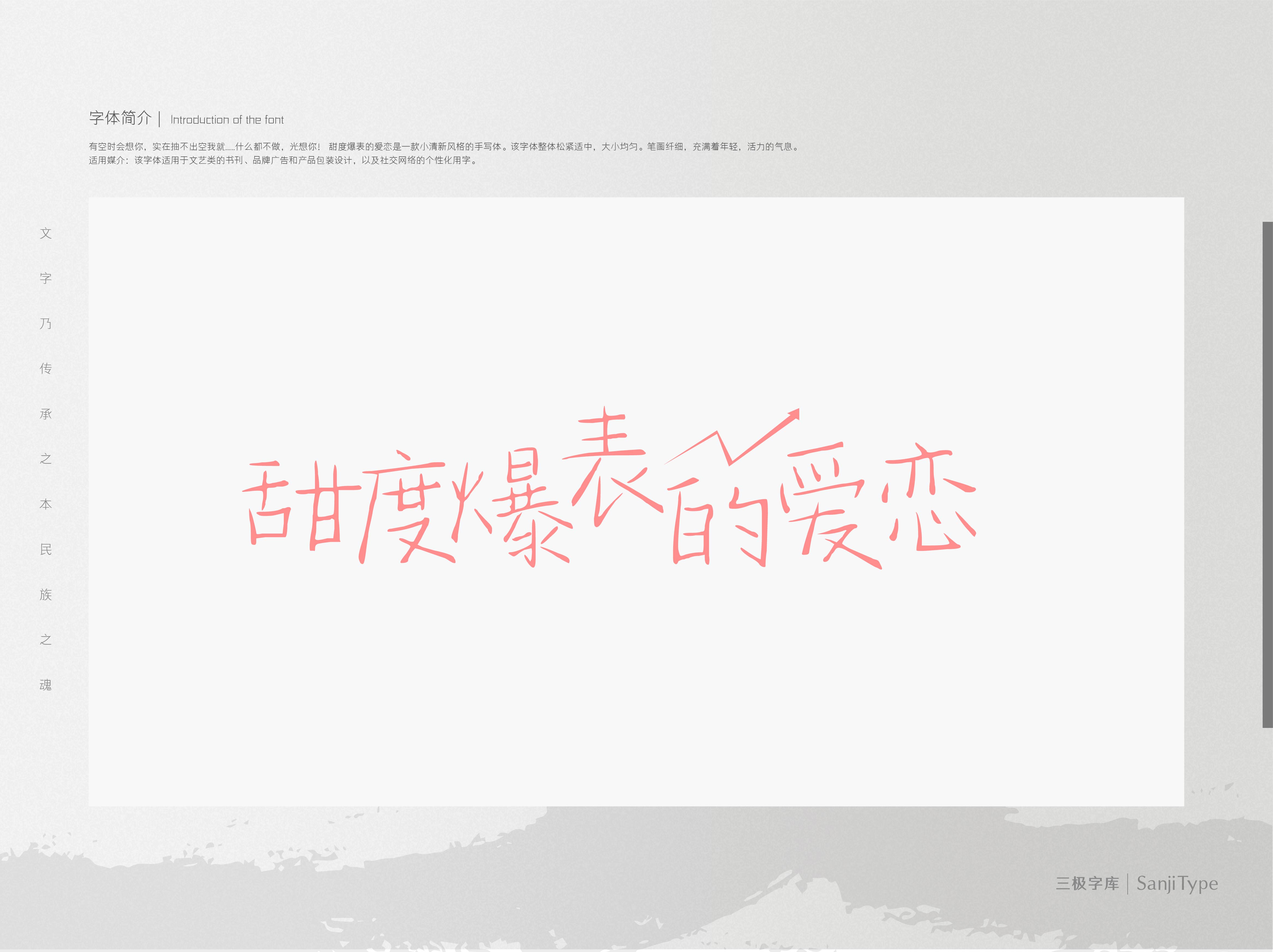 甜度爆表的爱恋是一款小清新风格的手写体。该字体笔画纤细,直线折线居多,充满着年轻,活力的气息。该字体适用于清新自然类的书刊、品牌广告和产品包装设计,以及社交网络的个性化用字。