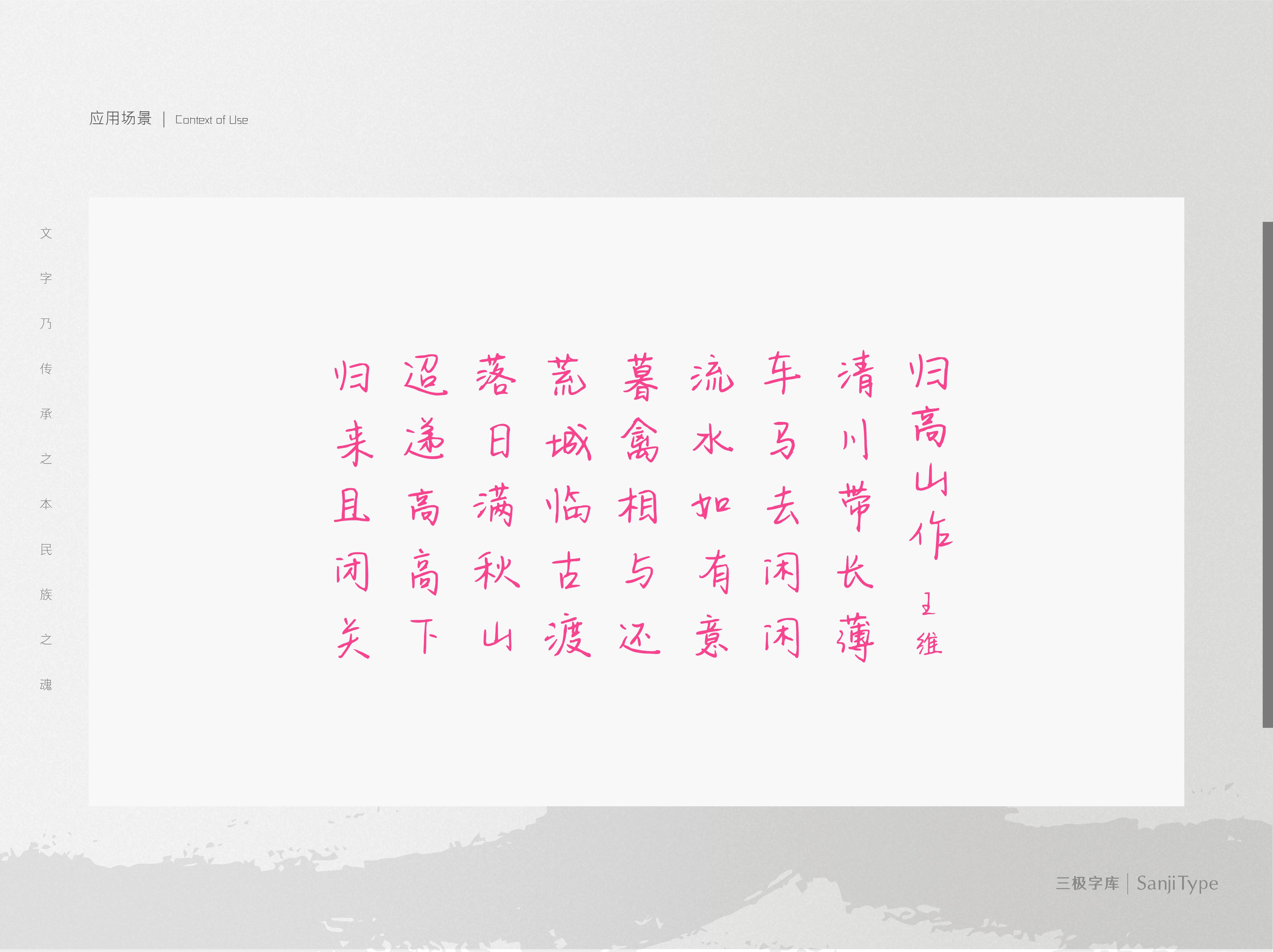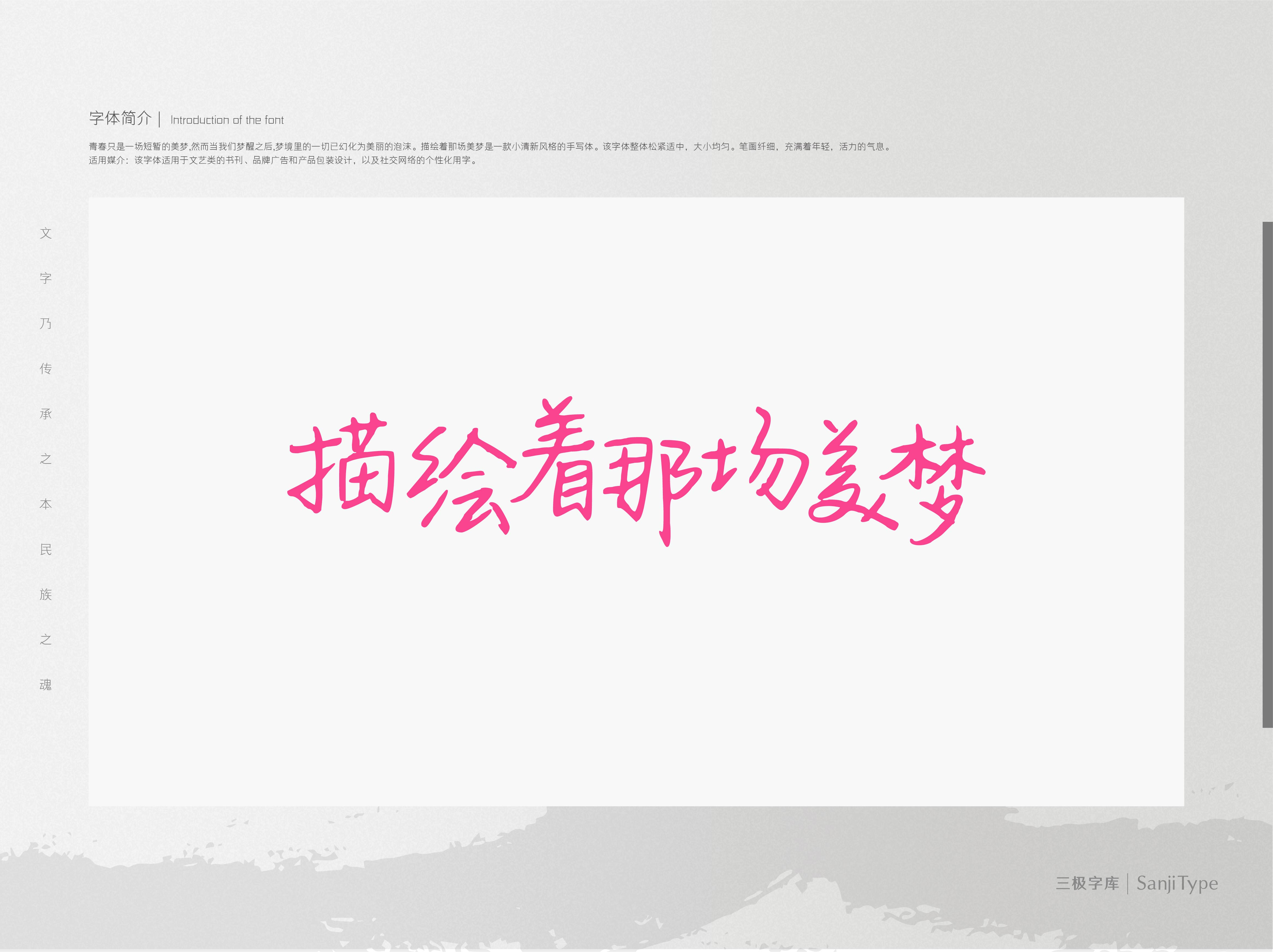 描绘着那场美梦是一款小清新风格的手写体。该字体整体松紧适中,大小均匀。笔画纤细,充满着年轻,活力的气息。该字体适用于文艺类的书刊、品牌广告和产品包装设计,以及社交网络的个性化用字。